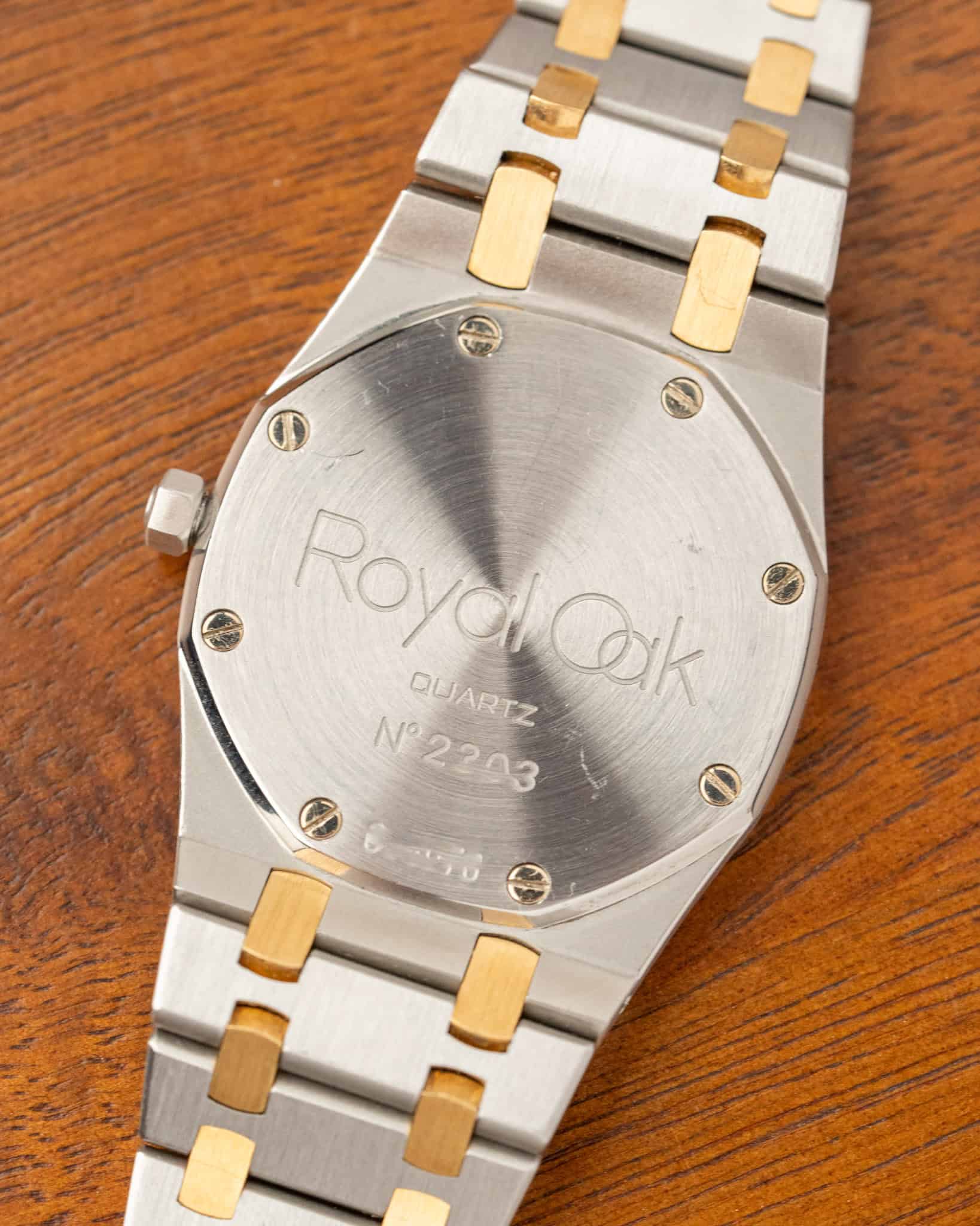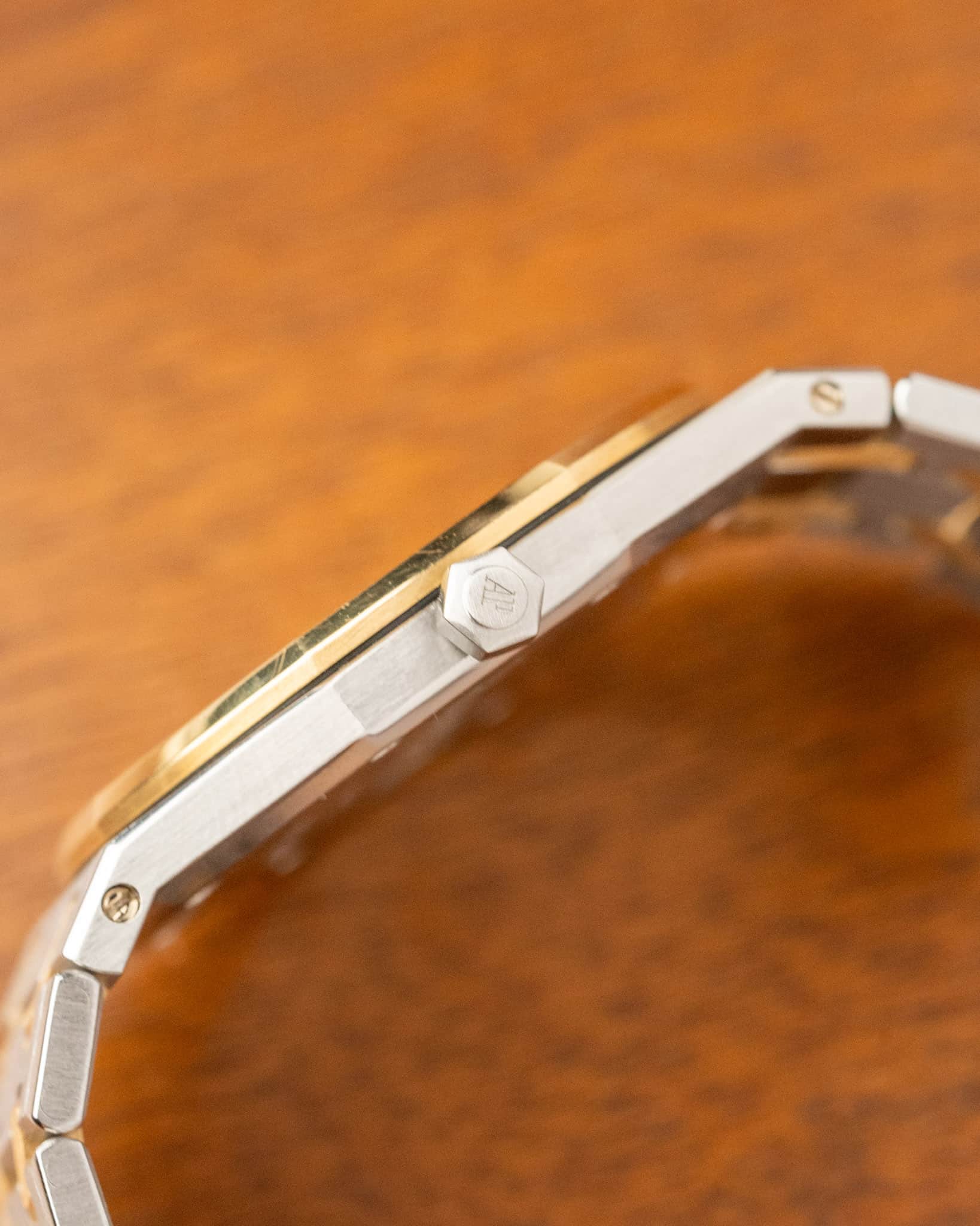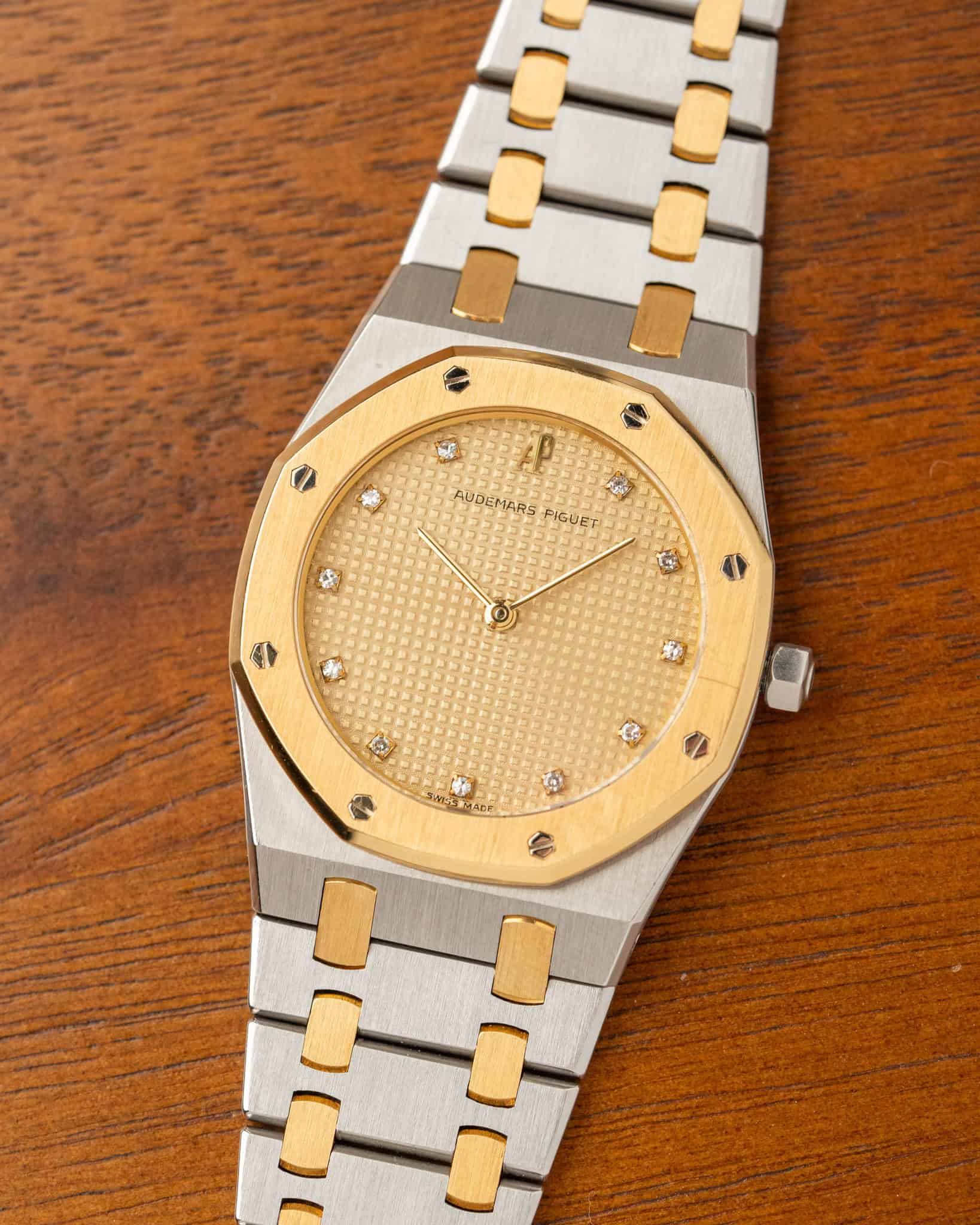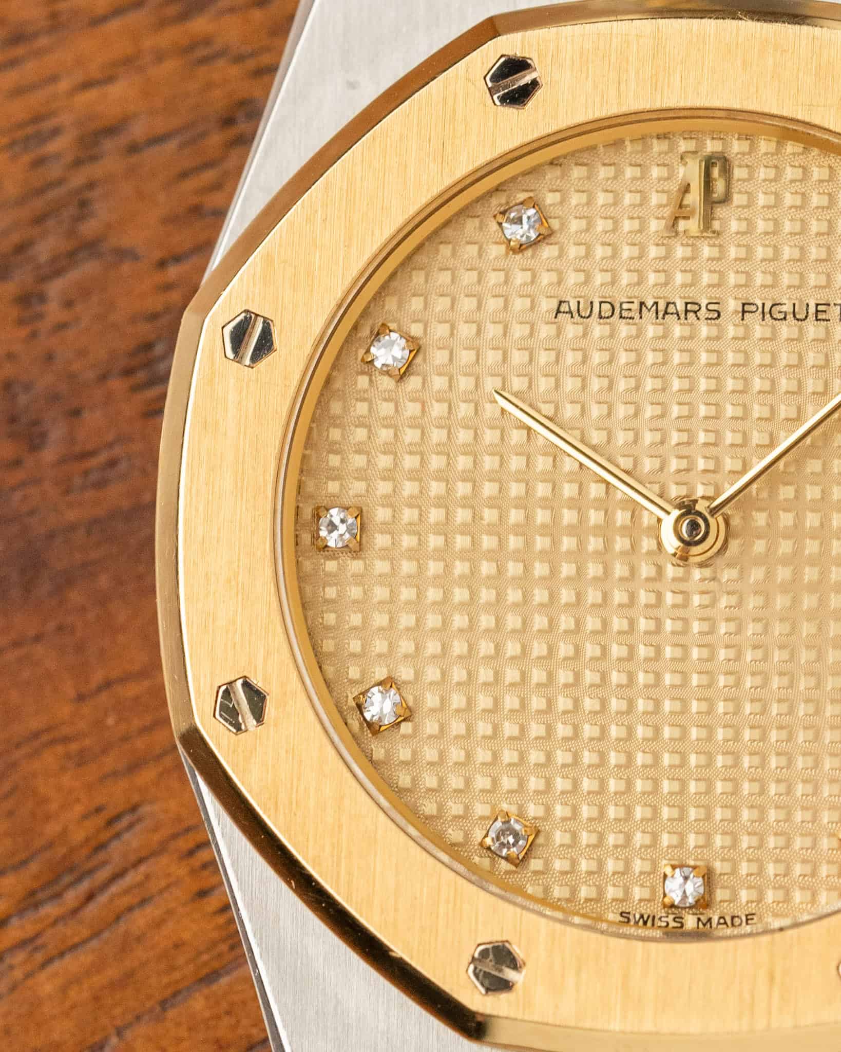 This Audemars Piguet Royal Oak in beautiful condition features a stunning champagne dial with applied diamond indices. The classic 33mm case offers a versatile presence, wearing closer to a modern 36mm size.