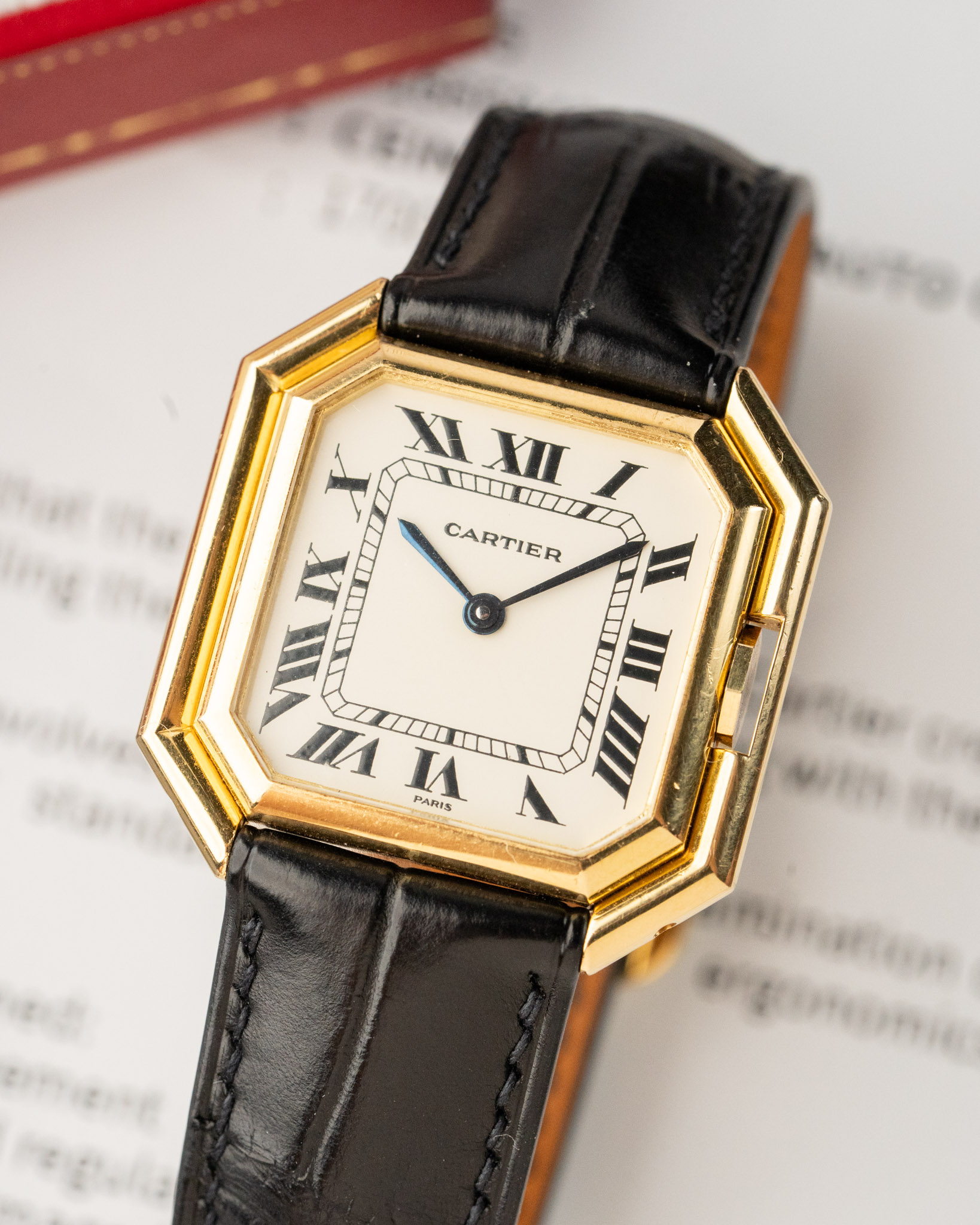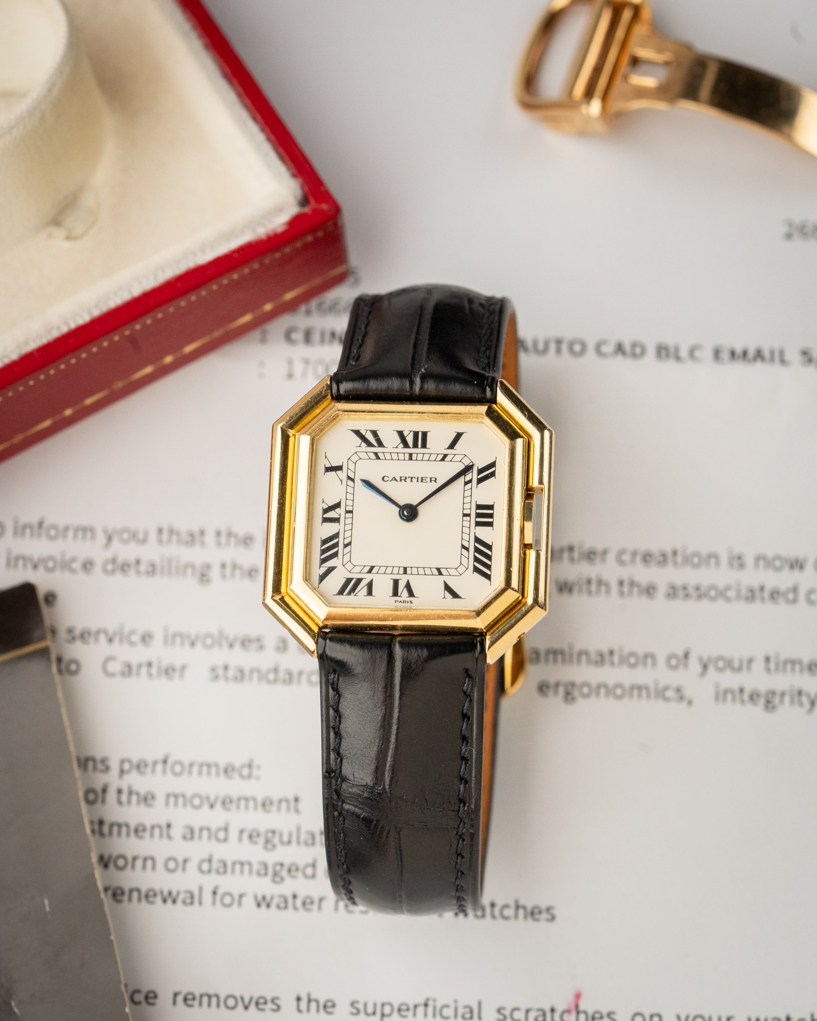 A 1970s Cartier Ceinture Jumbo Automatic in excellent vintage condition. This 31mm watch comes with Cartier service papers and its box, and its original solid gold clasp.