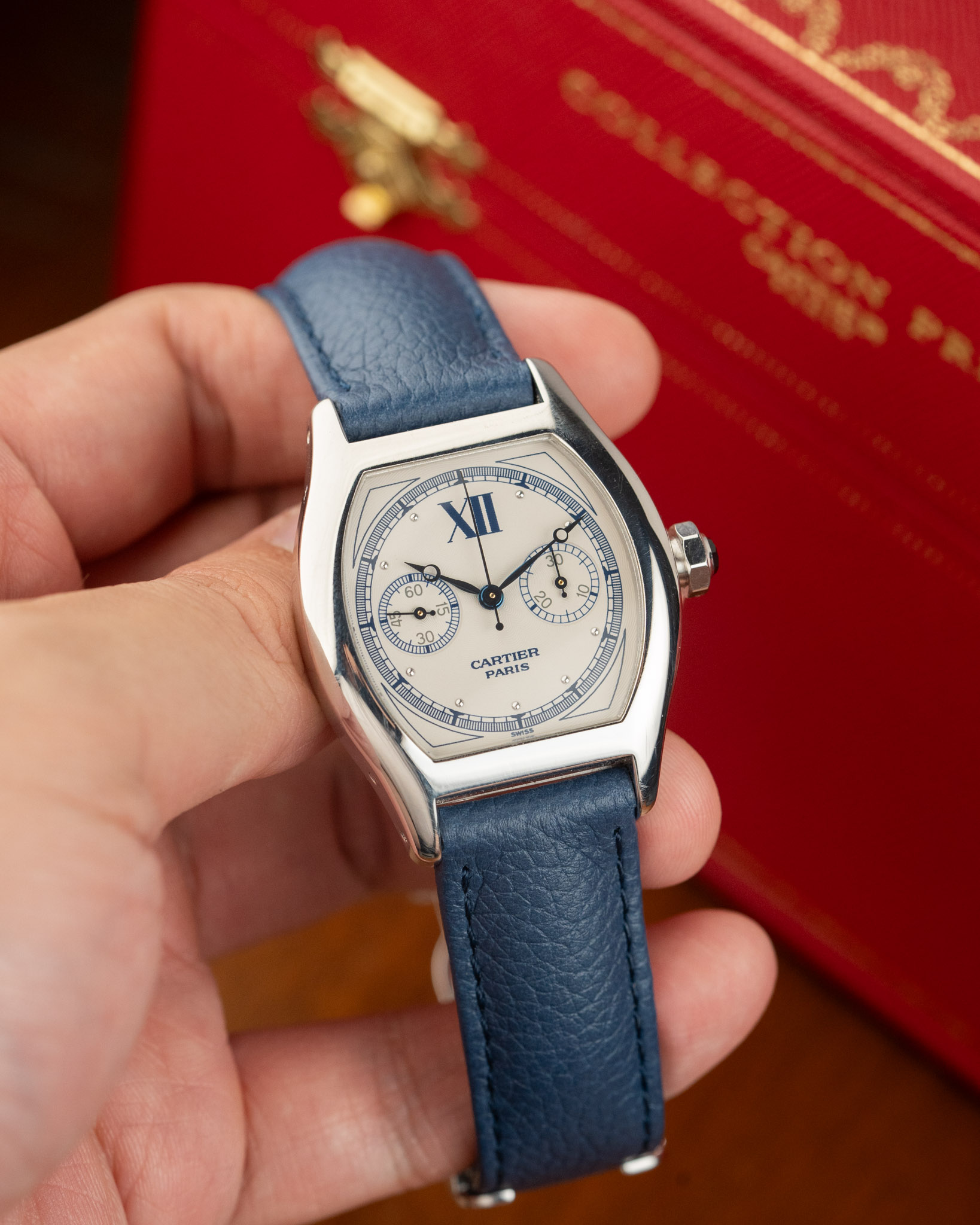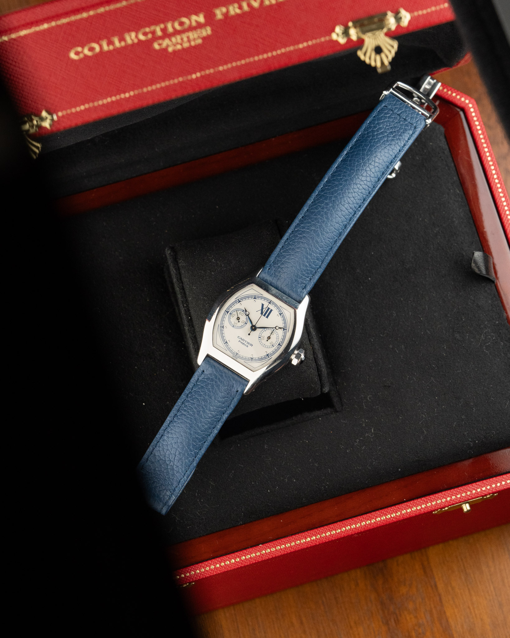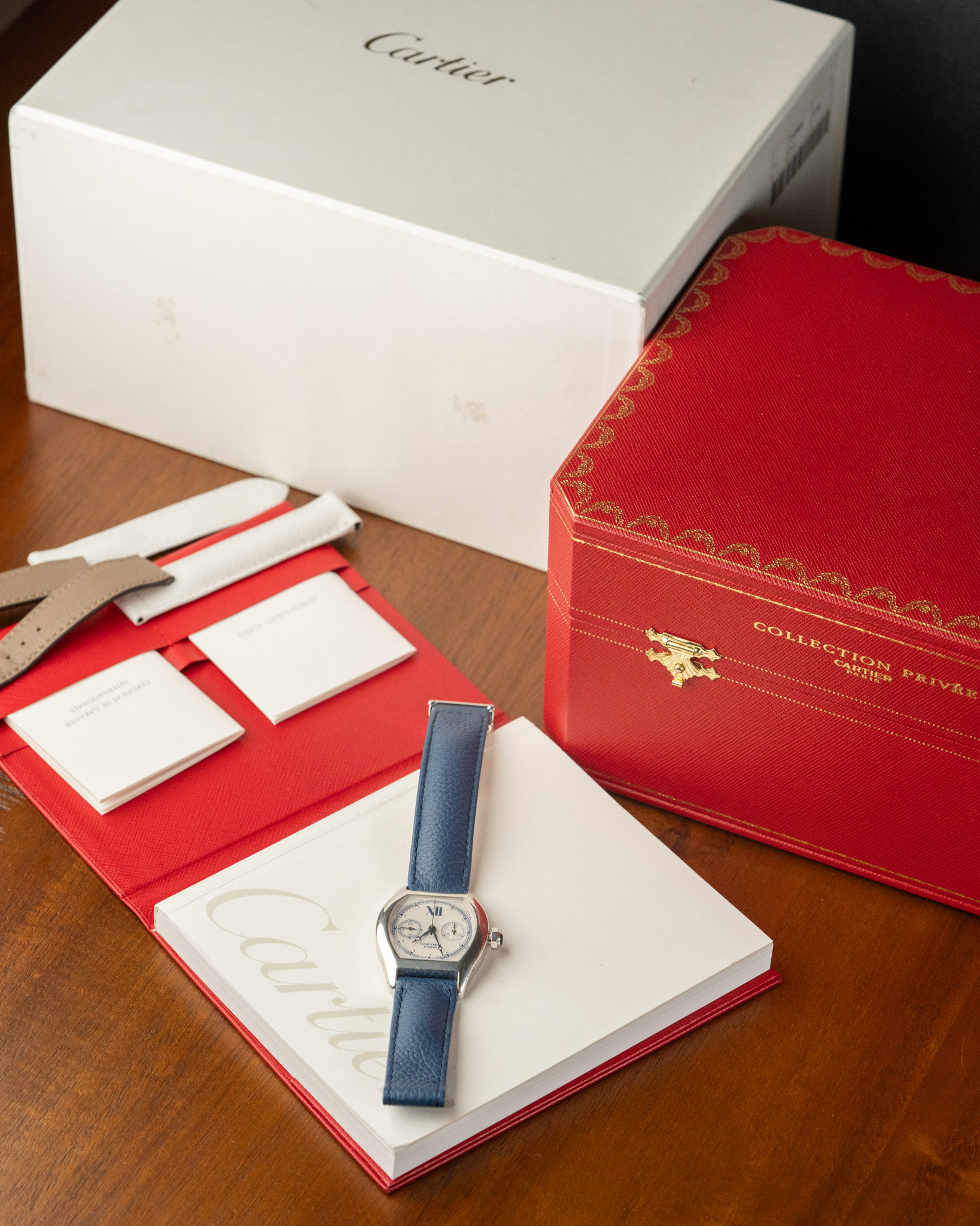 Hands down to me one of my all-time favourite CPCP releases, and to date, in my opinion, is the best variant of the monopusher, the Cartier CPCP Monopusher Chronograph. This manual wind watch is in excellent condition and is offered as a complete full set, which includes two additional spare straps and the original Collection Prive Inner and Outer box, with guarantees and booklets. The watch was checked and is running well with all functions of the monopusher in working order.