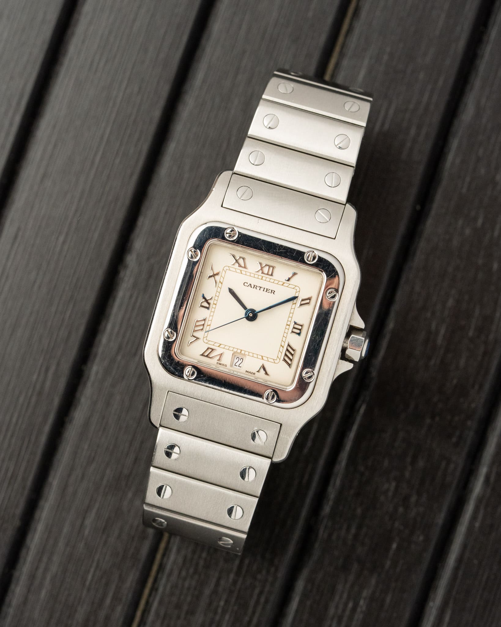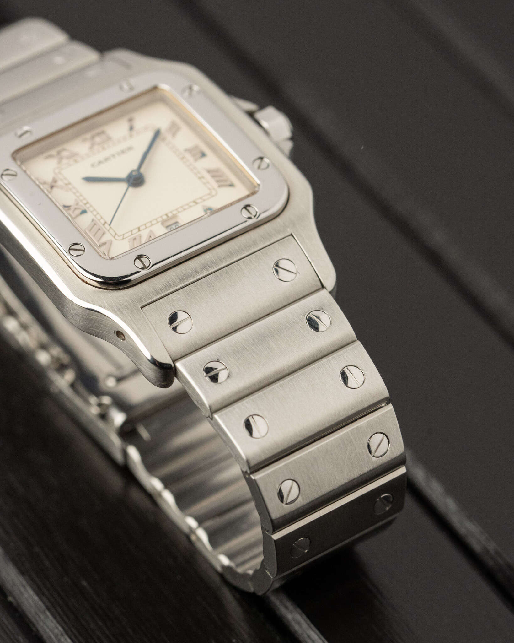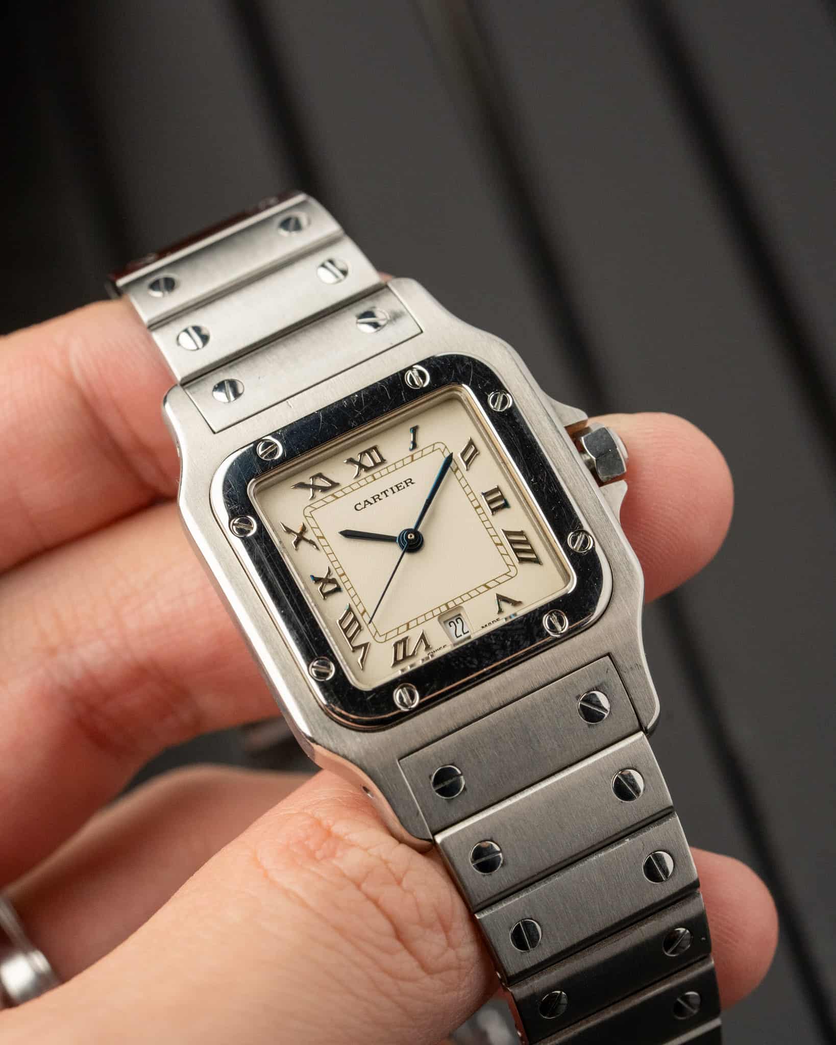 This Cartier Santos Galbée Large, reference 987901, is the 1990s execution of the iconic design, featuring a stainless steel case and bracelet with the model’s distinctive curved profile. The standout feature is the brilliant white dial with raised applied Roman numerals with some indices oxidised with a similar blue hue as the hands, an almost purposeful matching.