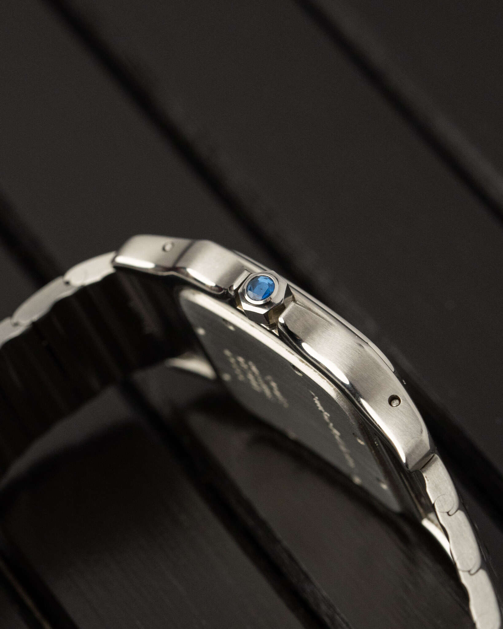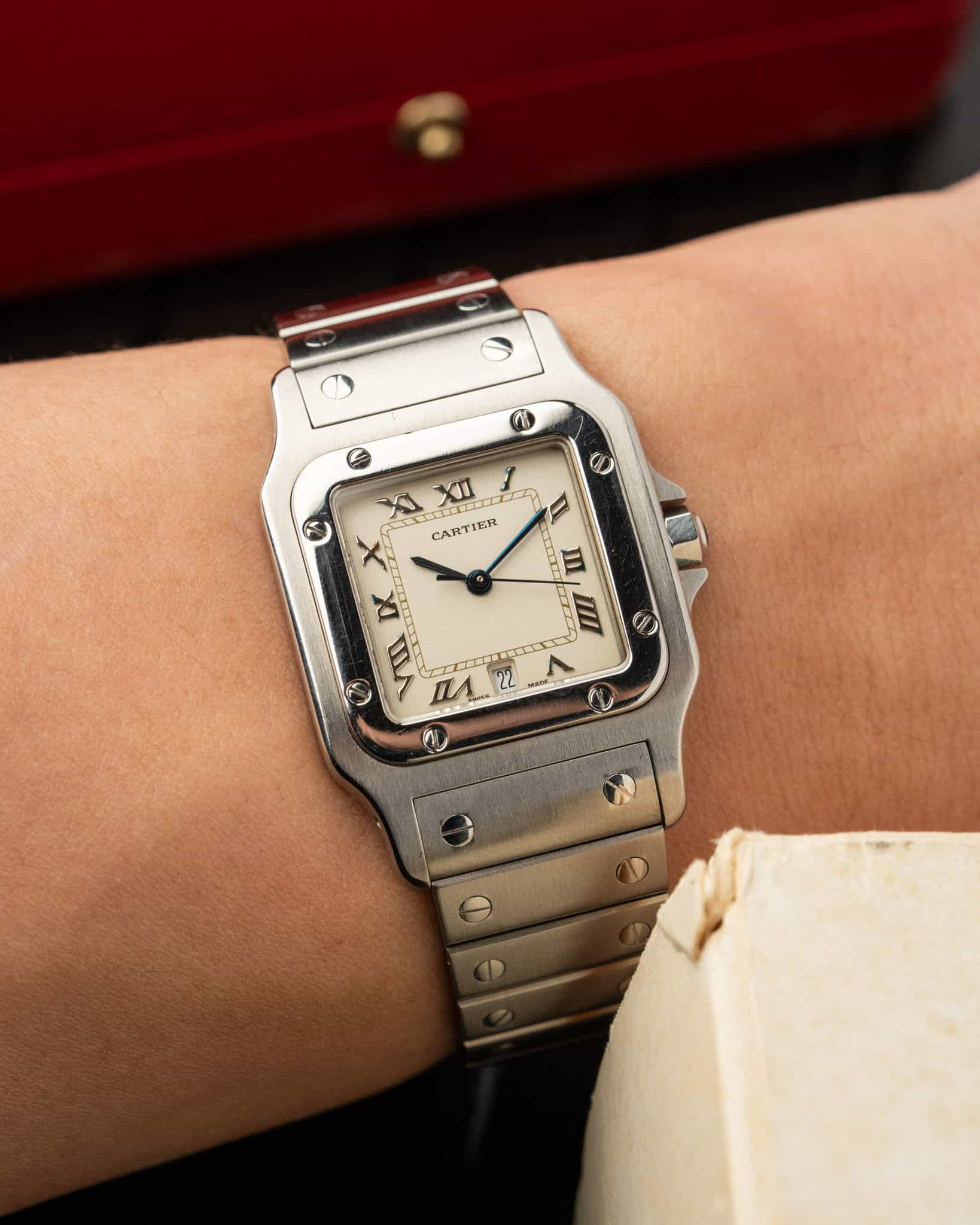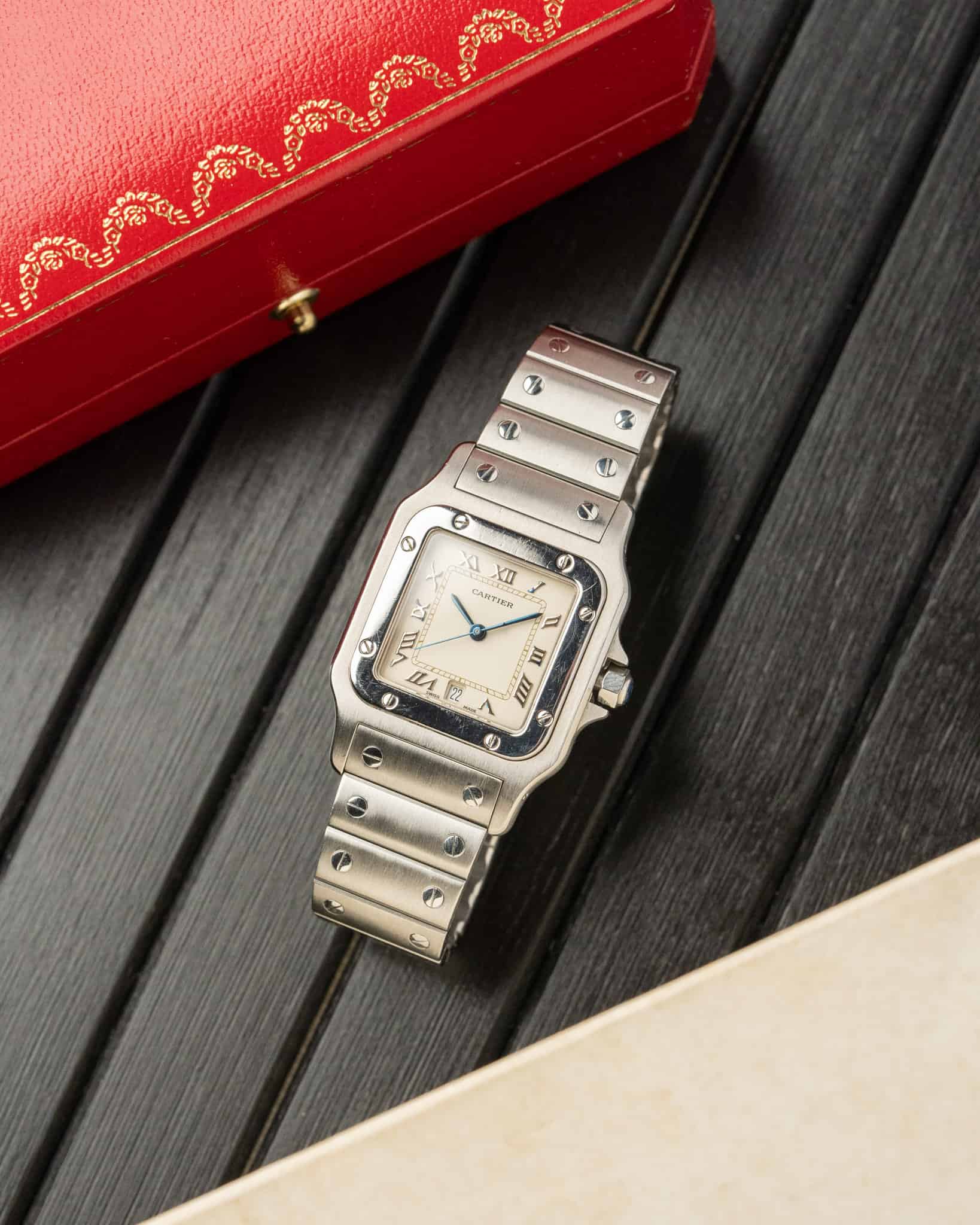 This Cartier Santos Galbée Large, reference 987901, is the 1990s execution of the iconic design, featuring a stainless steel case and bracelet with the model’s distinctive curved profile. The standout feature is the brilliant white dial with raised applied Roman numerals with some indices oxidised with a similar blue hue as the hands, an almost purposeful matching.