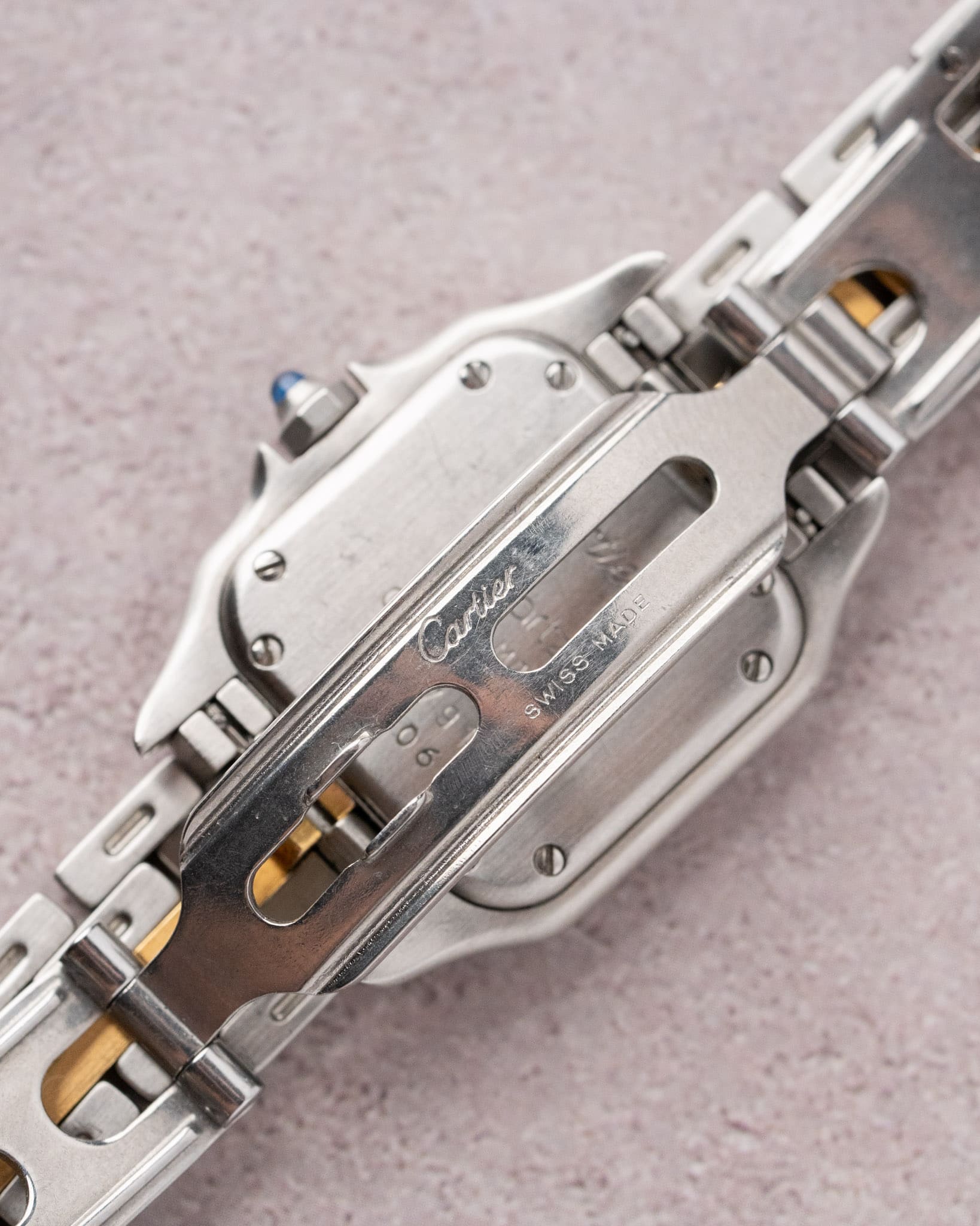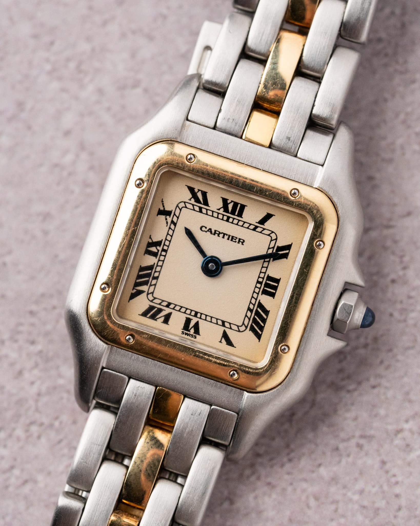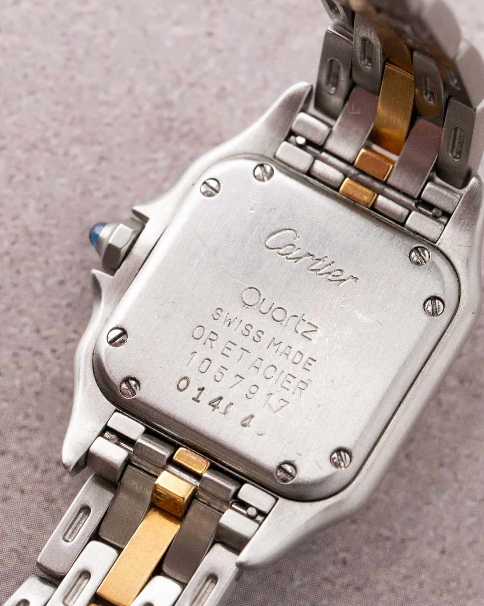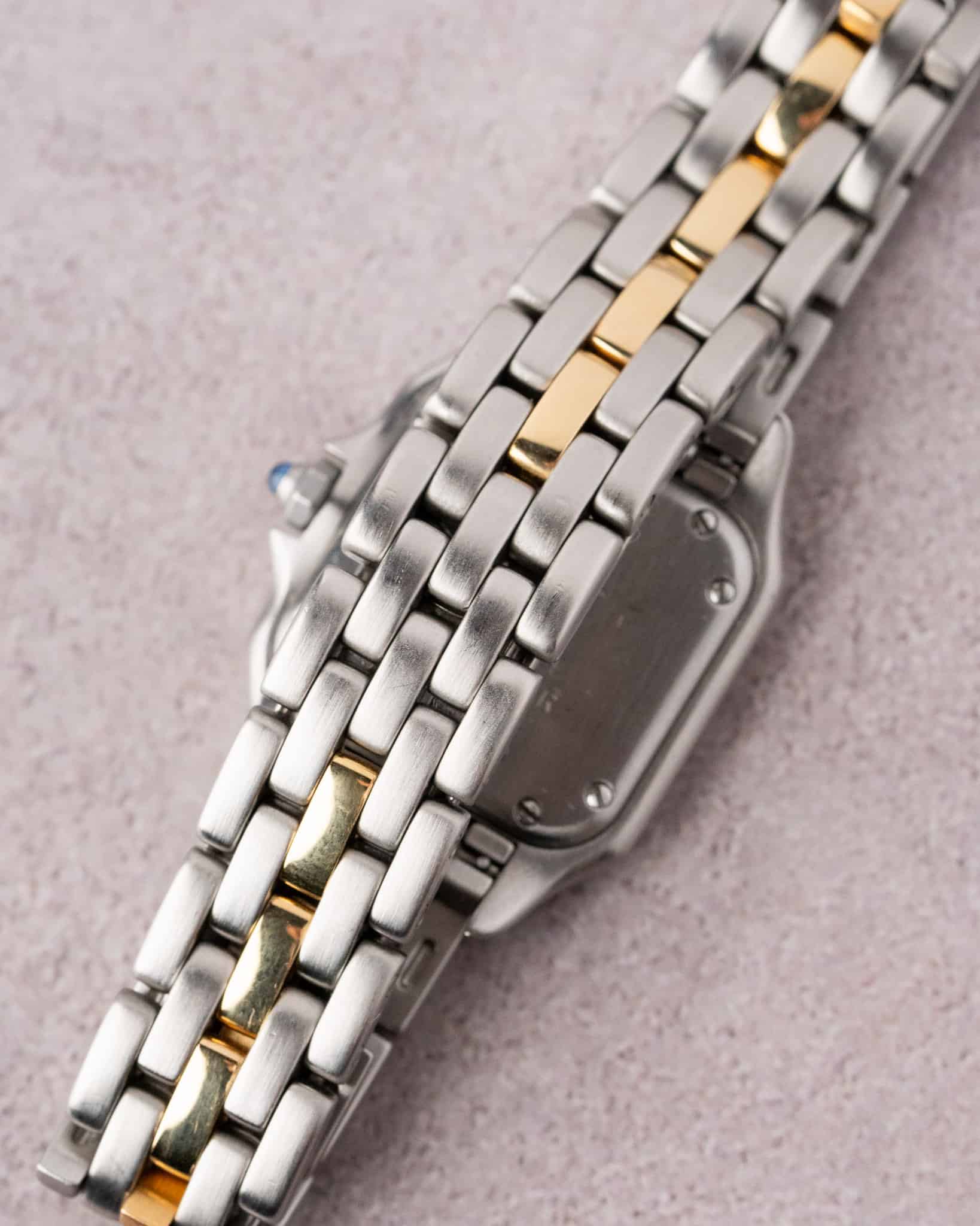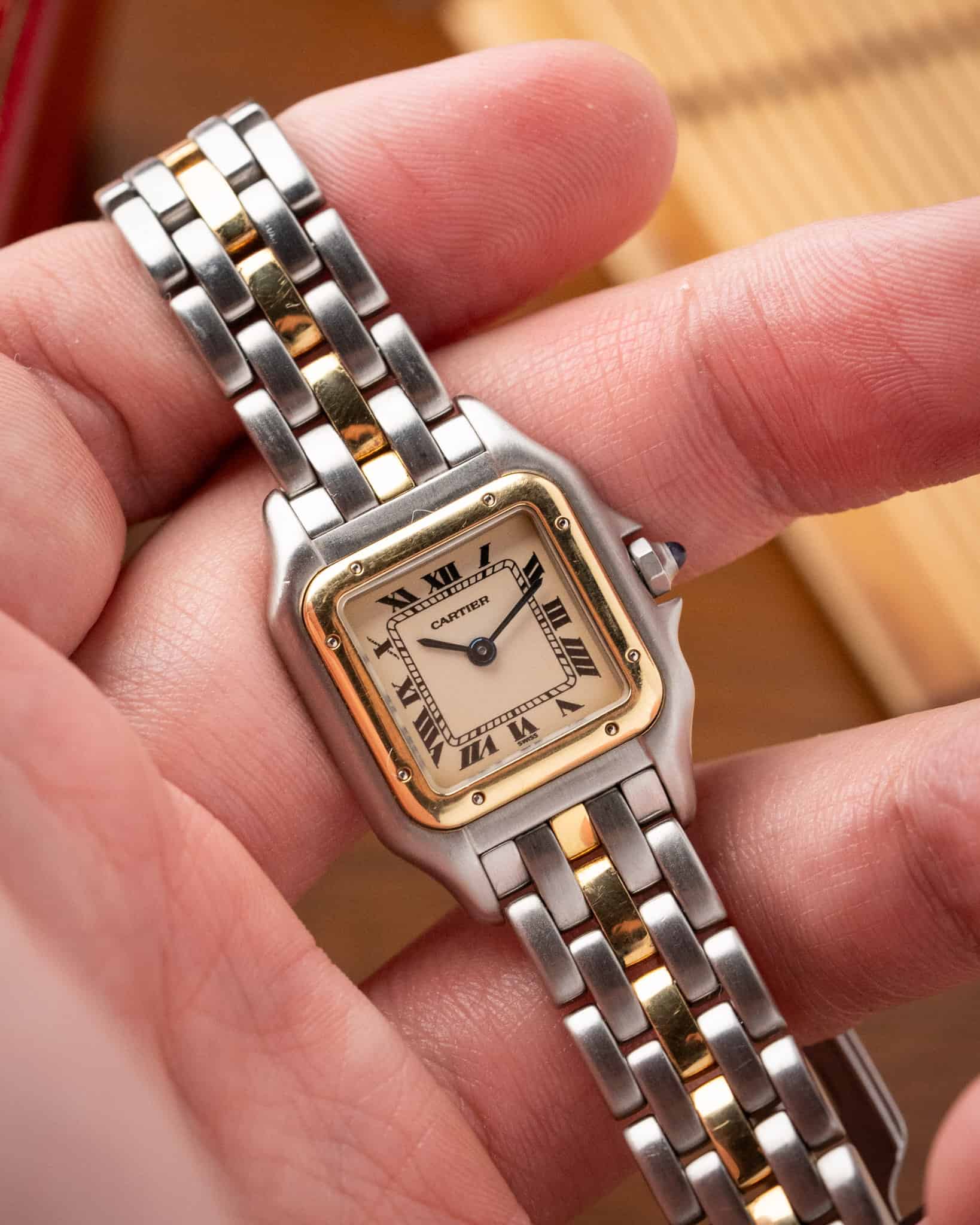 For sale is a stunning two-tone Cartier Panthère with a one row gold bracelet, reference 1057917. This small model features a sleek stainless steel and 18k yellow gold case, this model has been super popular thanks to the prevalence of this model on social media platforms.
