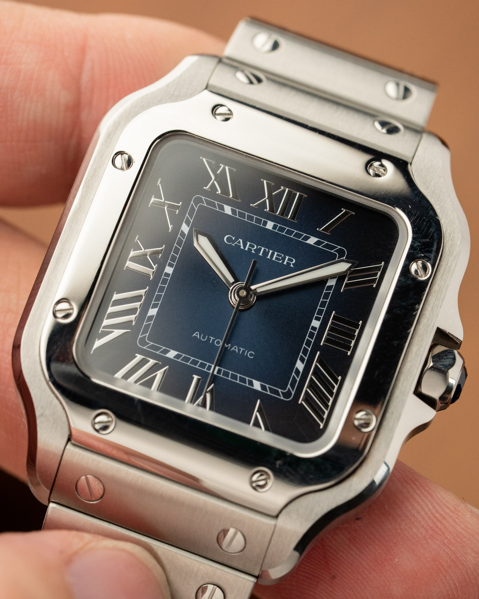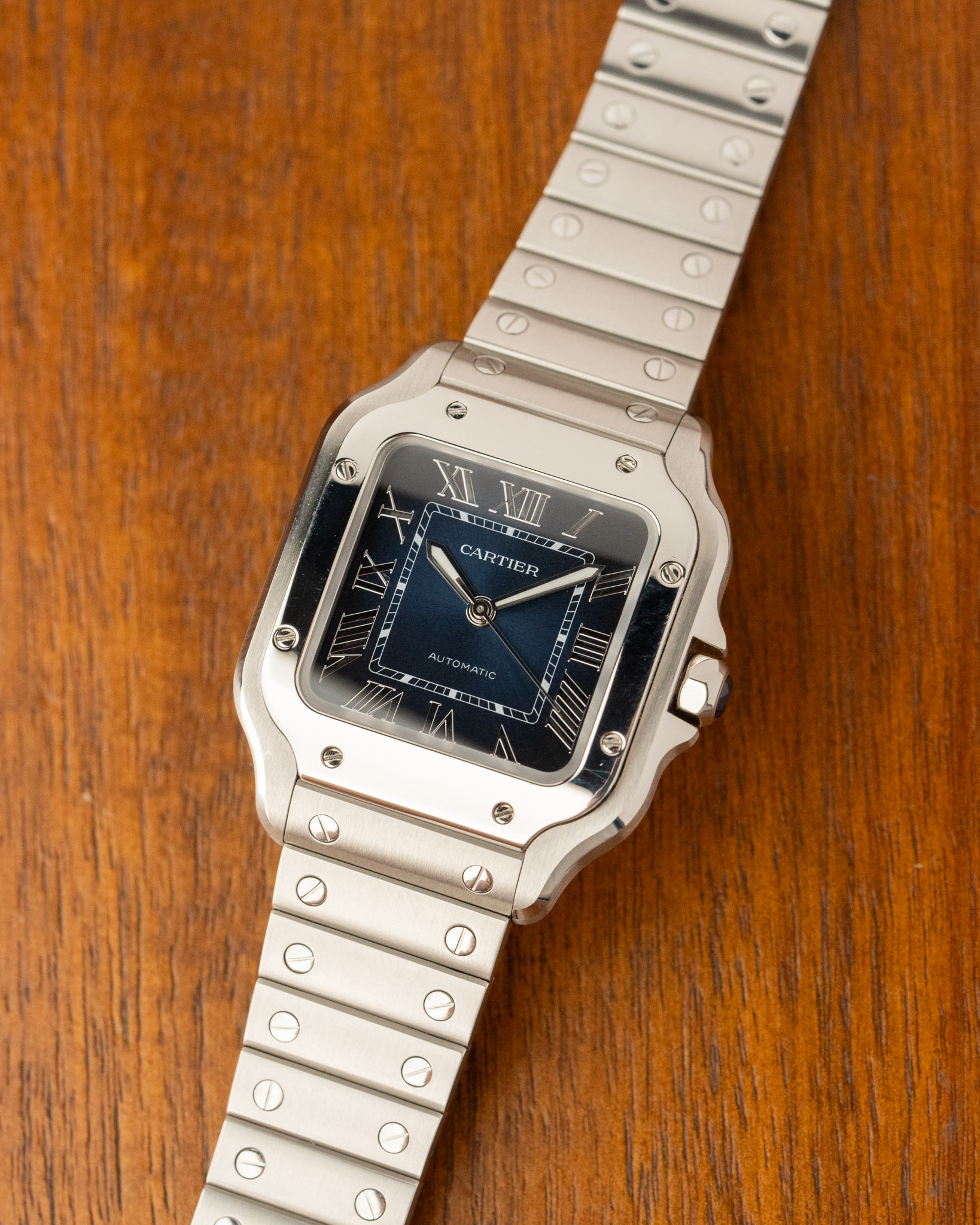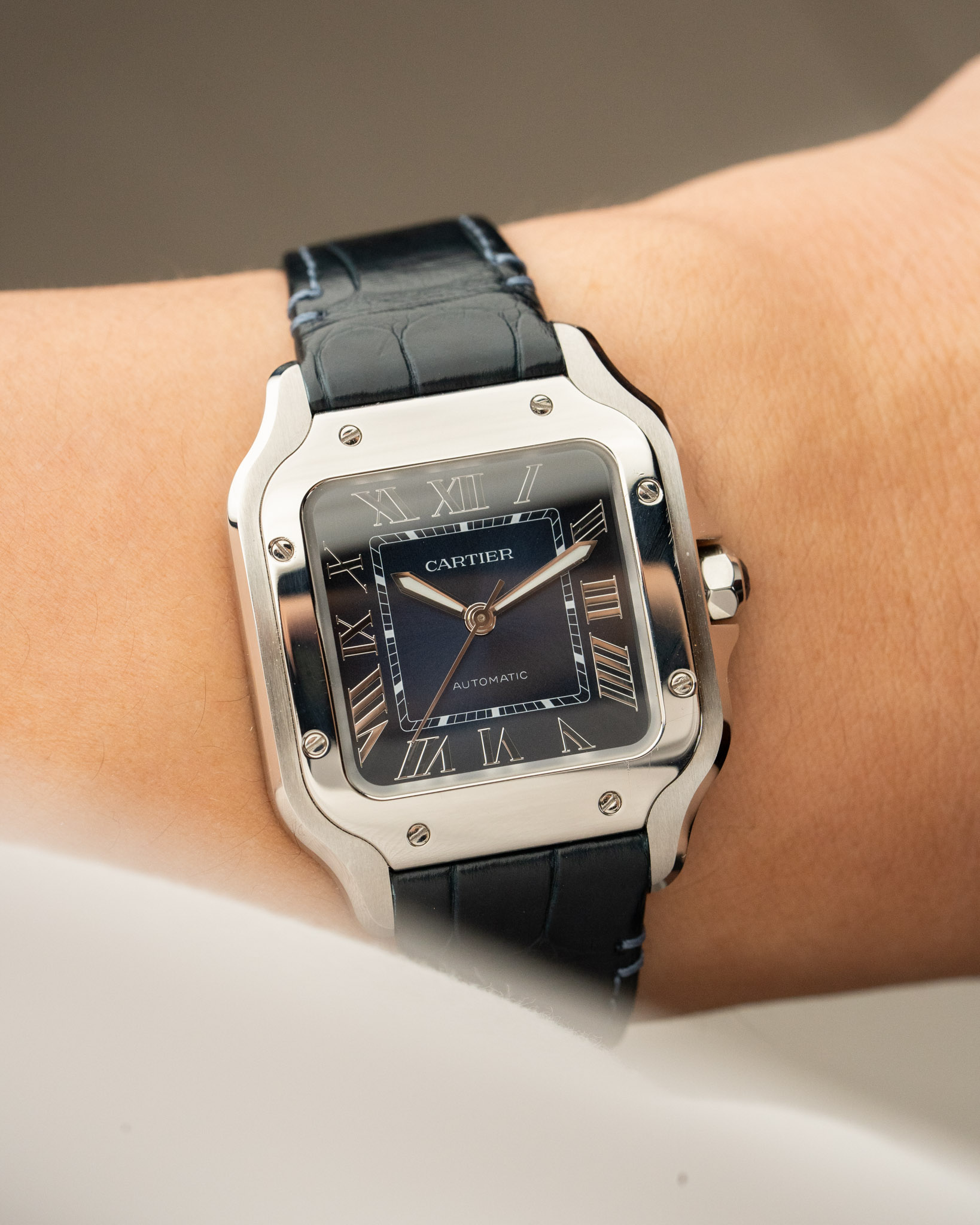 A 2024 Cartier Santos de Cartier Medium model with a blue dial. This modern execution of the classic design is in excellent condition and is offered as a complete full set with an OEM Cartier Blue Alligator Strap