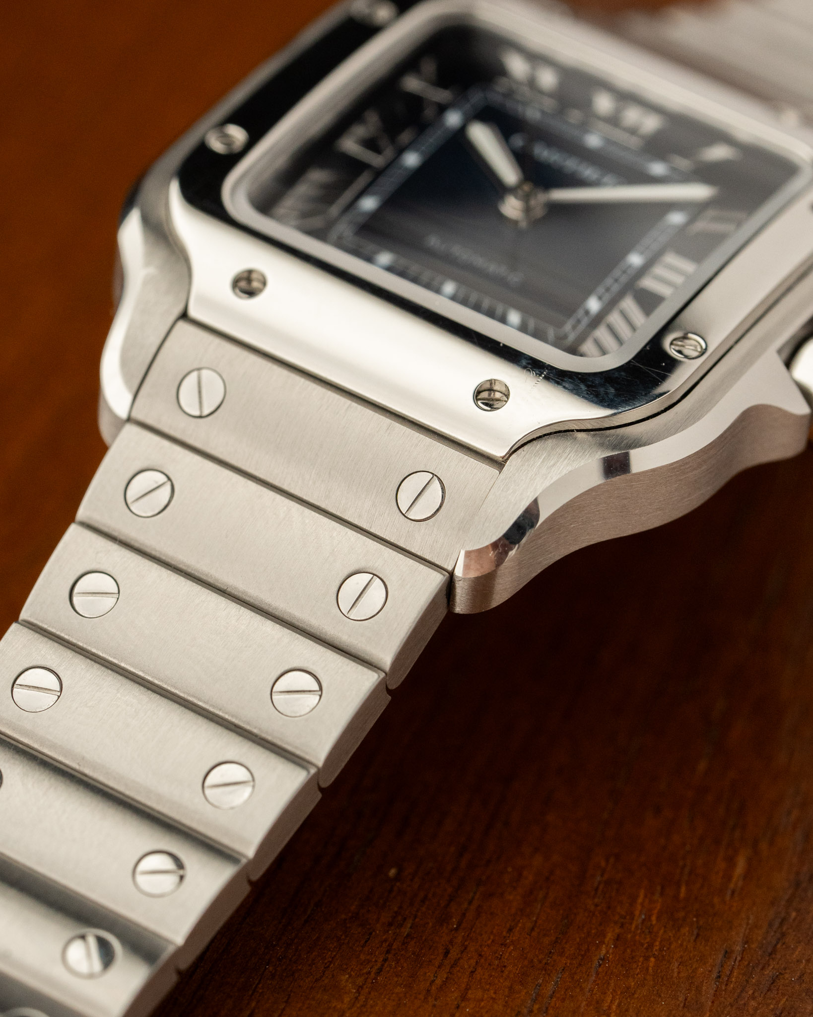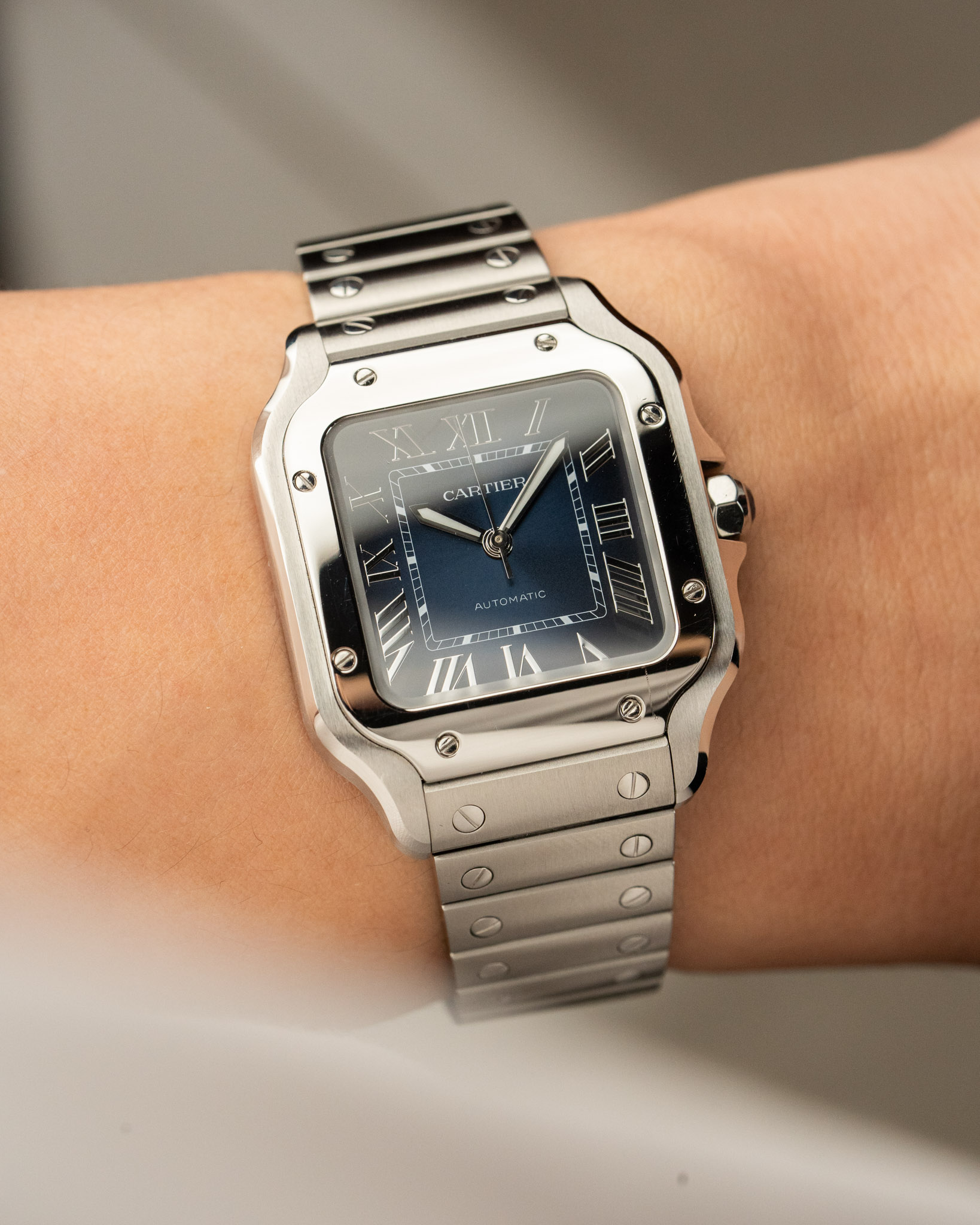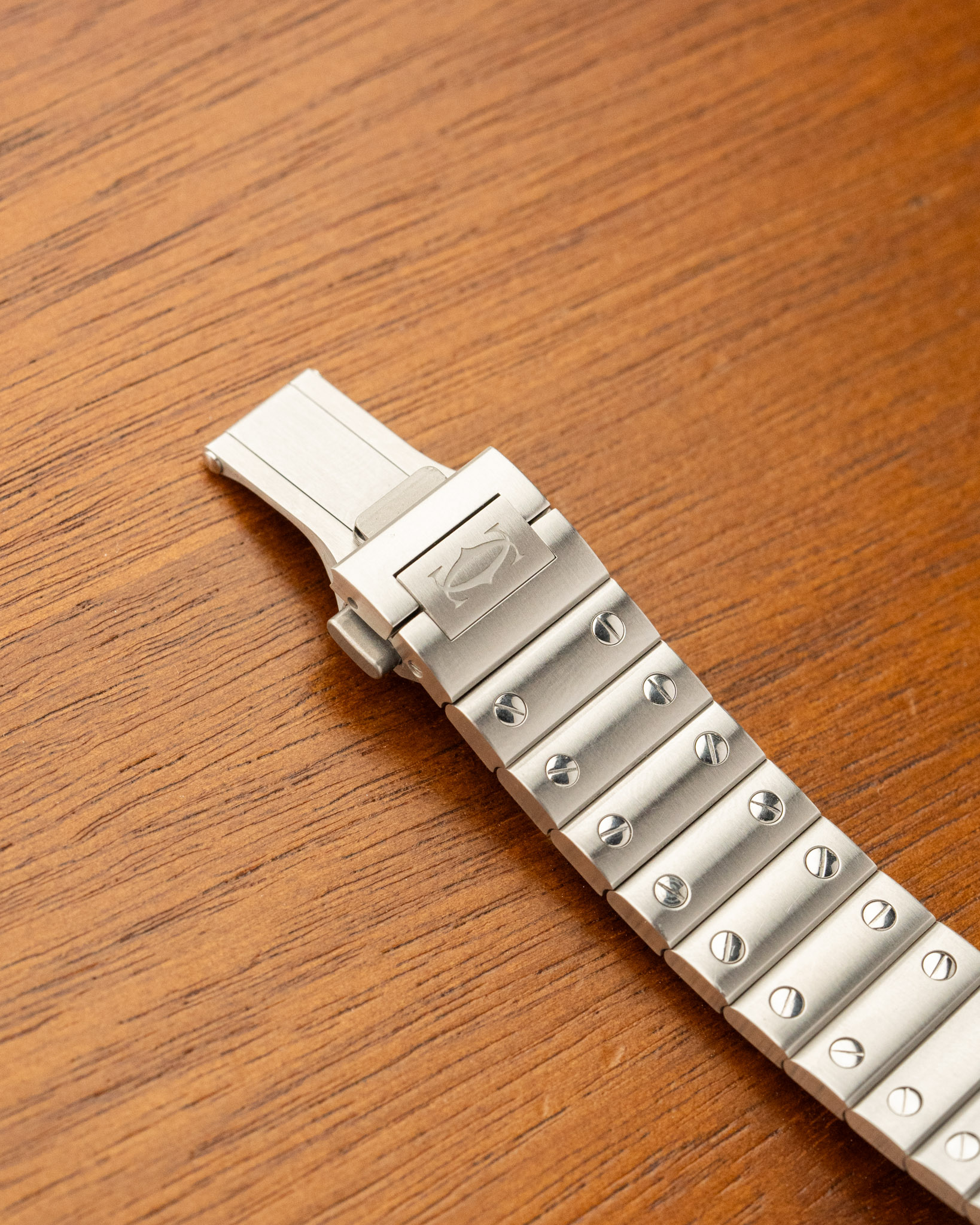 The Santos de Cartier, first created in 1904 for the aviator Alberto Santos-Dumont, is recognised as one of the pioneering purpose-built wristwatches. Its design, featuring a square bezel with exposed screws and an integrated bracelet, has become a timeless icon of industrial elegance in watchmaking.