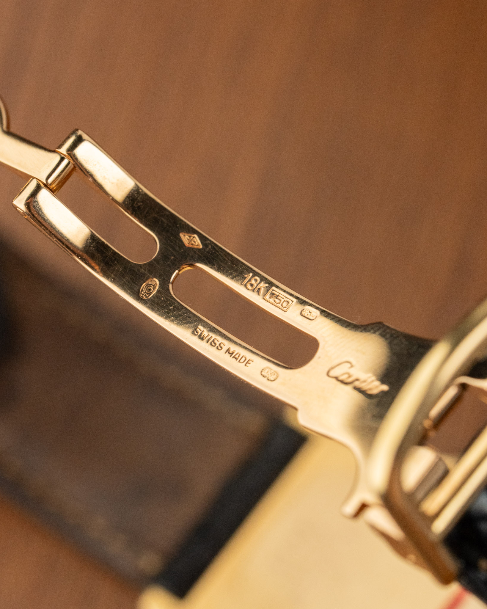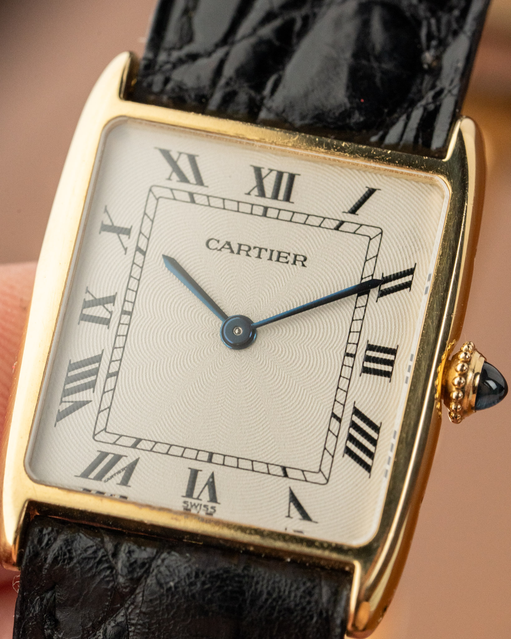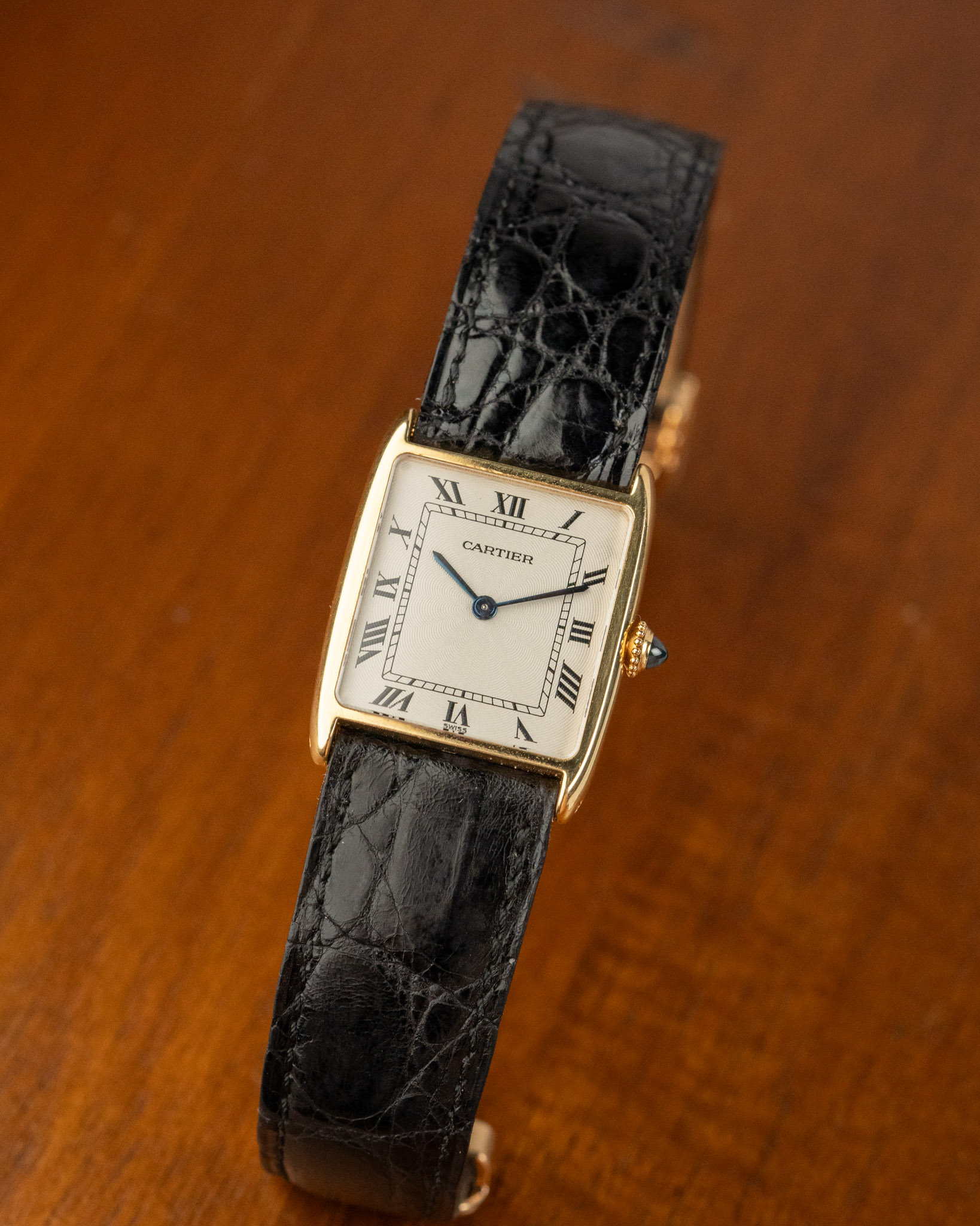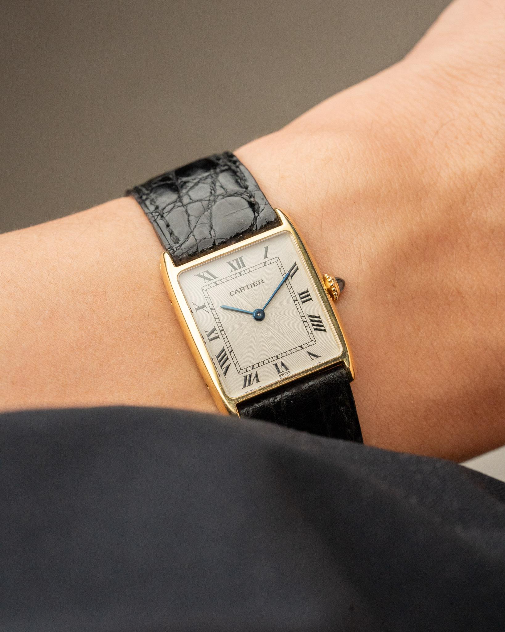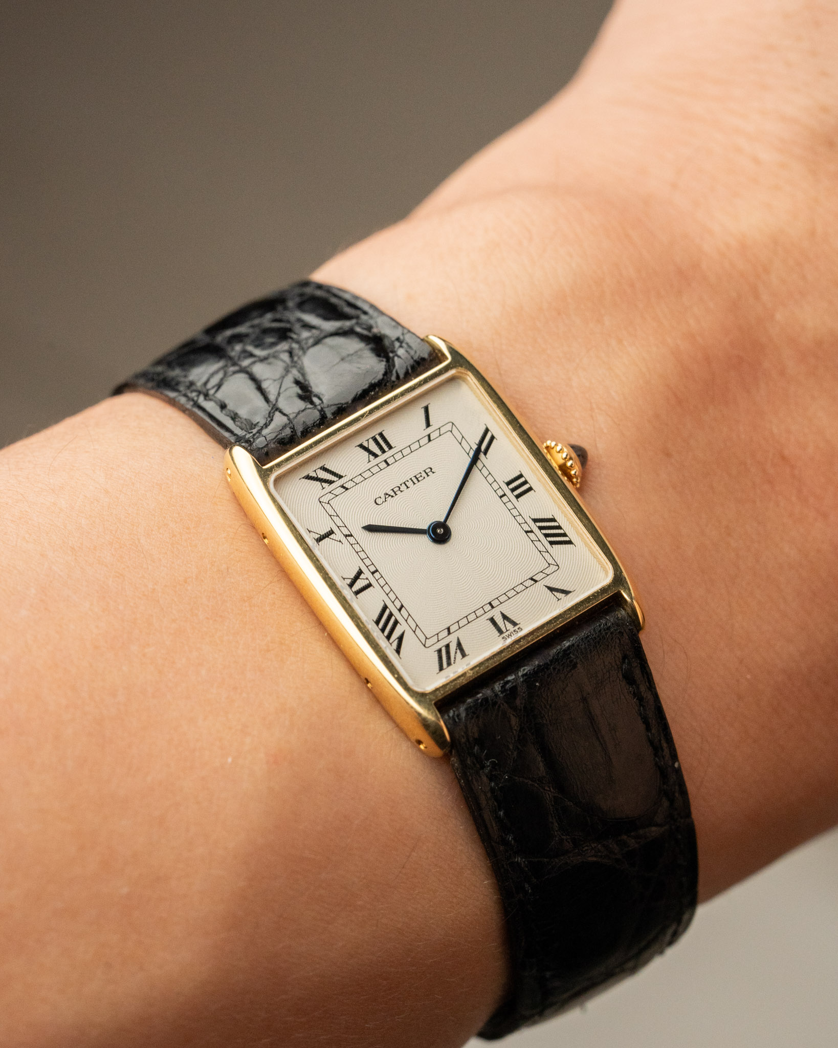 A Cartier Tank Arrondie with manual wind movement based on the Frédéric Piguet Calibre 21. This watch has been freshly serviced by Cartier in 2025 and comes with a two-year Cartier warranty. It includes its Cartier strap, gold buckle, watch pouch, and full service documentation.