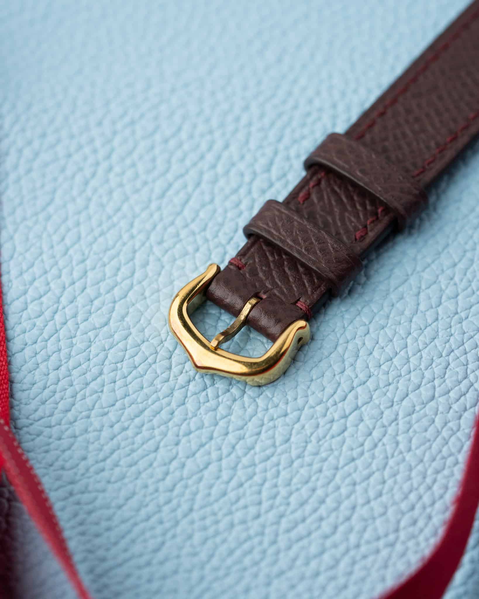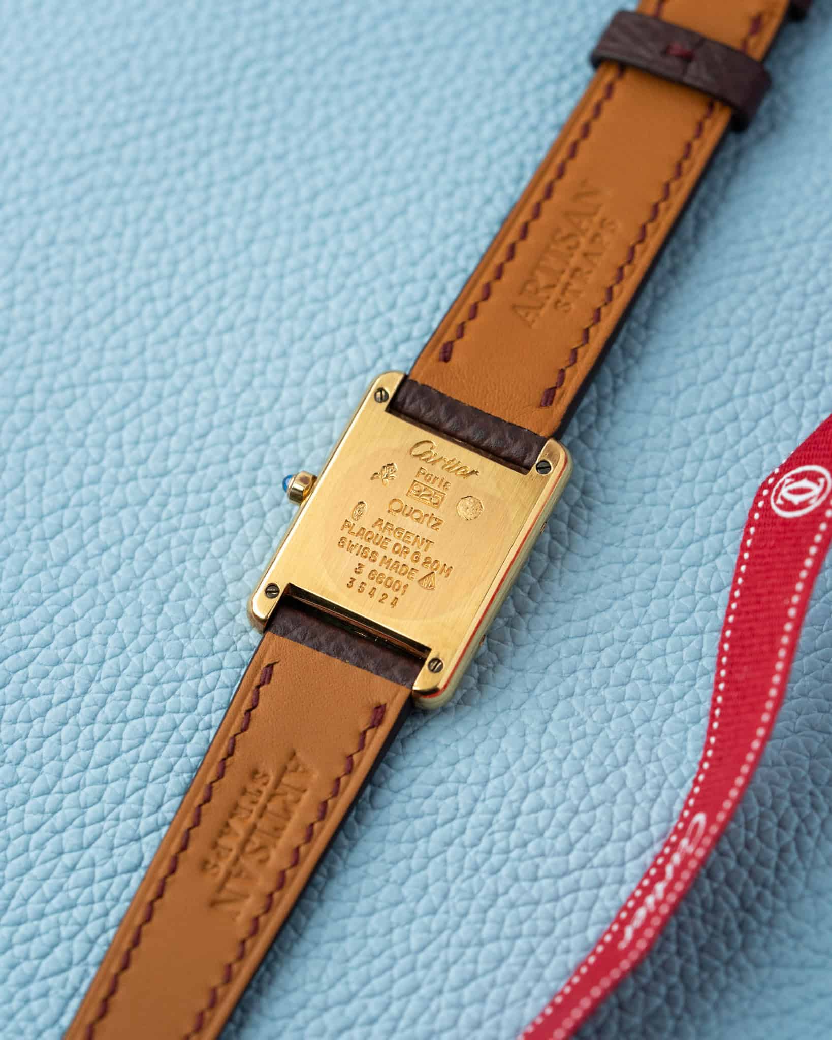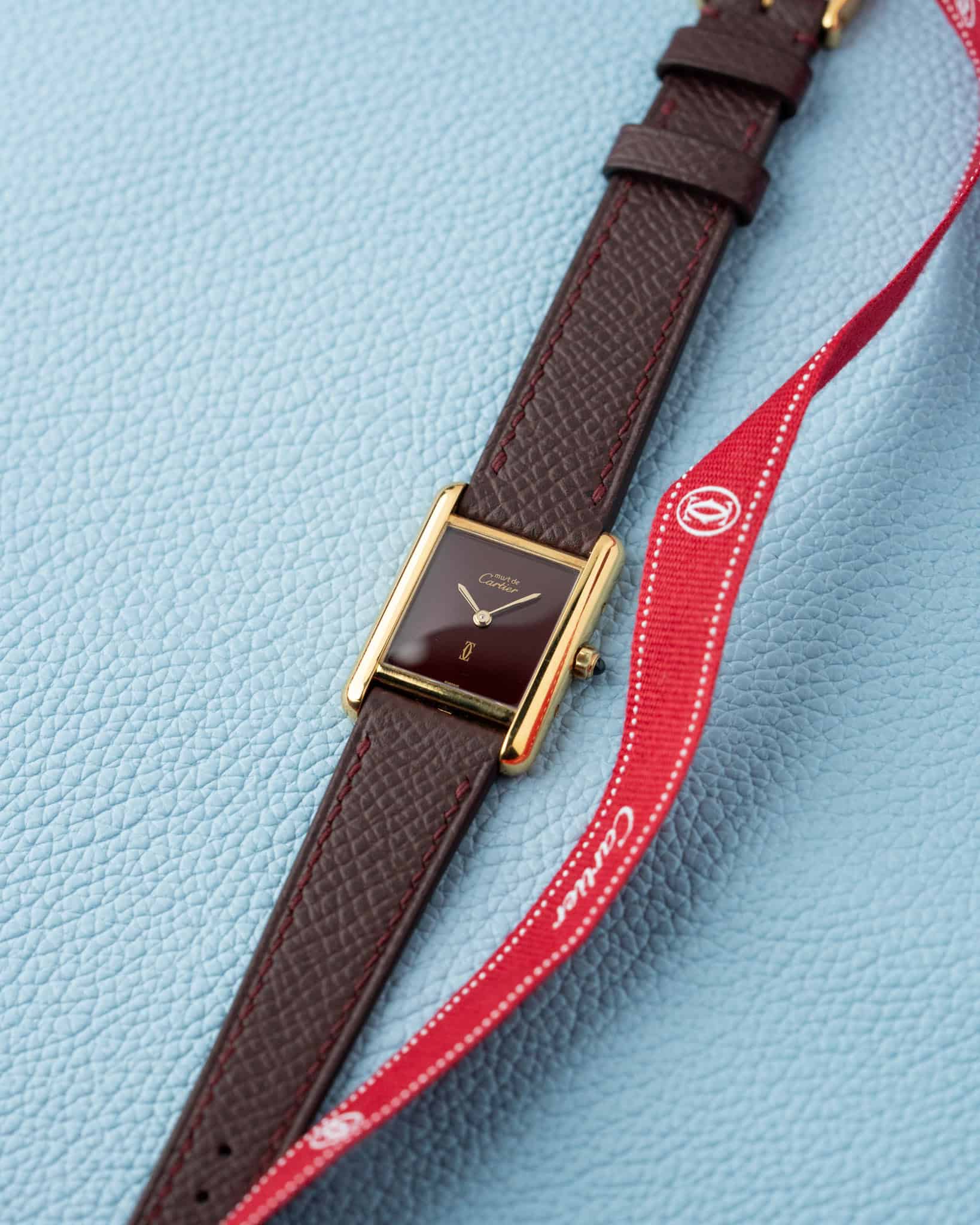 The burgundy dial offering a bold alternative to classic white/silver Tank configurations, and is paired nicely with a burgundy calf strap from Artisan Straps.