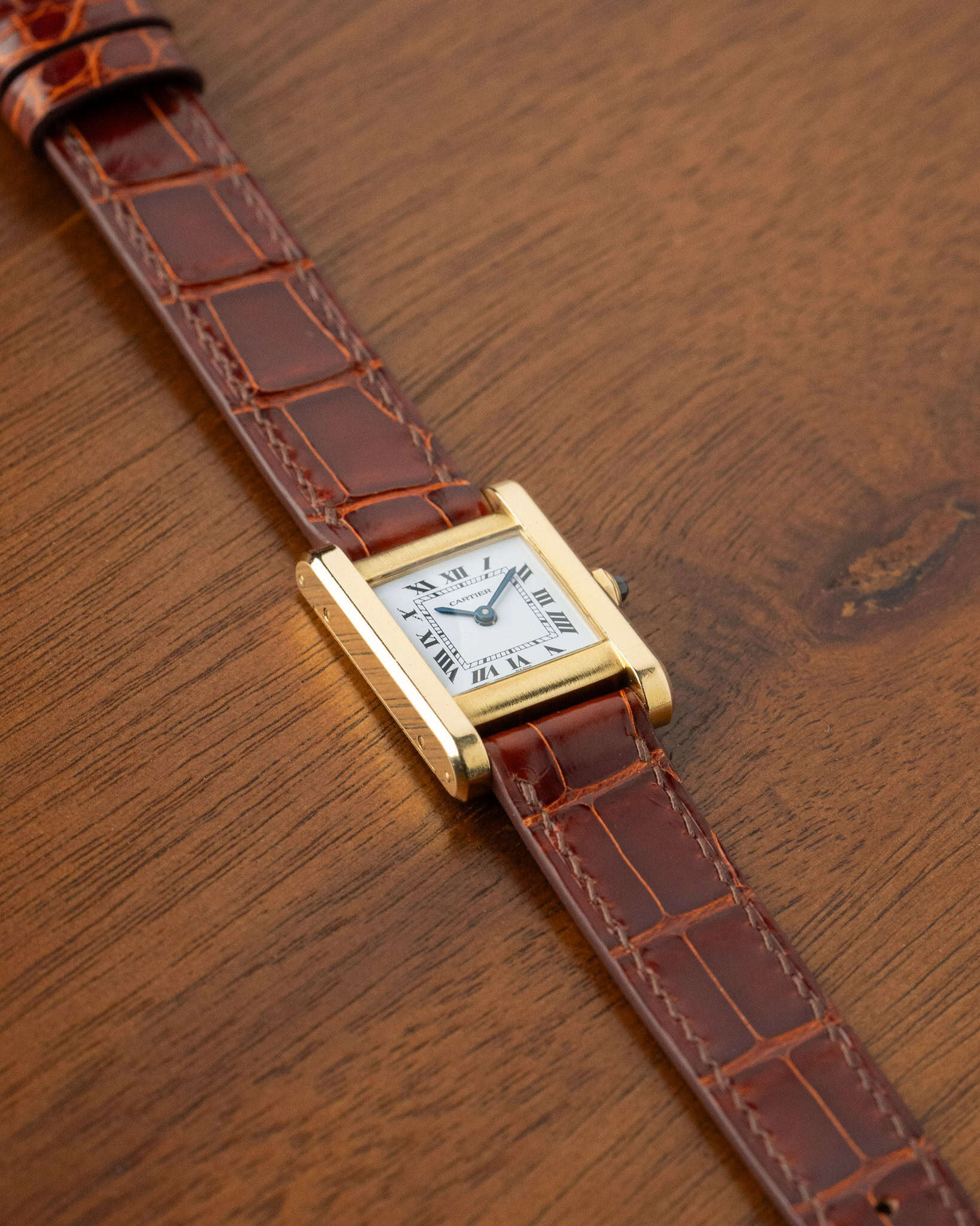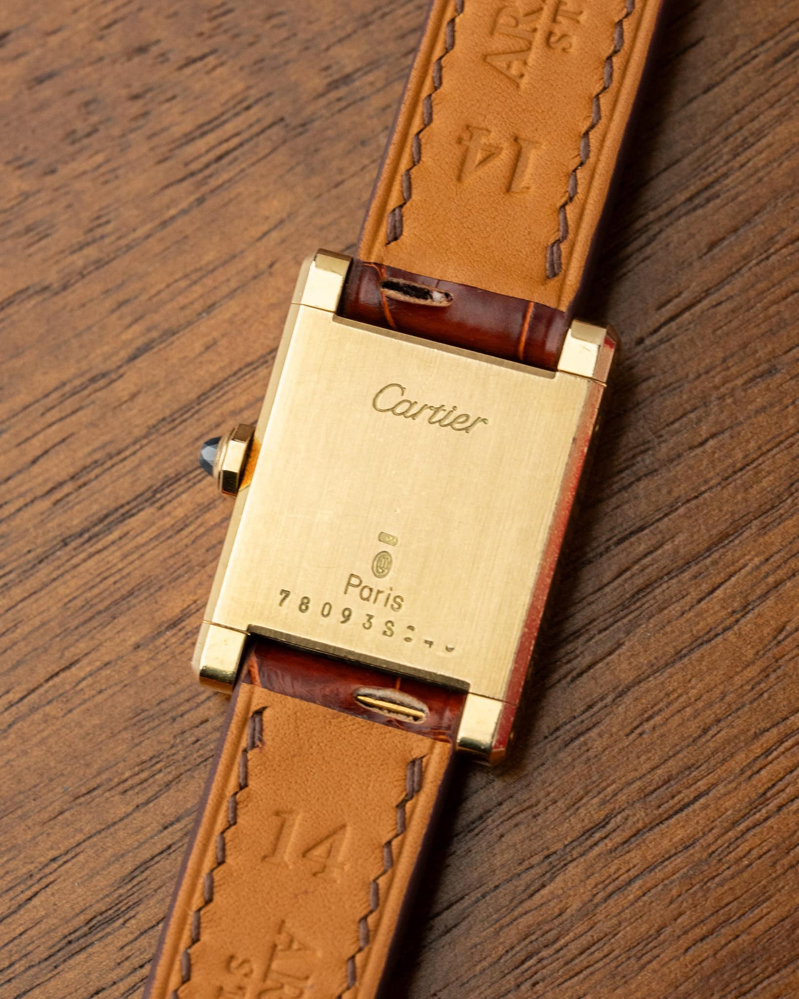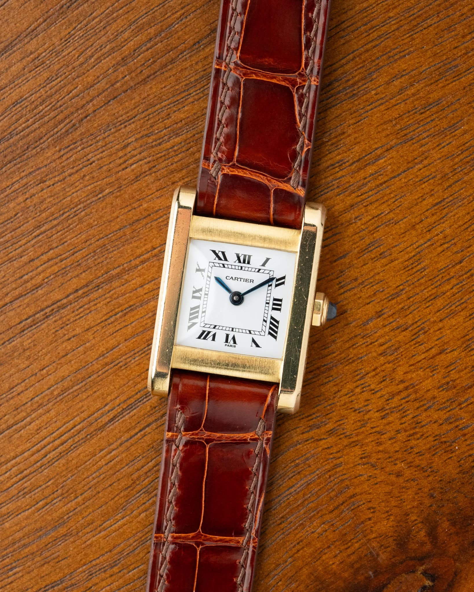 This Cartier Tank Normale reference 78093 in 18k yellow gold represents the SM (Small Model) iteration of Cartier’s iconic design. The rectangular case measures 20x28mm, maintaining the original Tank proportions in a wearable size.