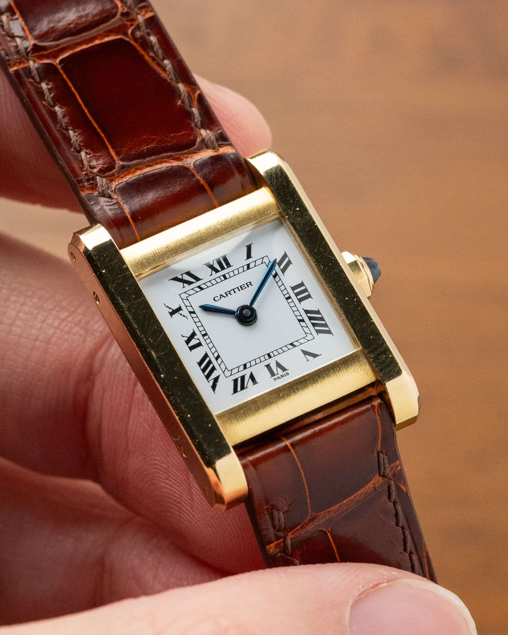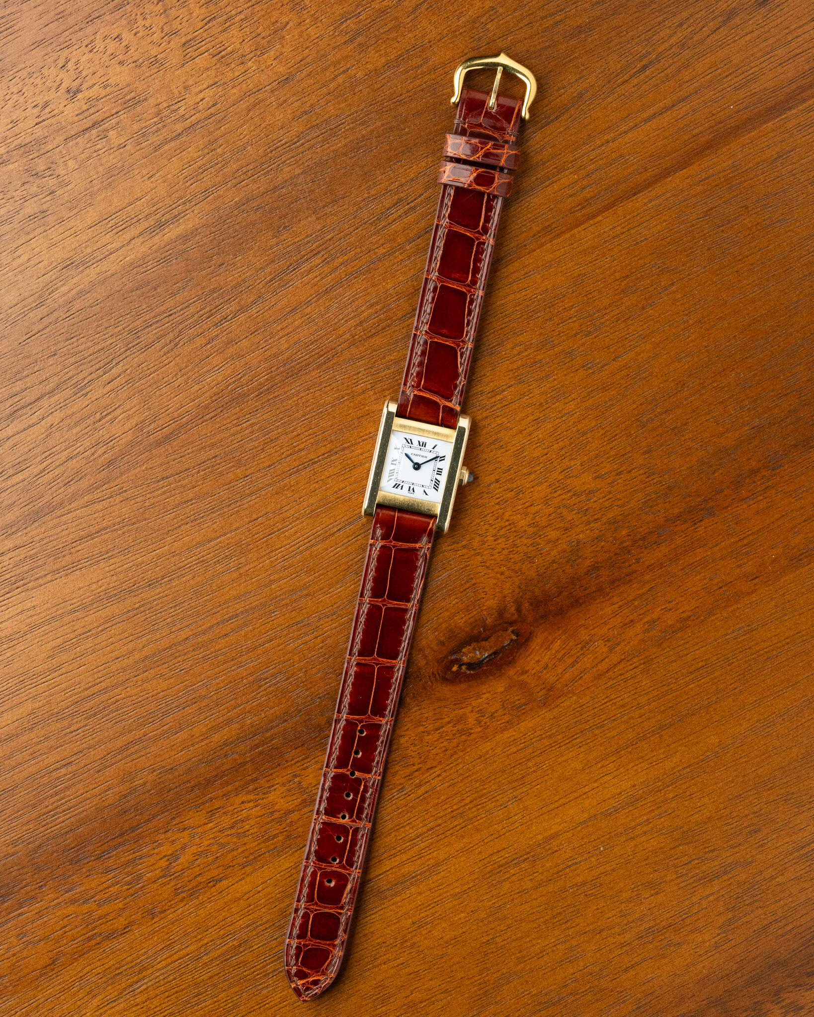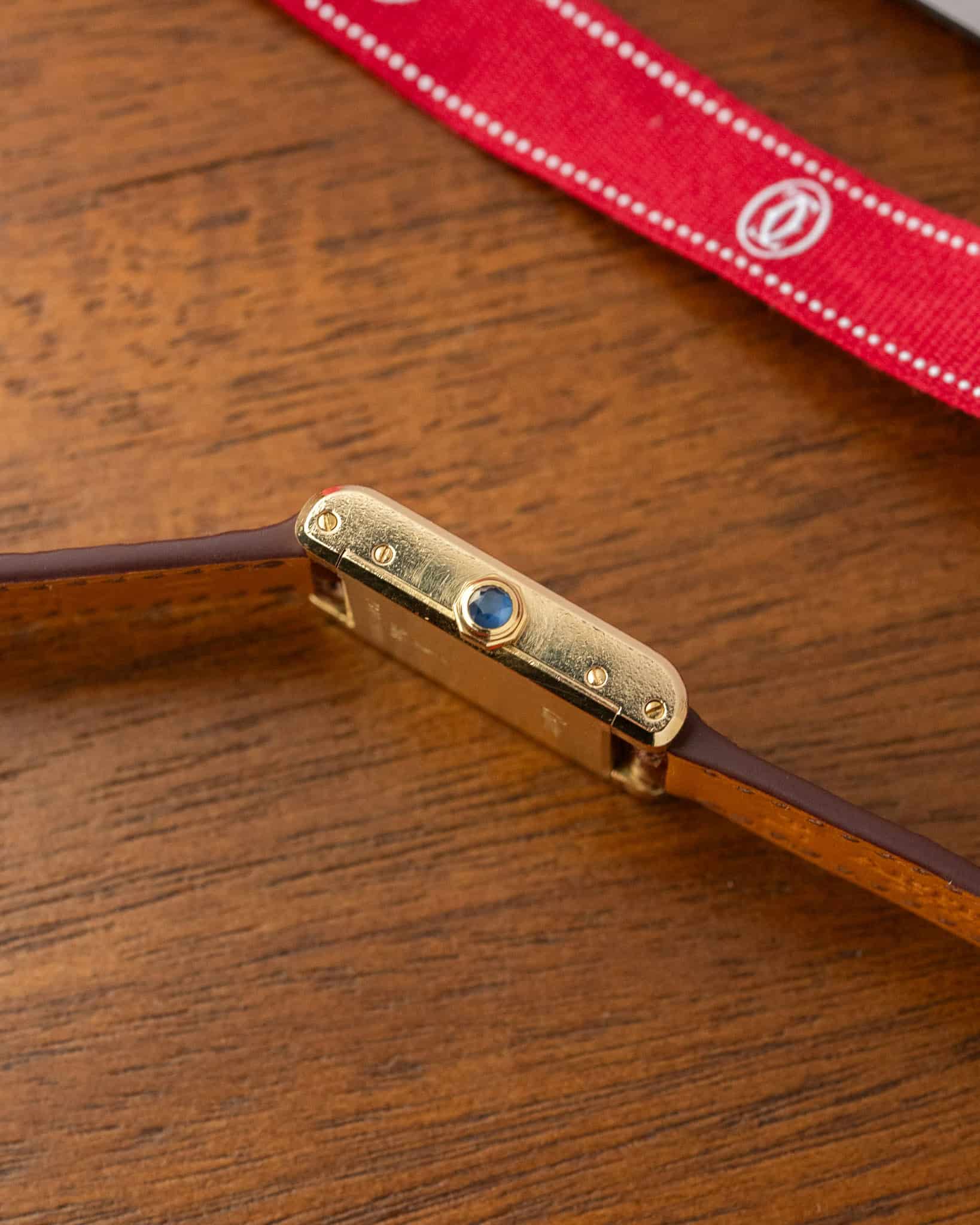 This Cartier Tank Normale reference 78093 in 18k yellow gold represents the SM (Small Model) iteration of Cartier’s iconic design. The rectangular case measures 20x28mm, maintaining the original Tank proportions in a wearable size.