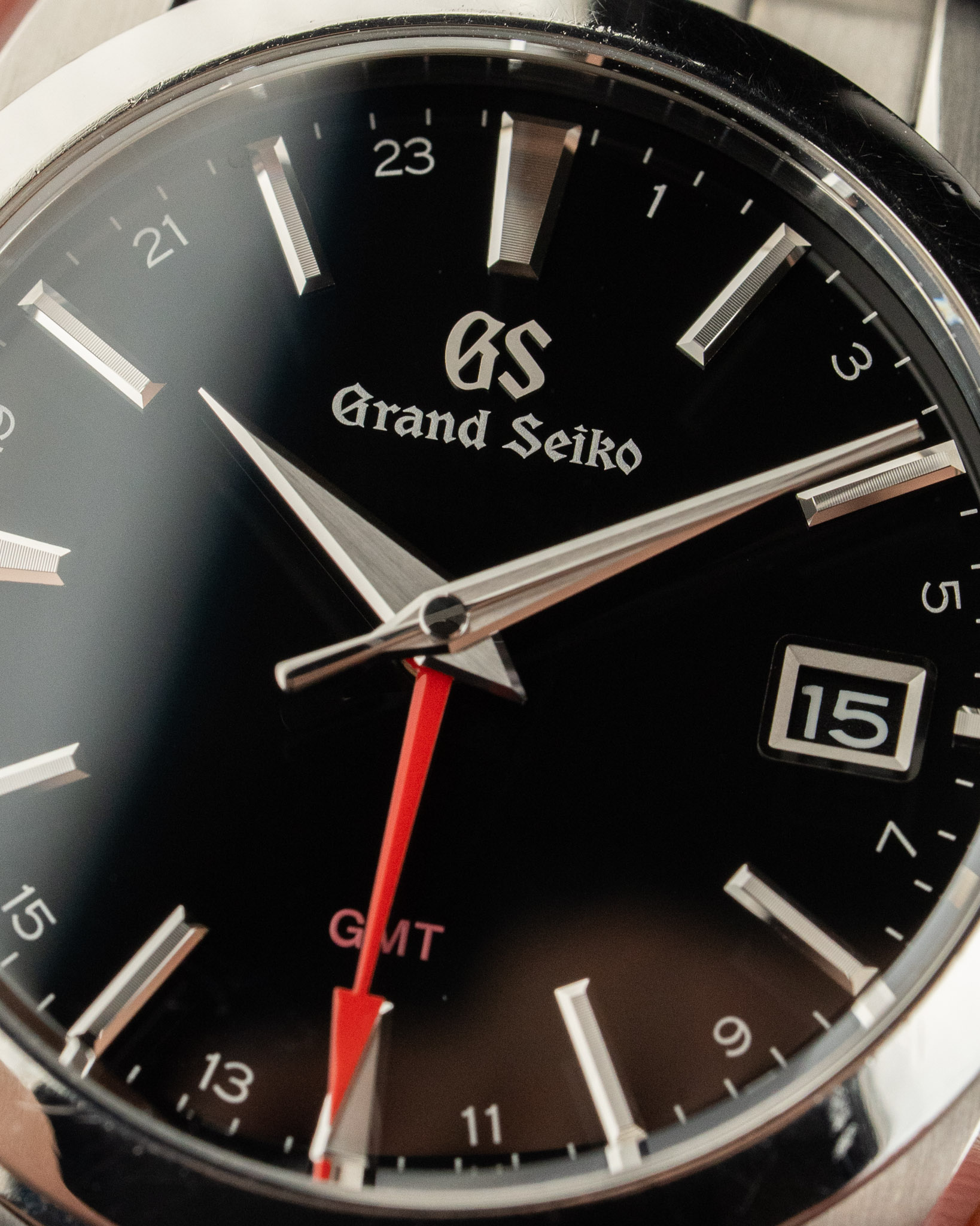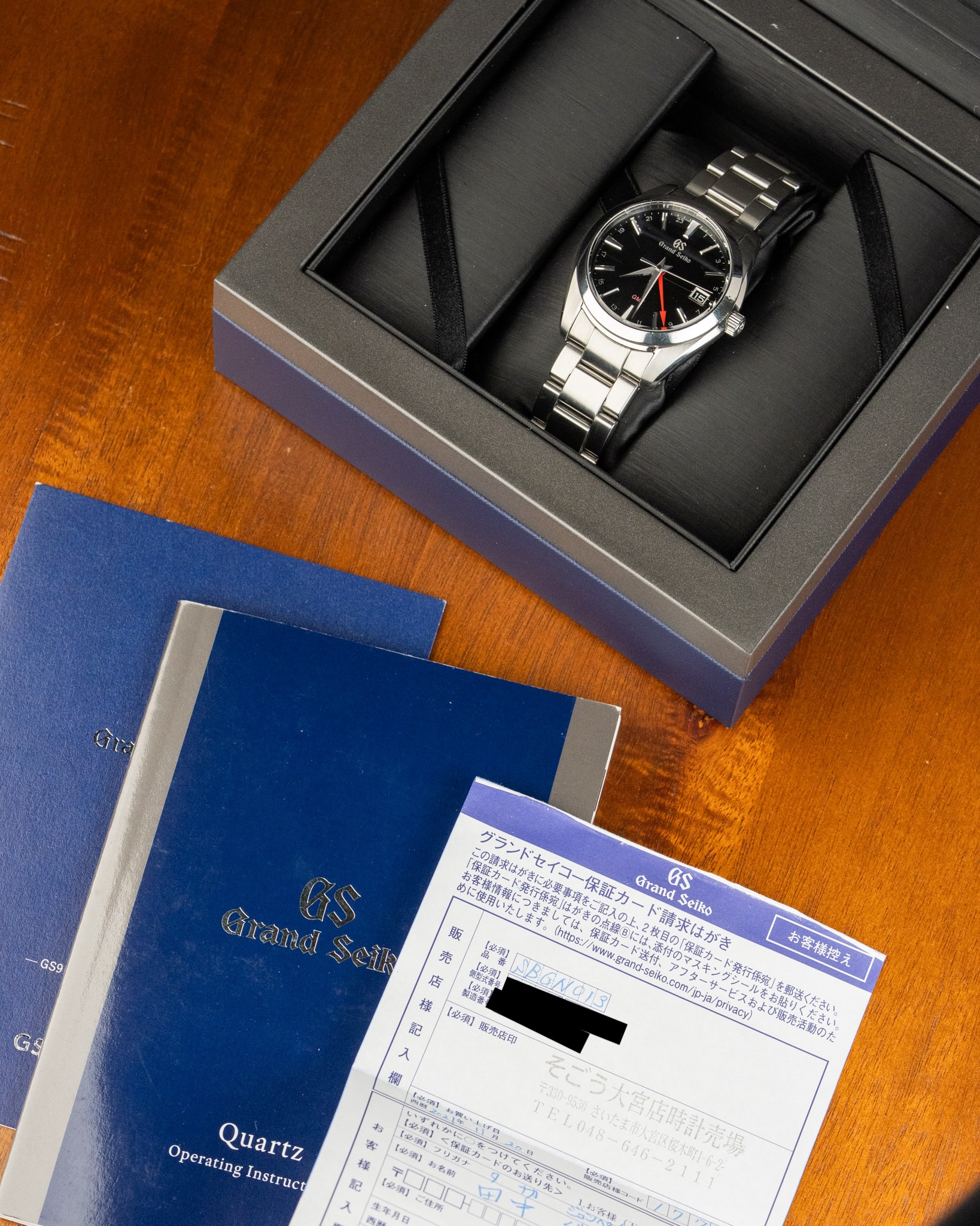 A Grand Seiko Heritage GMT with a black dial and stainless steel case. The 40mm case features Grand Seiko’s signature Zaratsu-polished surfaces, while the red GMT hand adds a bright contrast against the deep black dial. Powered by the 9F86 quartz movement. Offered with the original box.