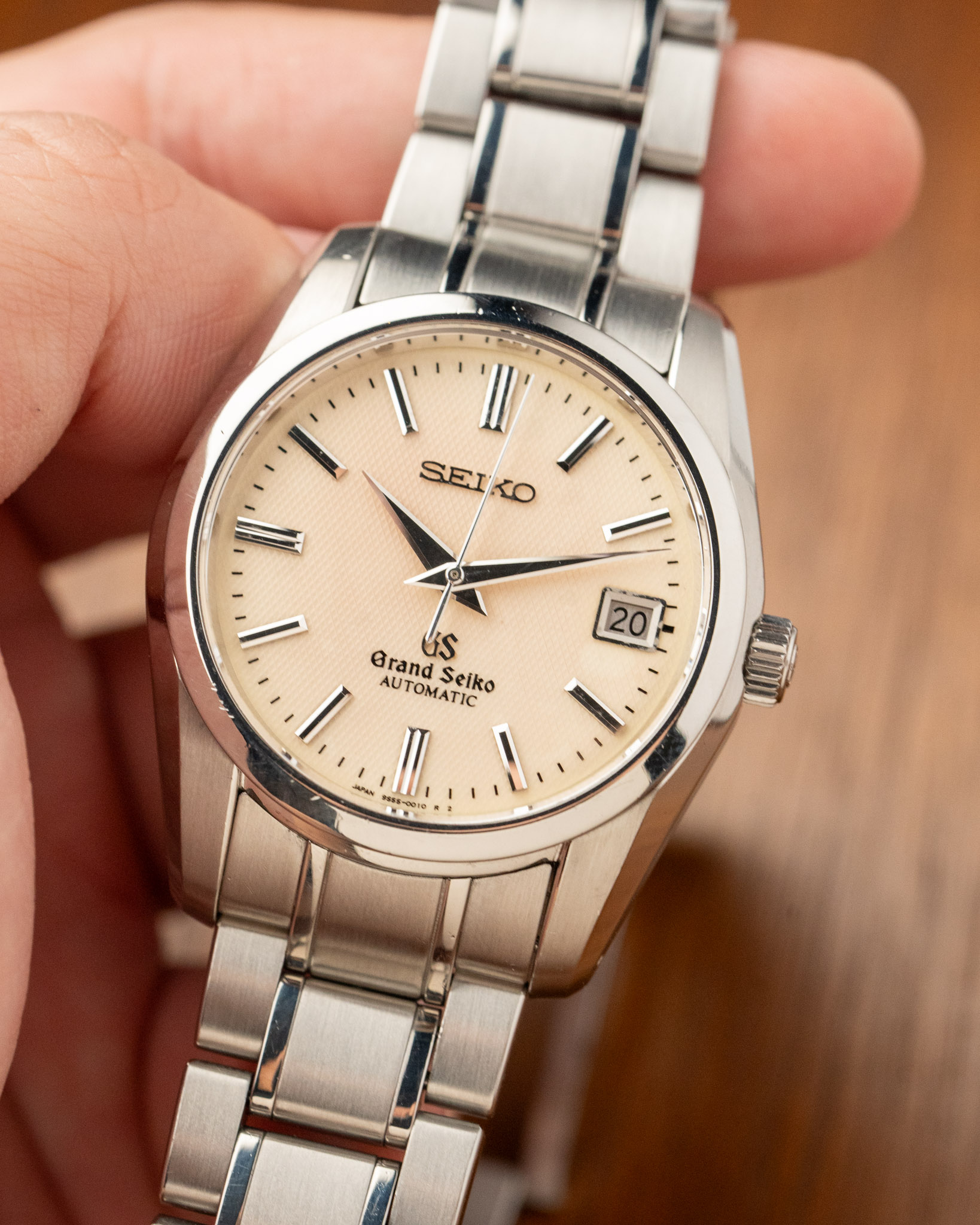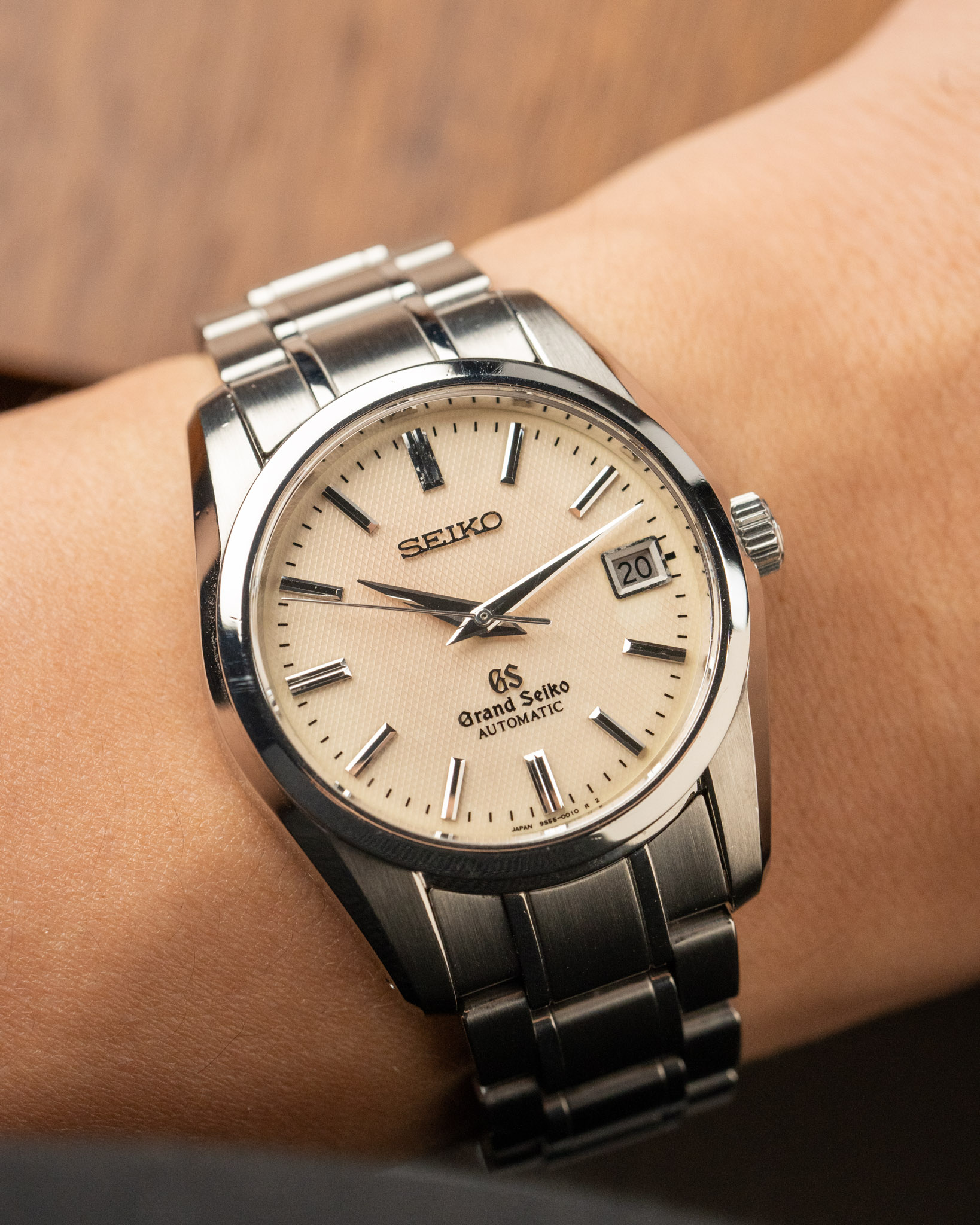 A Grand Seiko SBGR003 with a beautiful textured beige dial and classic 37mm stainless steel case. This 300-piece limited edition features the automatic Calibre 9S55 movement, visible through the exhibition caseback. Offered as a full set with an overhaul in 2023.