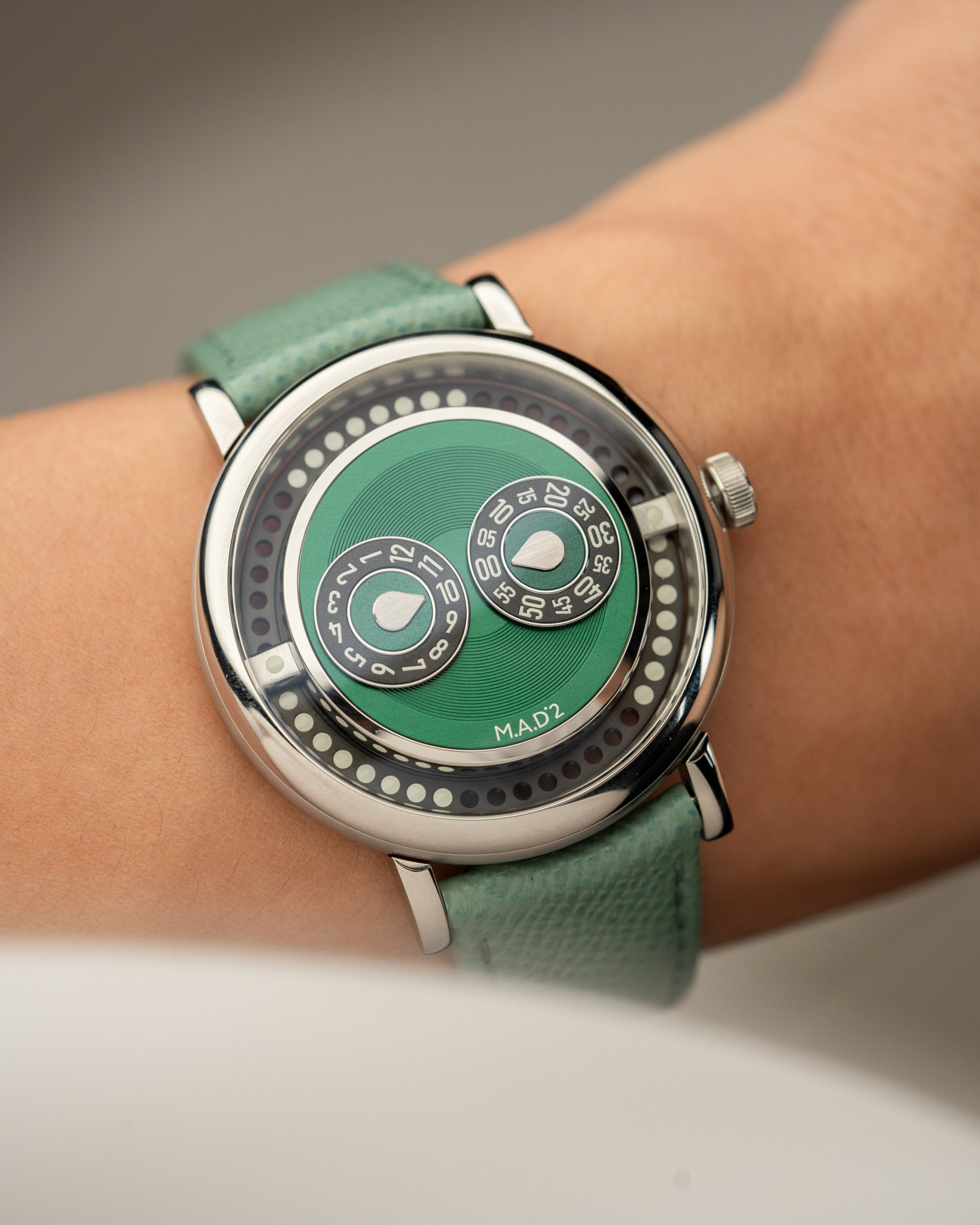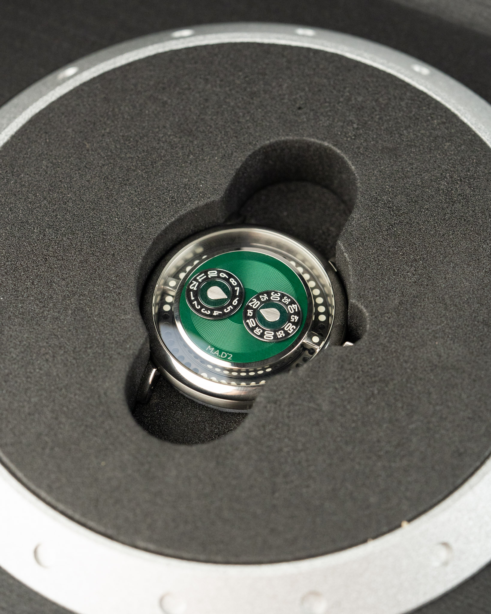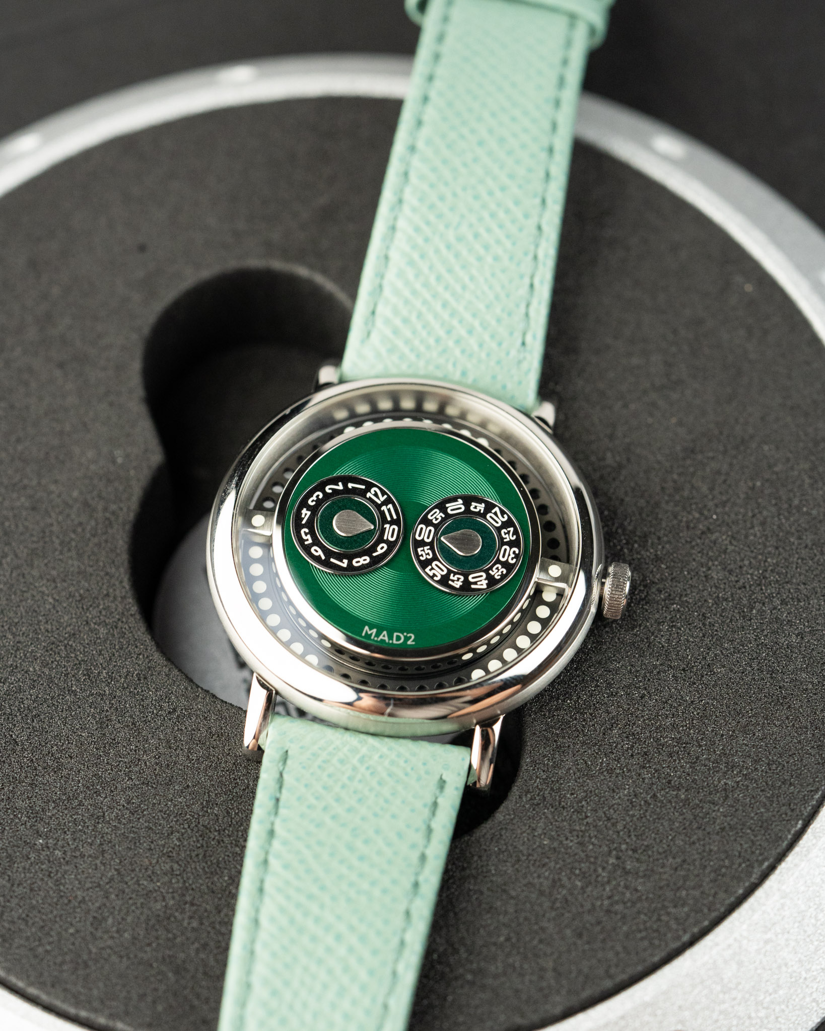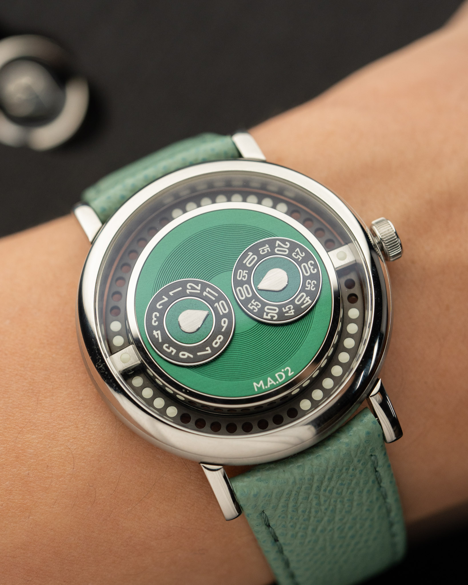 A 2025 MB&F M.A.D 2 Green in excellent condition. Features a 42mm stainless steel case and wearable vinyl inspired by DJ culture, spinning like a record with your wrist’s motion. The case has a smooth, organic “pebble” shape with brushed flanks and domed sapphire crystals