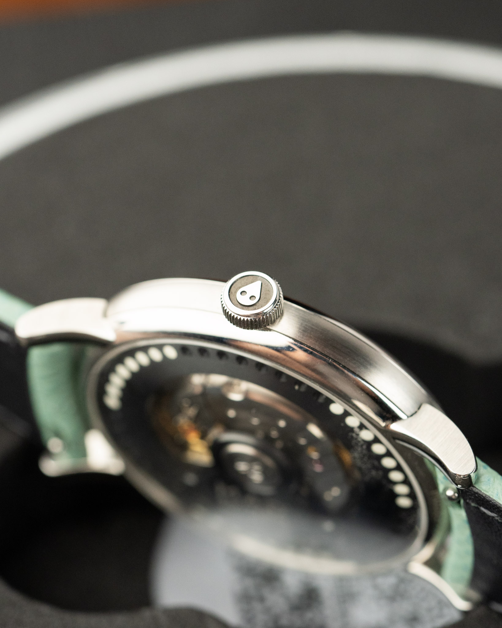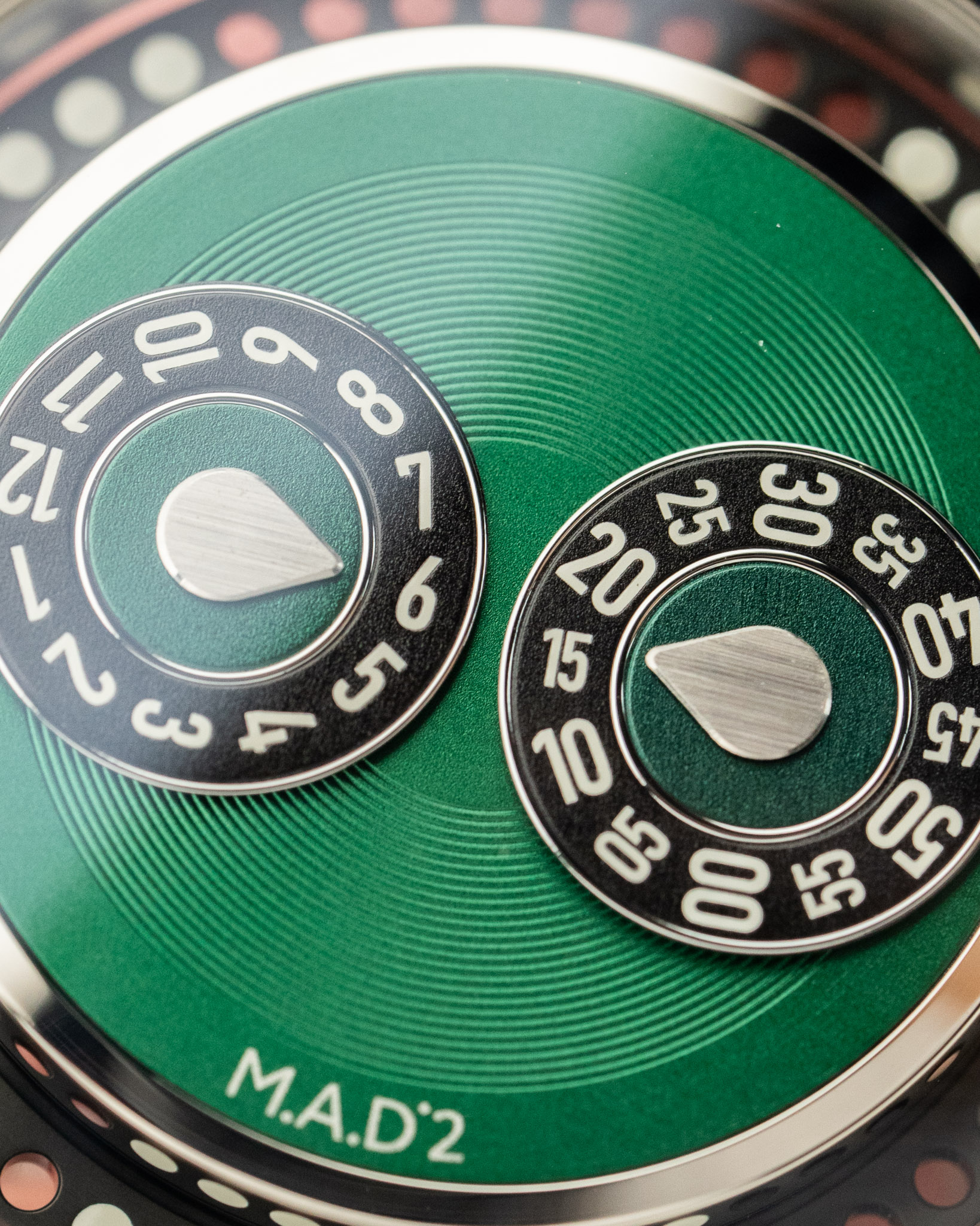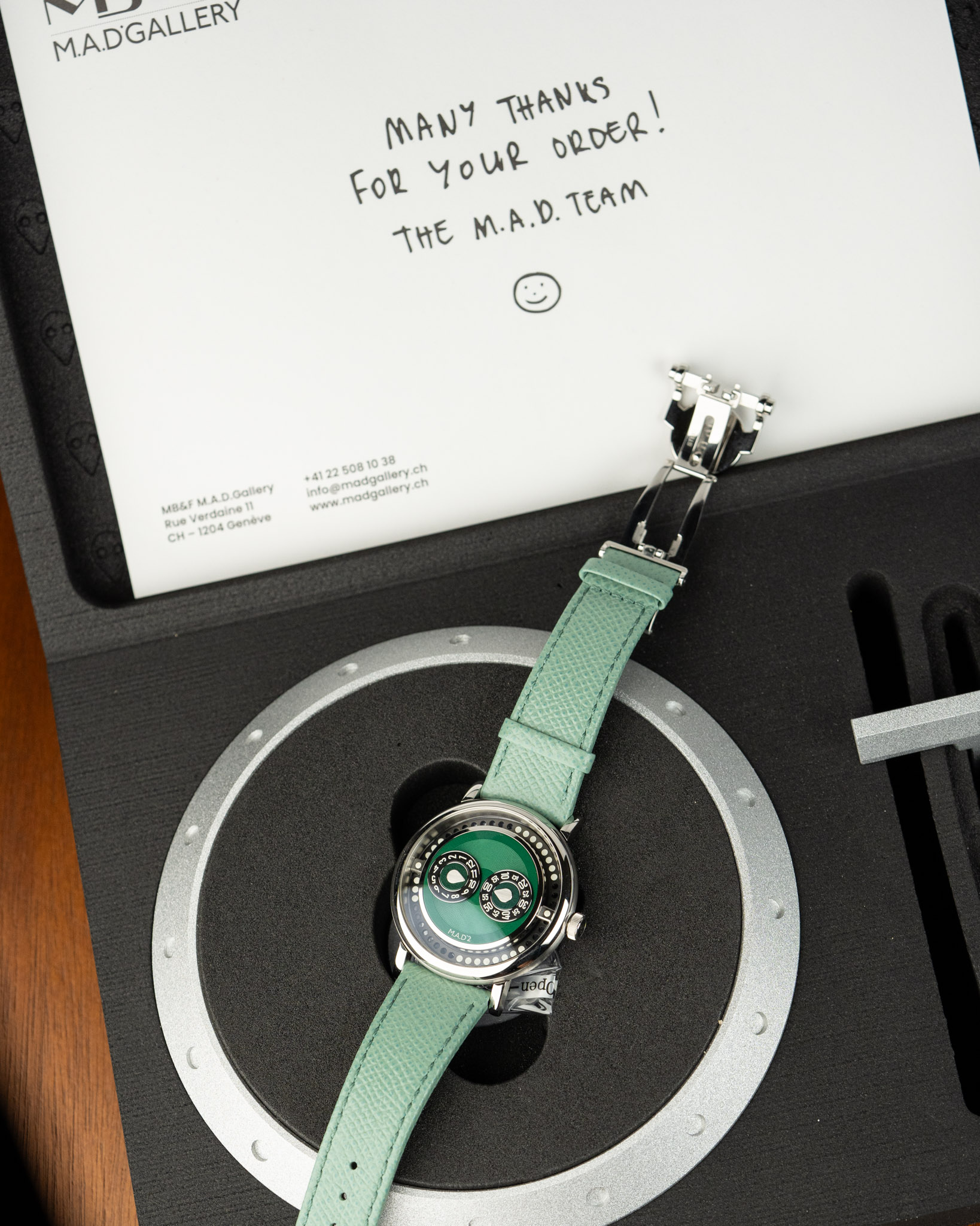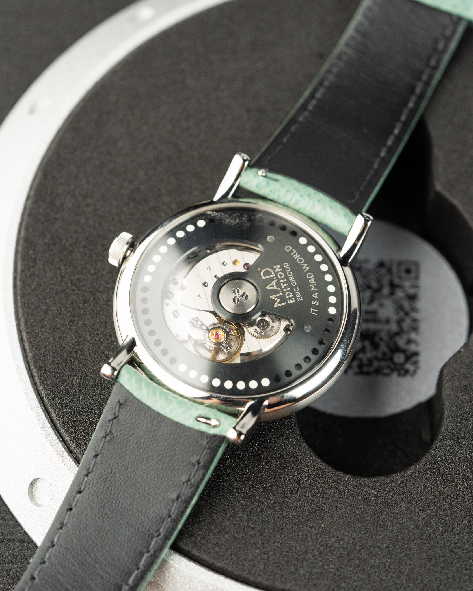 A 2025 MB&F M.A.D 2 Green in excellent condition. Features a 42mm stainless steel case and wearable vinyl inspired by DJ culture, spinning like a record with your wrist’s motion. The case has a smooth, organic “pebble” shape with brushed flanks and domed sapphire crystals