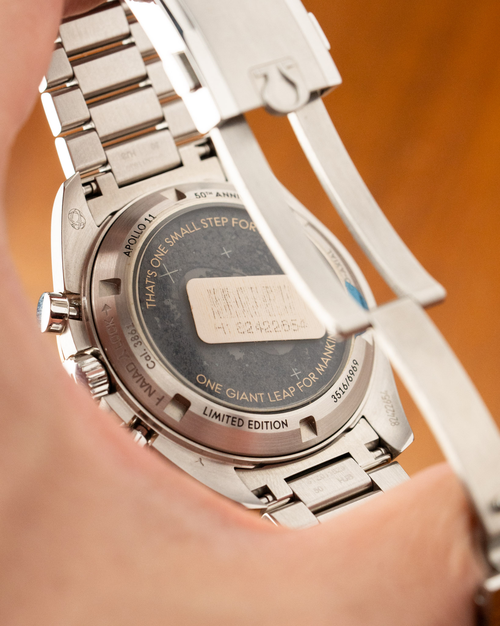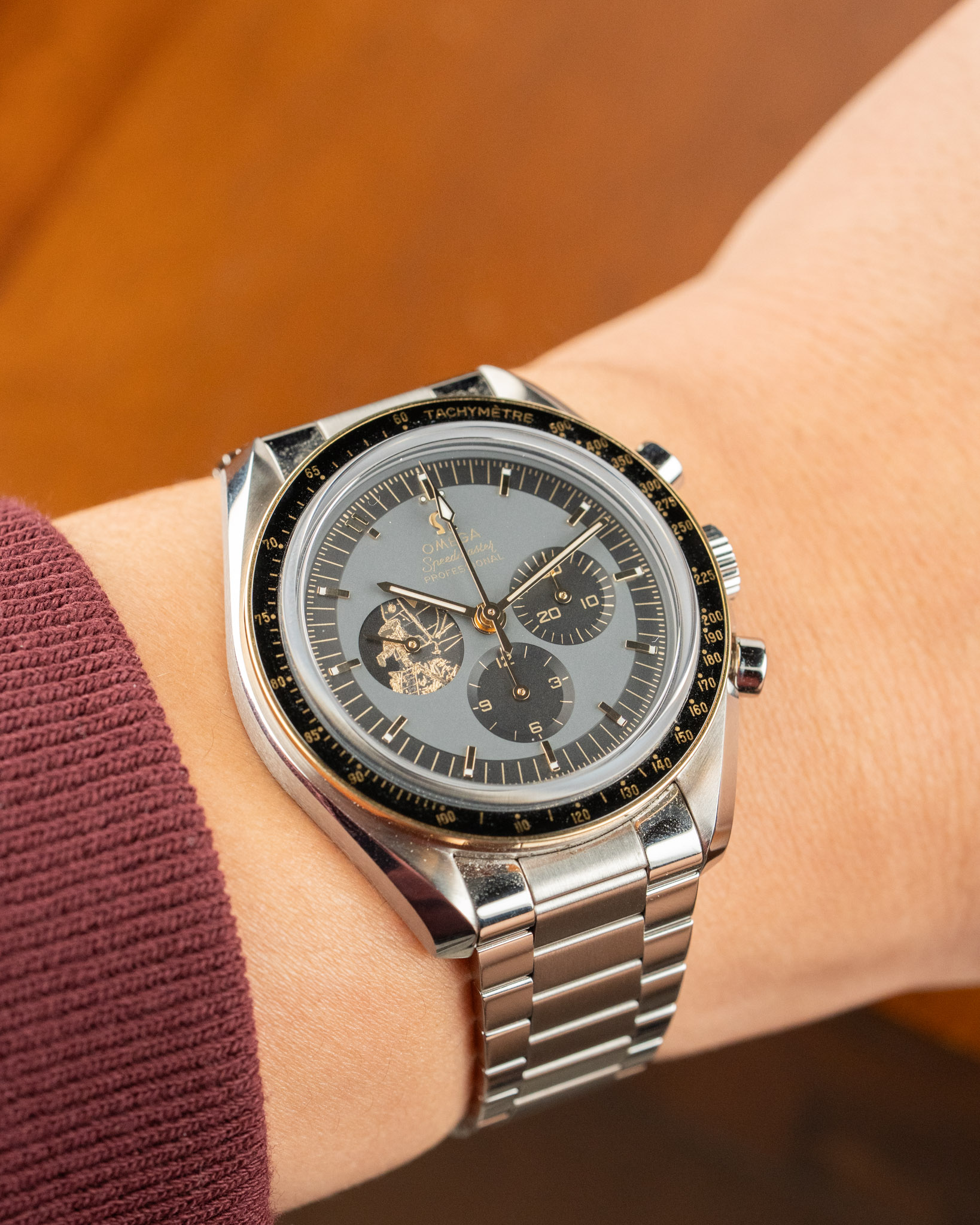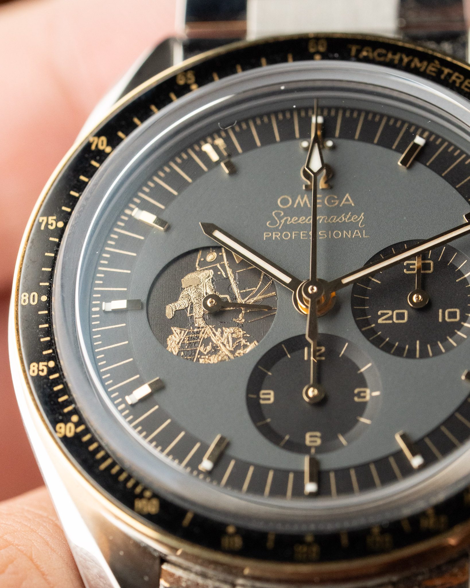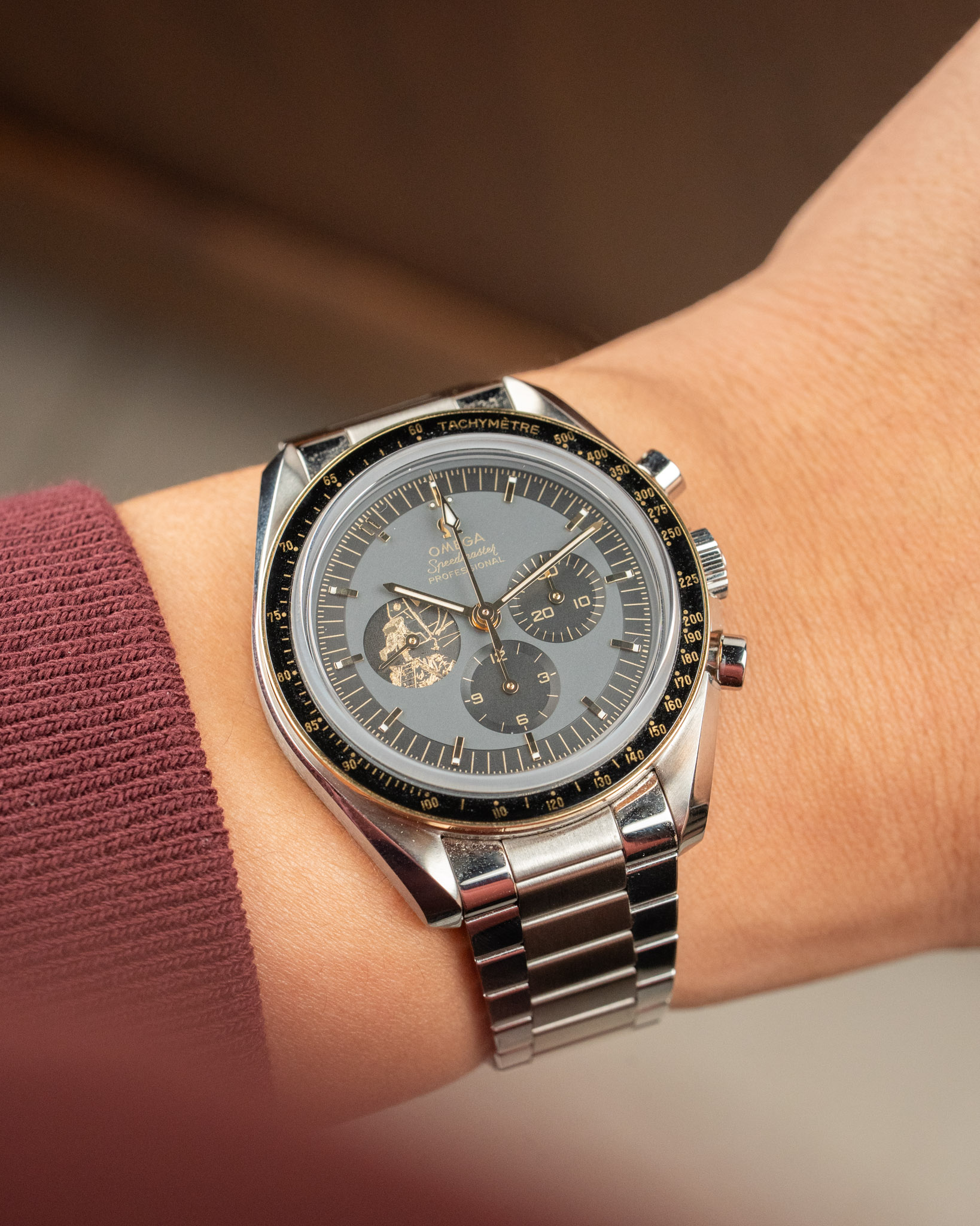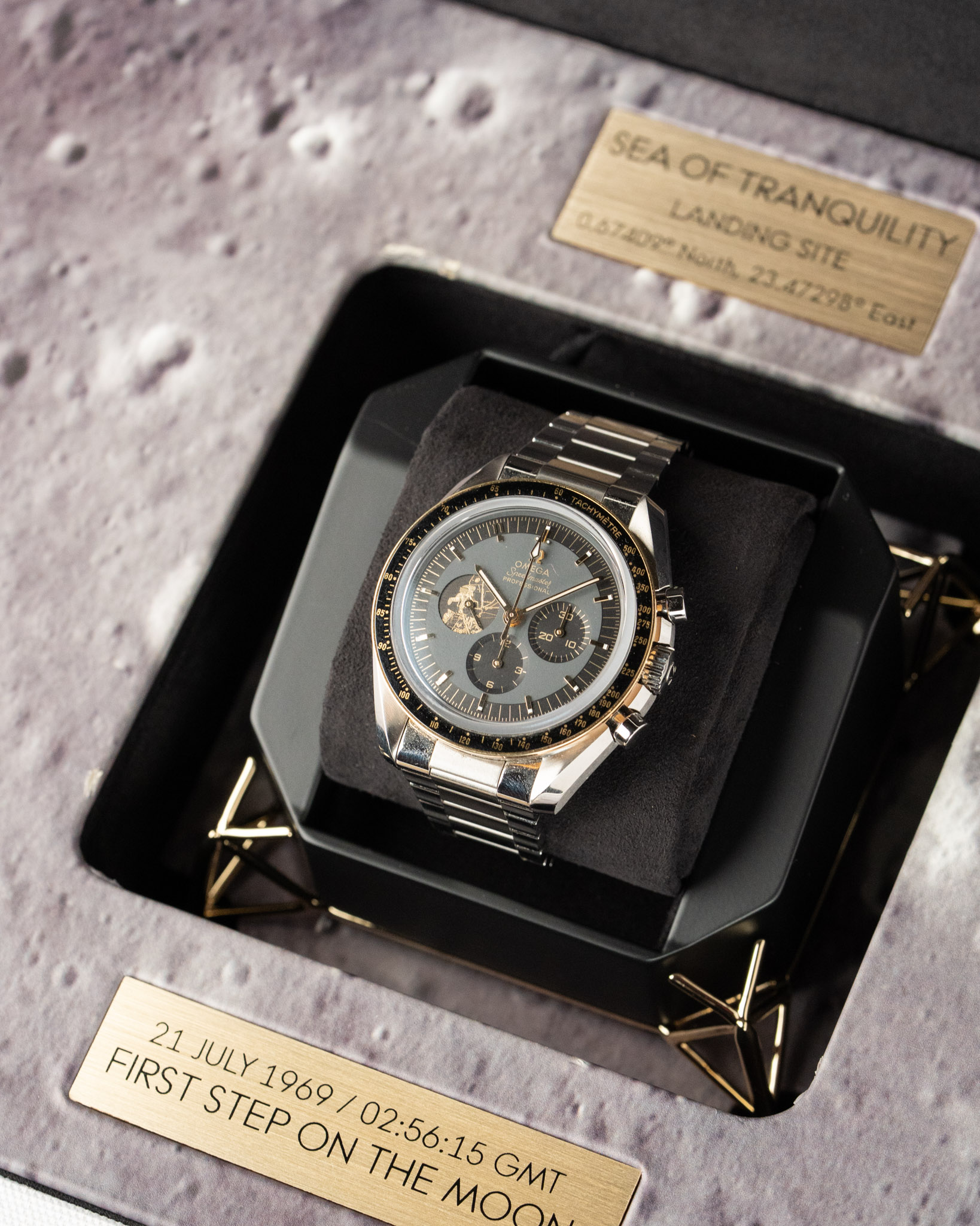 A 2020 Omega Speedmaster Apollo 11 50th Anniversary Limited Edition in stainless steel and Moonshine Gold. The 42mm case features a polished black ceramic bezel with a Ceragold tachymeter scale, surrounding a grey and black dial with Moonshine Gold accents. The distinctive 9 o’clock subdial is engraved with Buzz Aldrin’s iconic footprint on the lunar surface. A complete full set in excellent condition.
