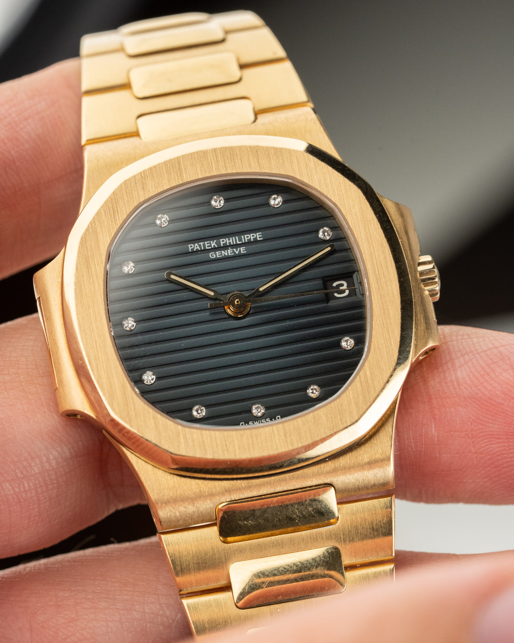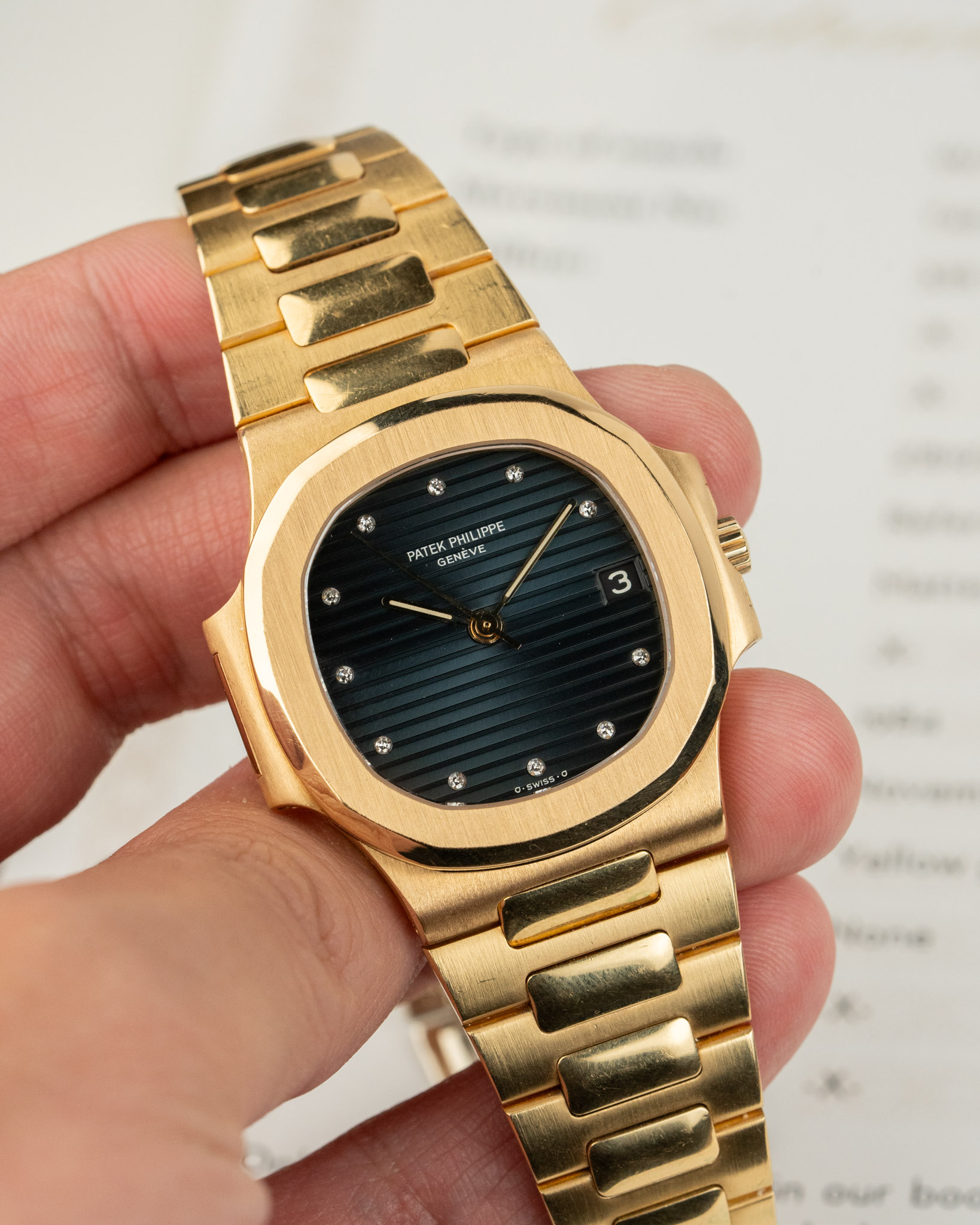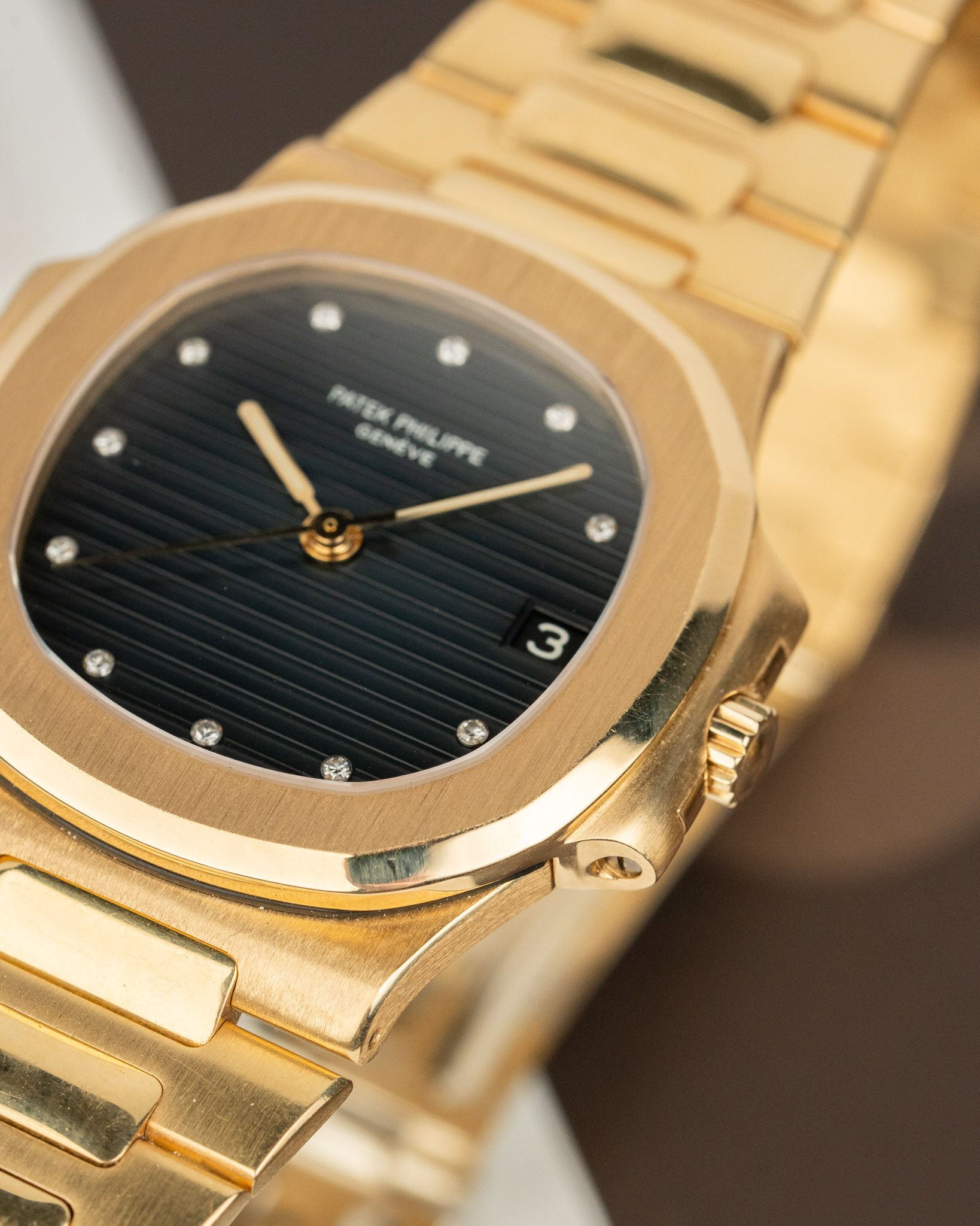 A 1984 Patek Philippe Nautilus 3800J in yellow gold featuring a diamond-set dial and early black date disc. This 37.5mm automatic watch is presented in immaculate vintage condition, with a thick case, a great case with a lot of factory finishing still prevalent. The watch comes with its Patek box and official Patek Philippe Extract from the Archives.