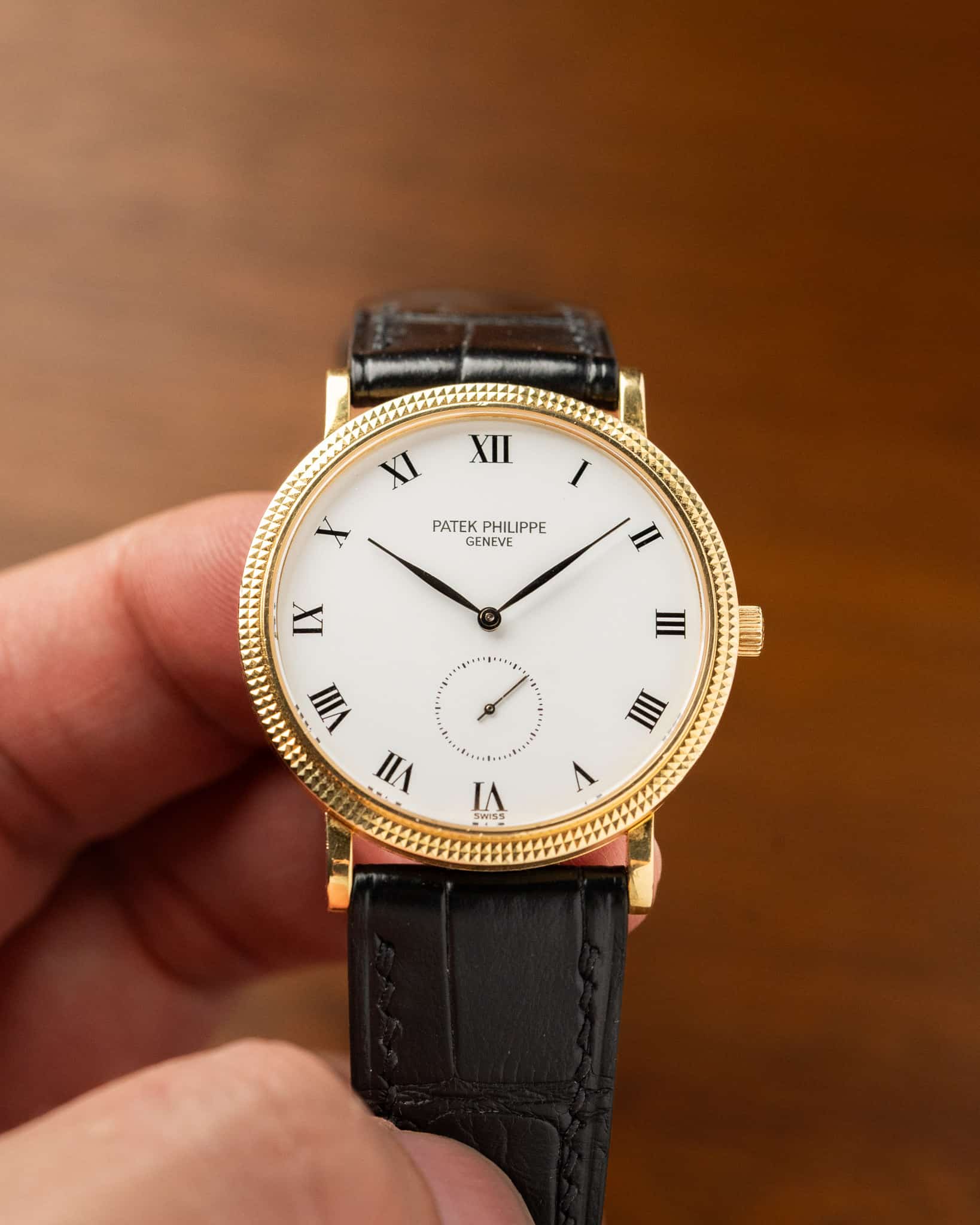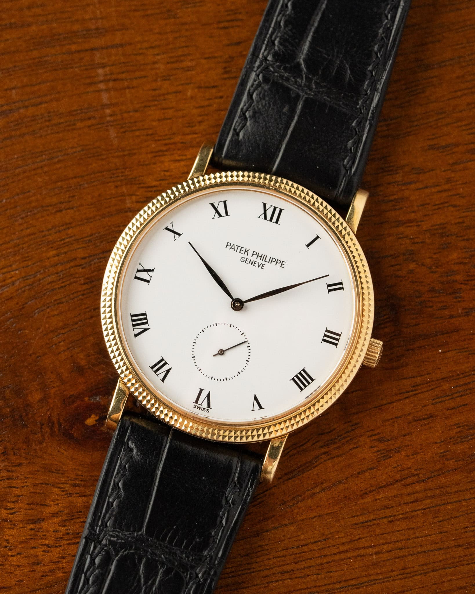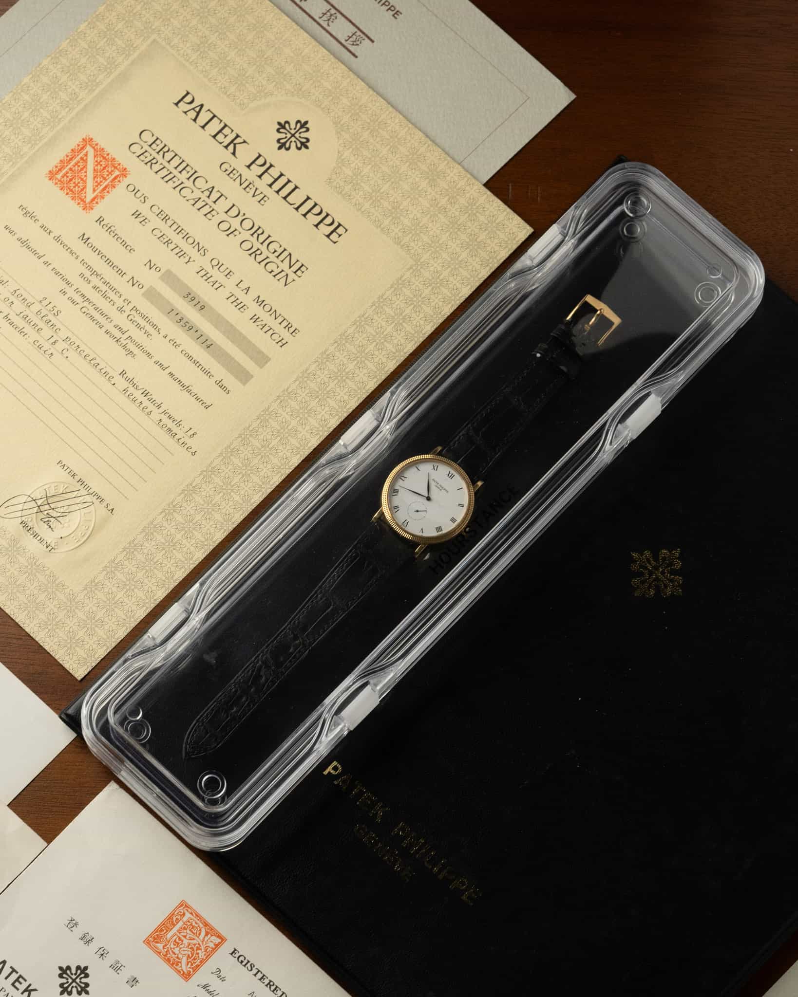 The classic Patek Philippe Calatrava 3919J in yellow gold. Features the iconic “Clous de Paris” bezel and a clean white enamel dial. Powered by a manual-wind movement and accompanied by its original papers, booklets, and buckle.