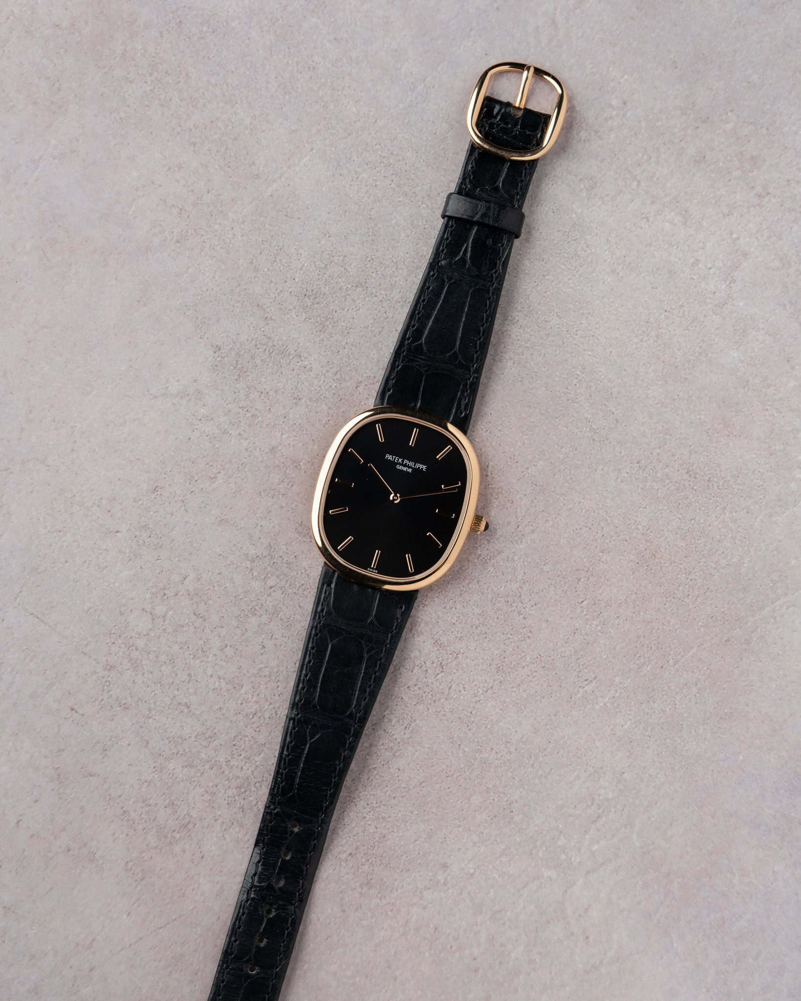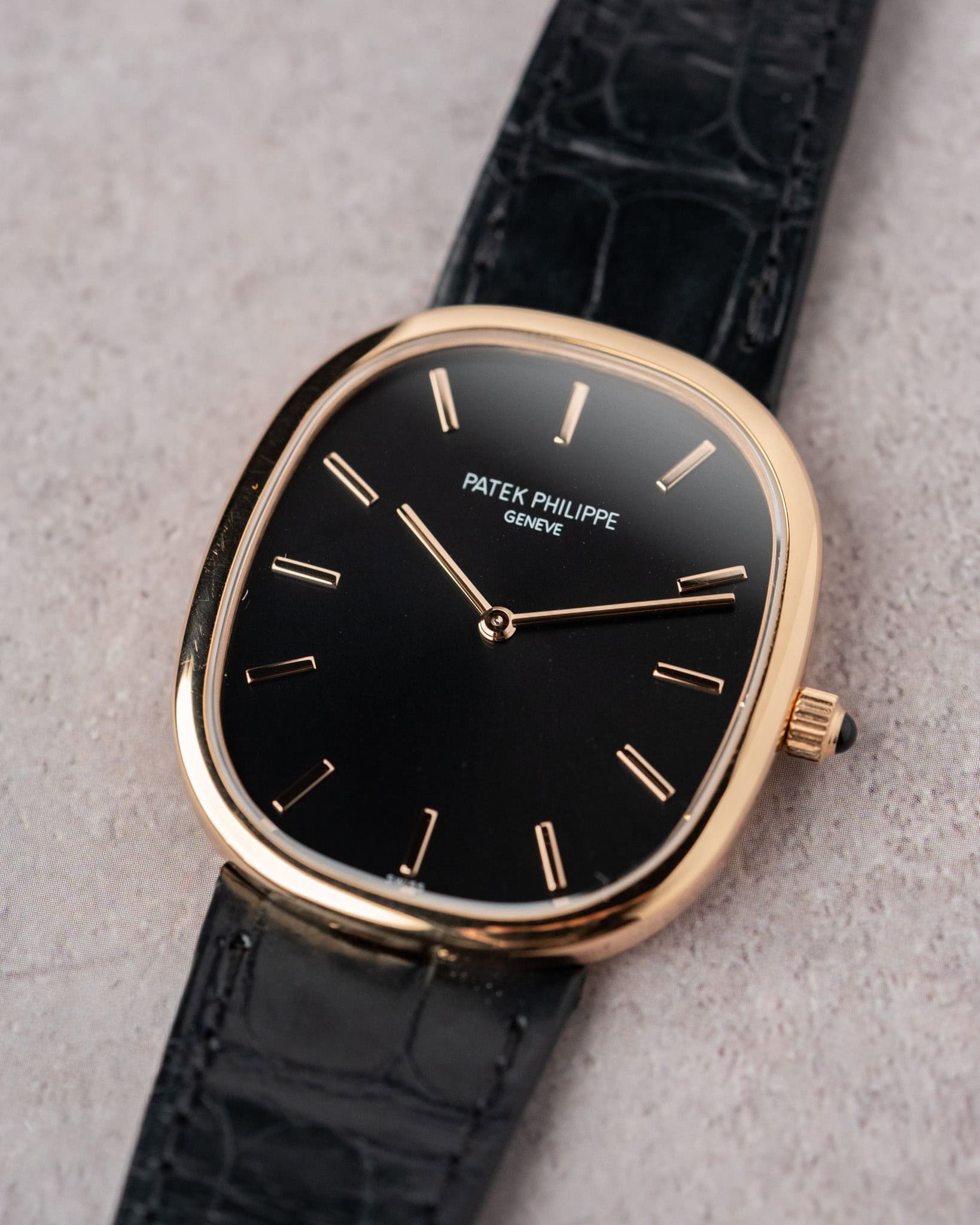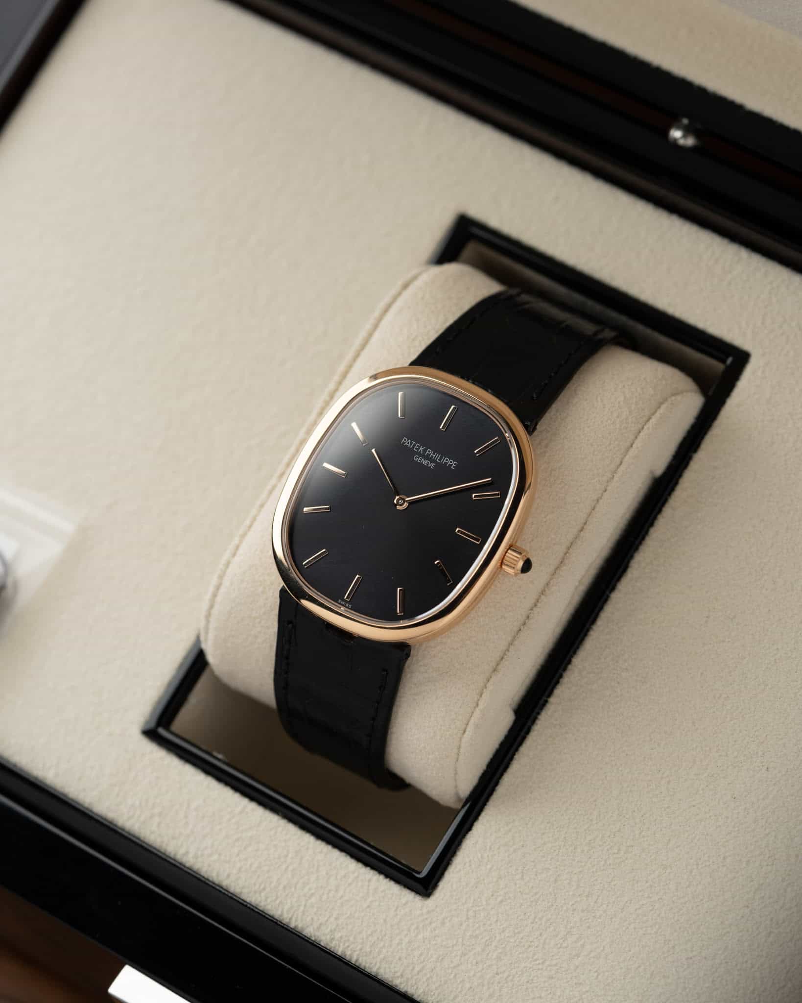 The elegant oval case houses Patek’s ultra-thin automatic Caliber 240 with micro-rotor. This watch features an ebony black sunburst dial whose applied hour markers and slender hands are in rose gold, framed by the rose gold case with perfect 1:1.618 golden ratio proportions.