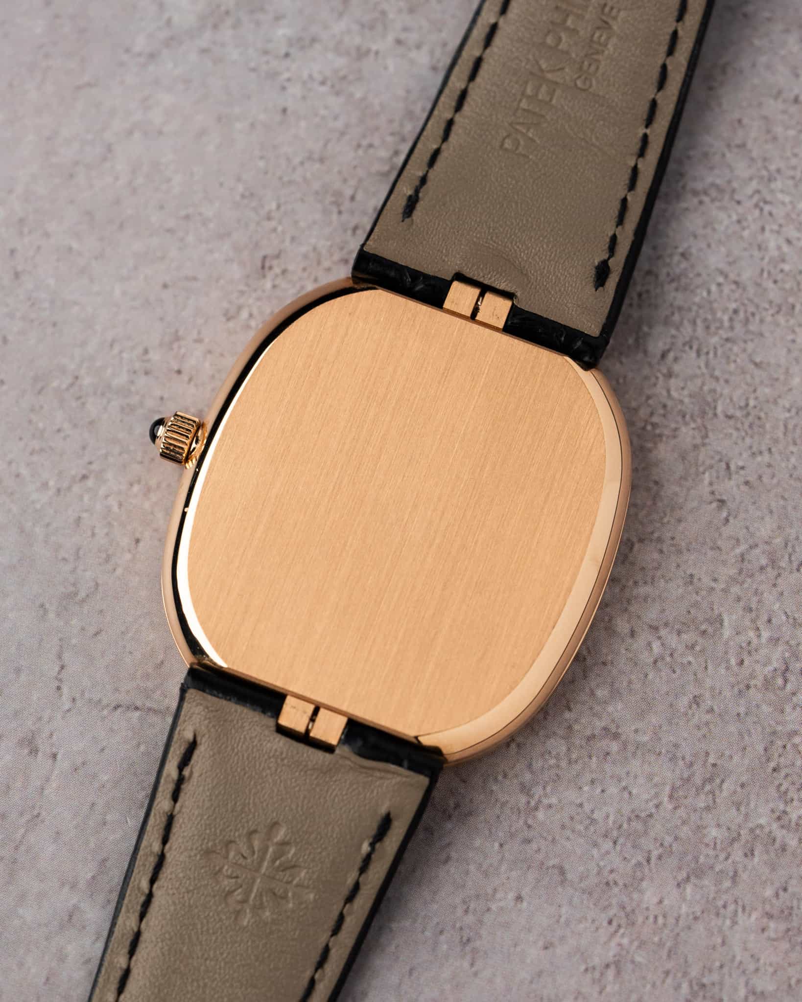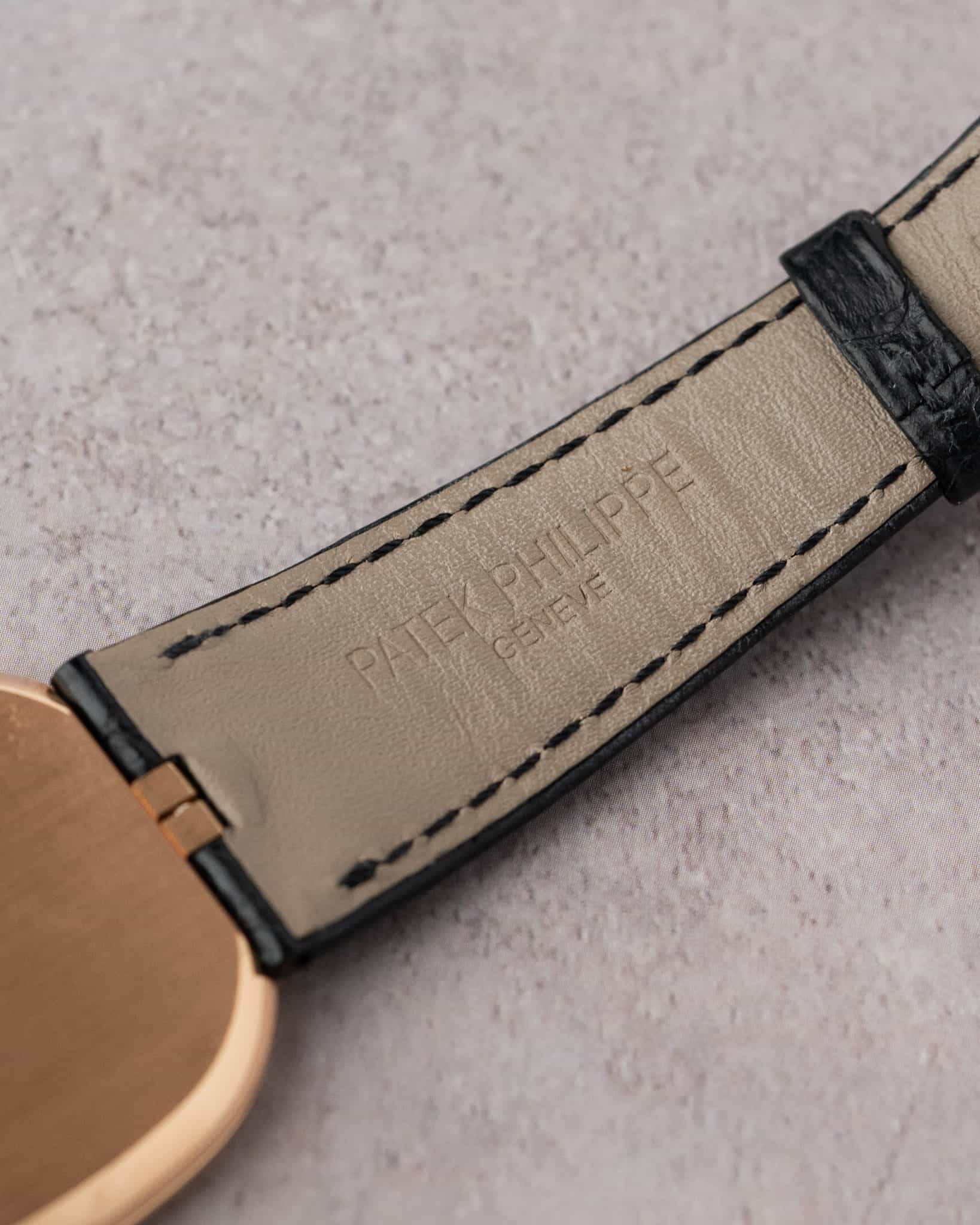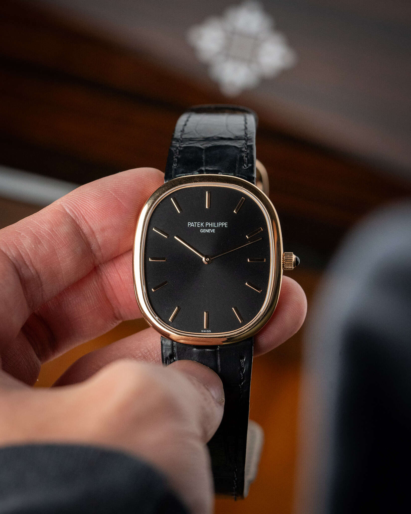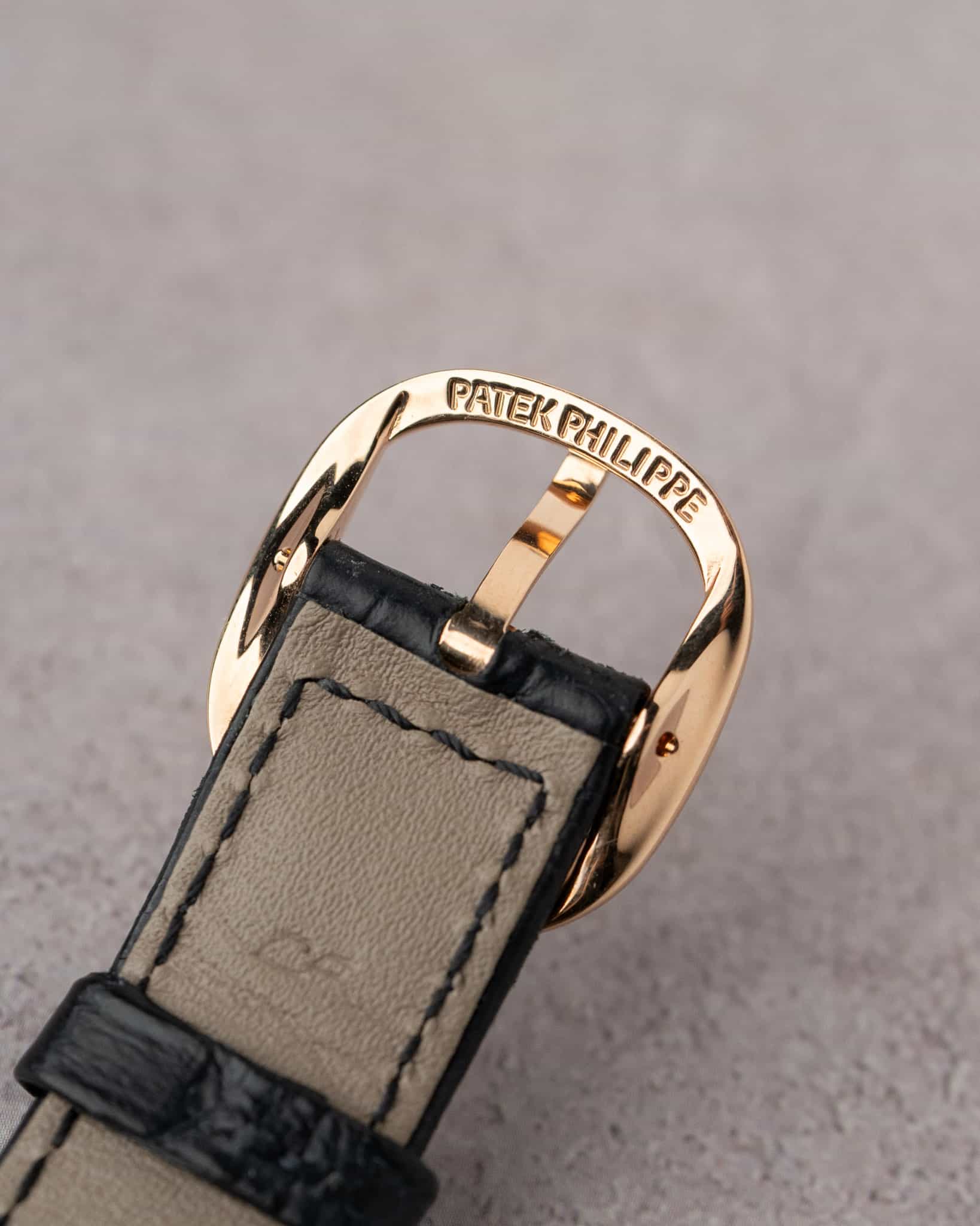 The elegant oval case houses Patek’s ultra-thin automatic Caliber 240 with micro-rotor. This watch features an ebony black sunburst dial whose applied hour markers and slender hands are in rose gold, framed by the rose gold case with perfect 1:1.618 golden ratio proportions.