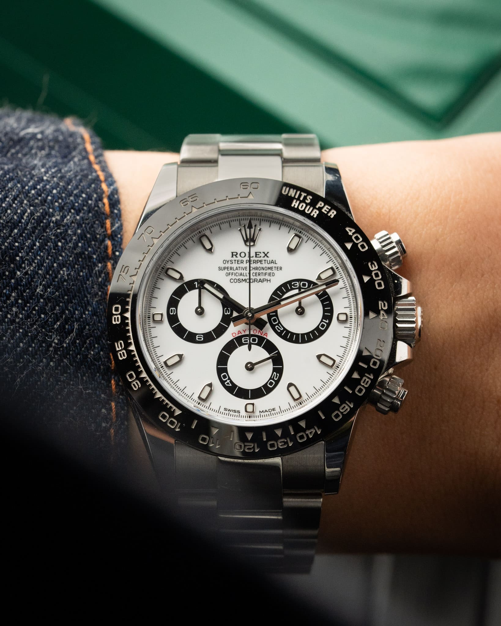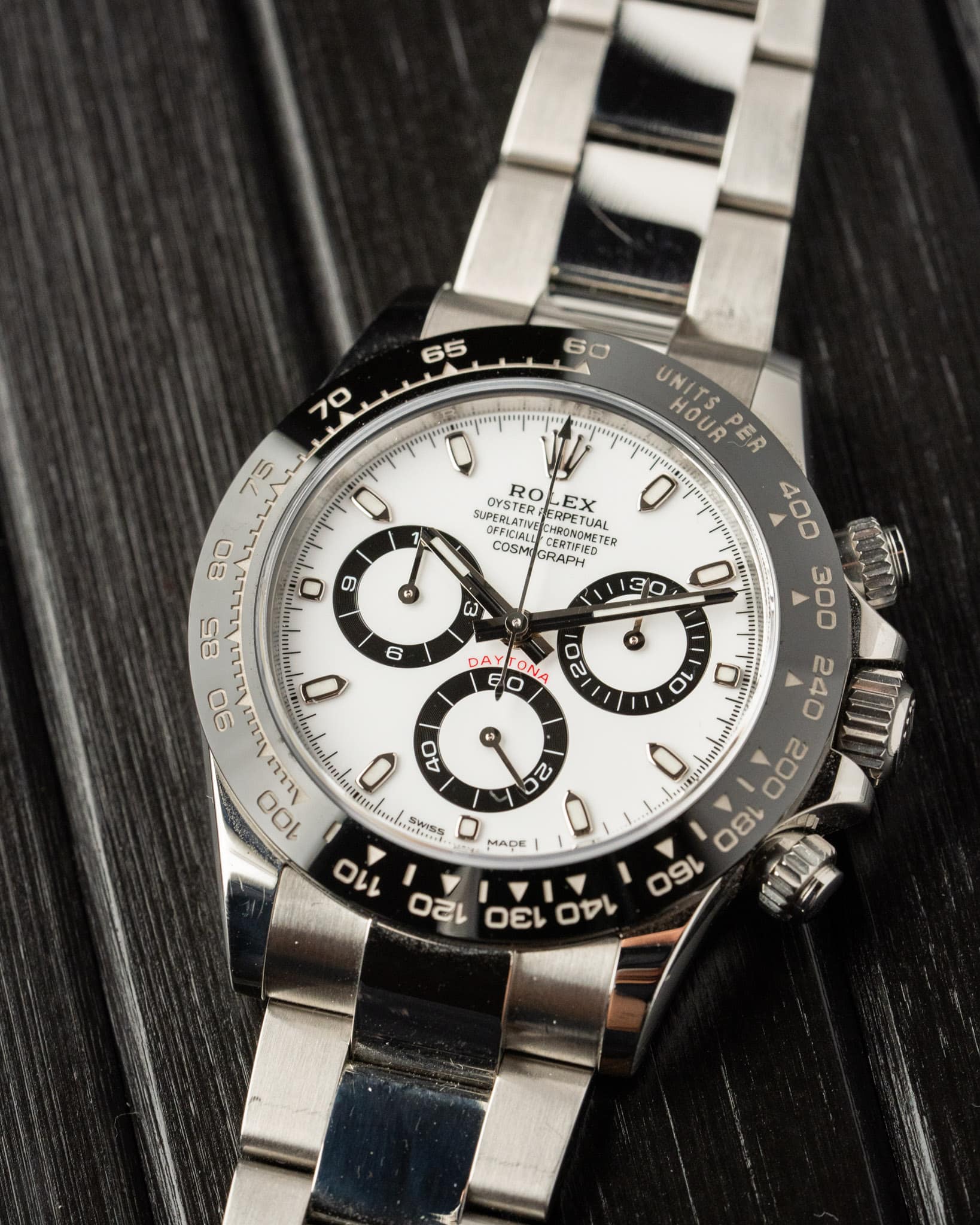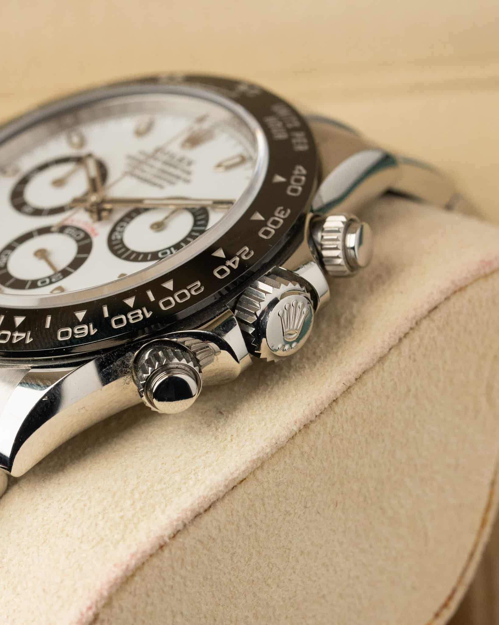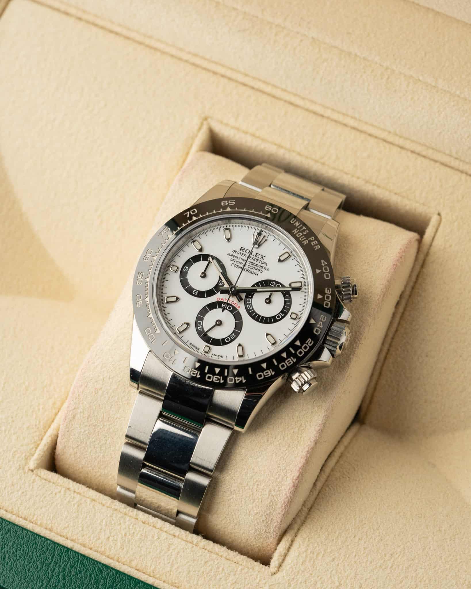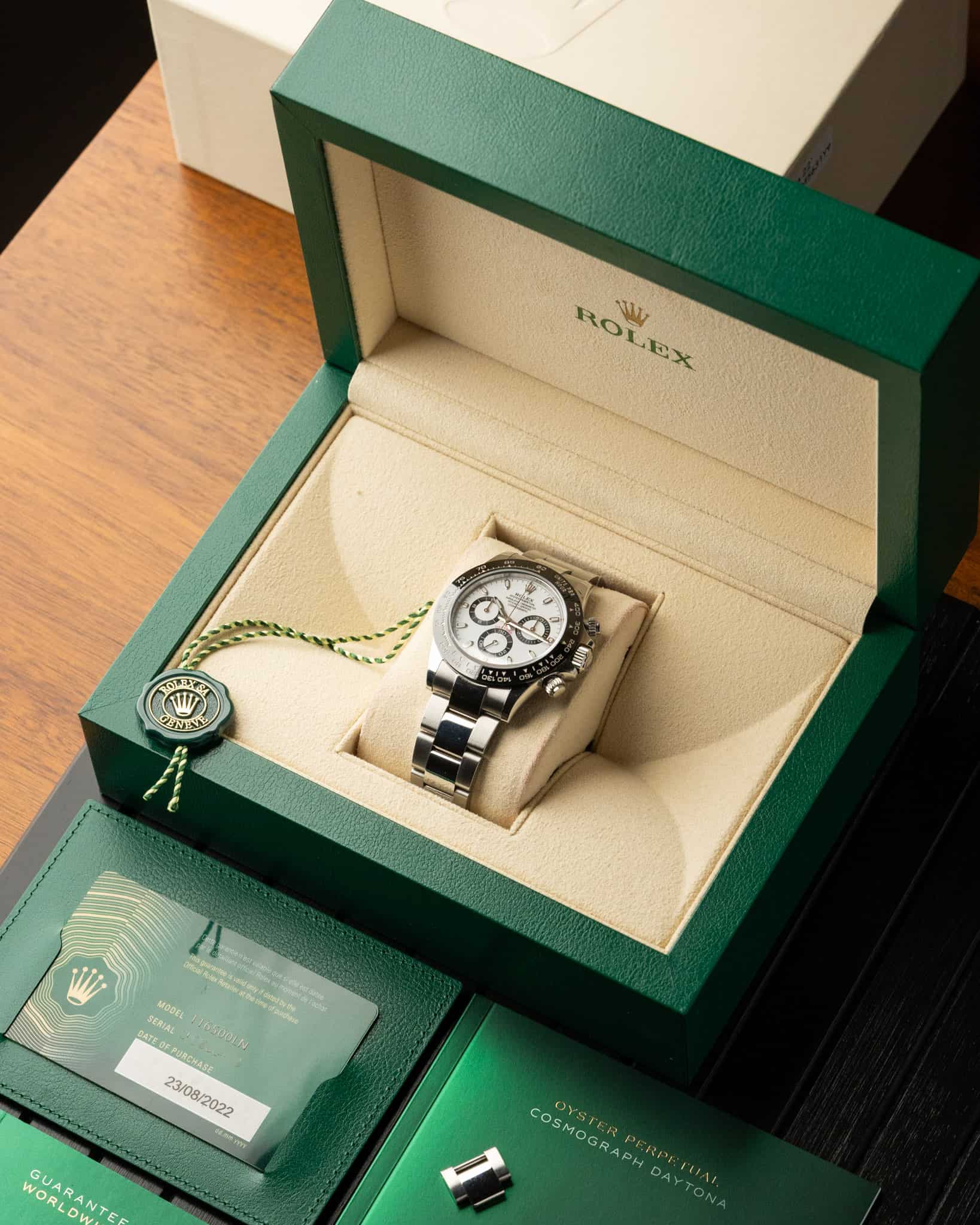 This Rolex Daytona reference 116500LN features the iconic “Panda” configuration with white dial and black subdials, housed in Rolex’s 904L Oystersteel case. The 2019-dated complete set includes all original elements: warranty card dated Aug 2022, chronometer tag, and full bracelet links.