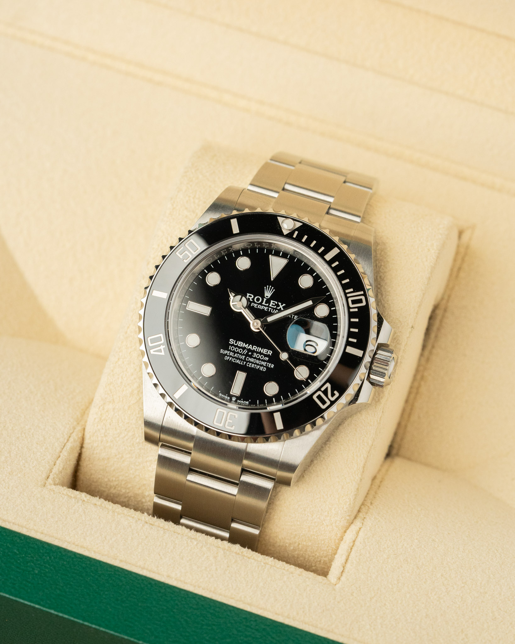 A 2023 Rolex Submariner Date with a black dial and Cerachrom bezel. This 41mm automatic dive watch is in like-new condition and is offered as a complete full set with white tag.