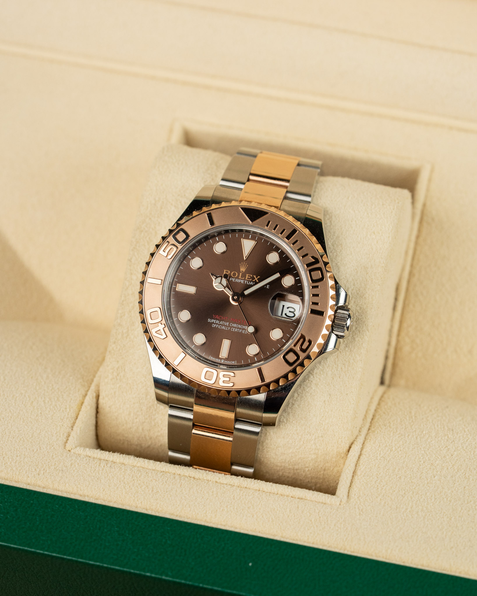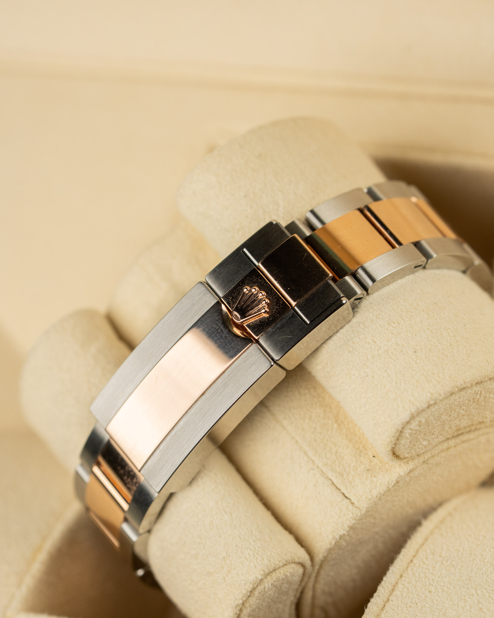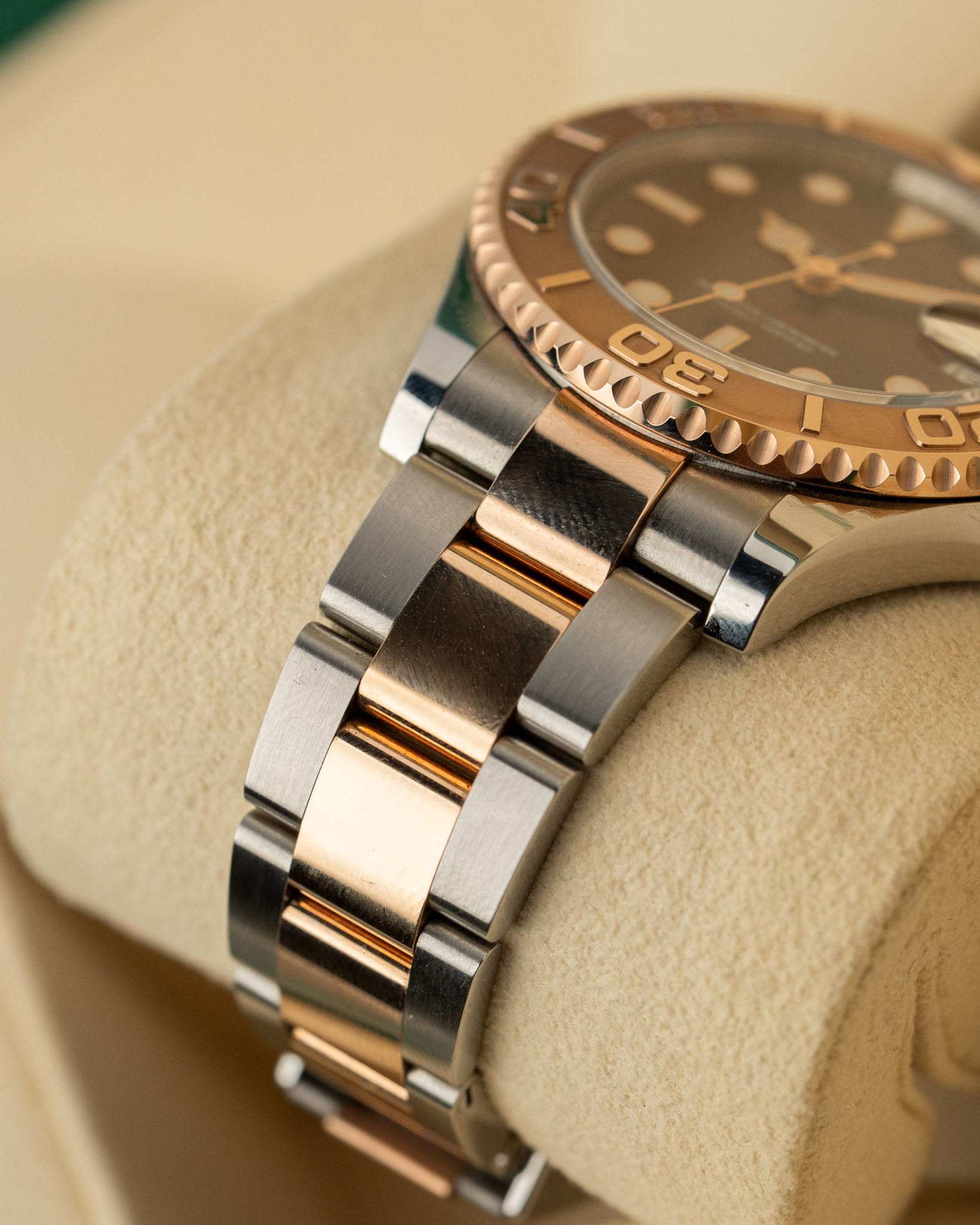 The Rolex Yacht‑Master was introduced in 1992 as a luxury sailing watch, distinct from the Submariner line. Reference 268621, produced from the late 2010s onward, combines 18k Everose gold with Oystersteel in a 37mm case. The bidirectional rotatable bezel features a raised polished numbers and a matt black Cerachrom insert. The Oyster bracelet is fitted with the Easylink comfort extension link.