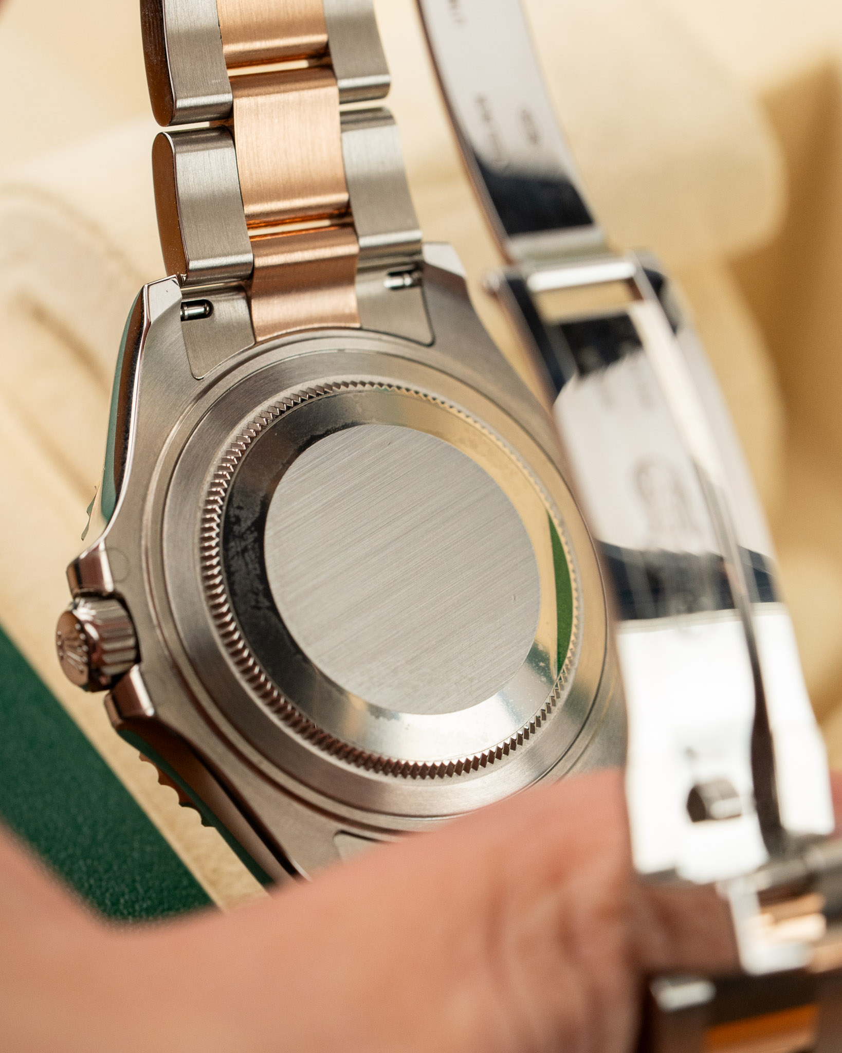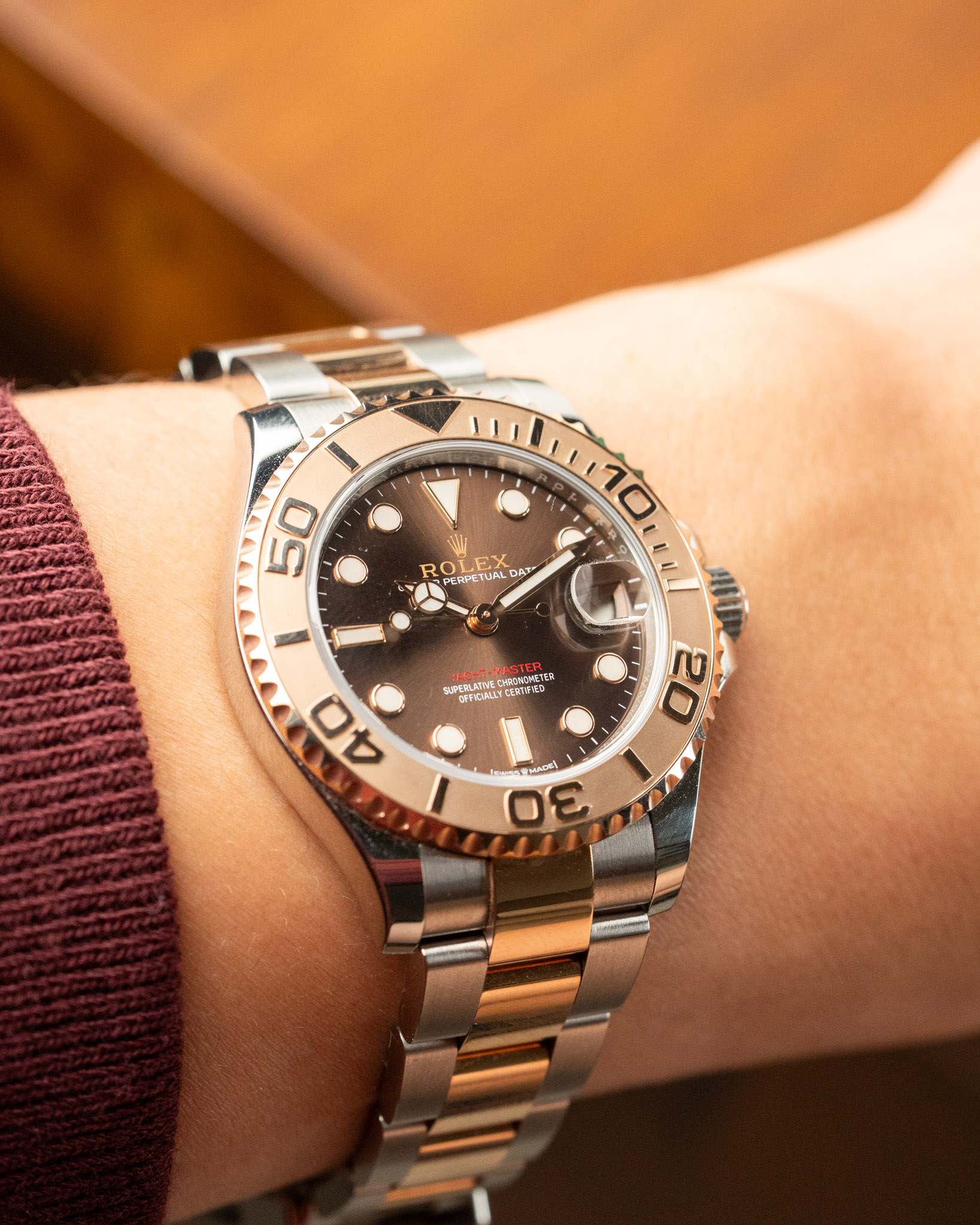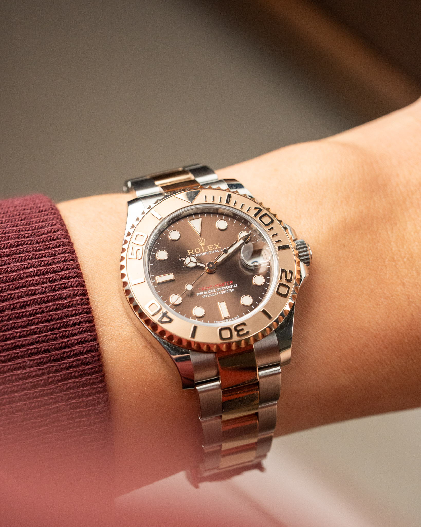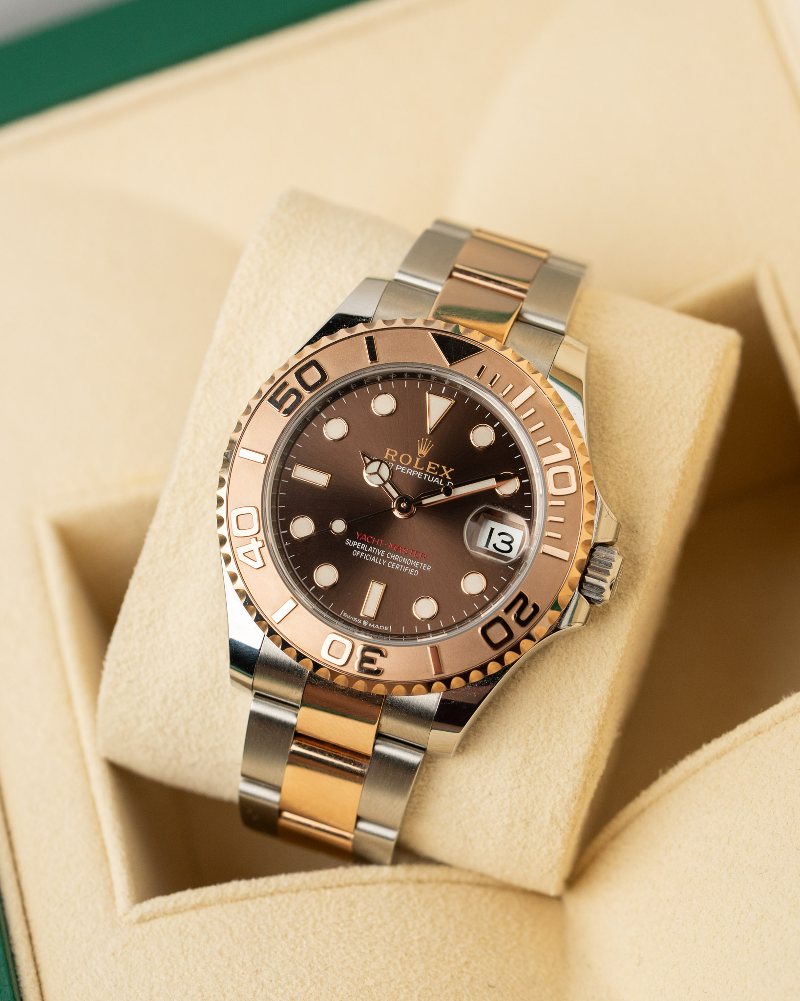 The Rolex Yacht‑Master was introduced in 1992 as a luxury sailing watch, distinct from the Submariner line. Reference 268621, produced from the late 2010s onward, combines 18k Everose gold with Oystersteel in a 37mm case. The bidirectional rotatable bezel features a raised polished numbers and a matt black Cerachrom insert. The Oyster bracelet is fitted with the Easylink comfort extension link.