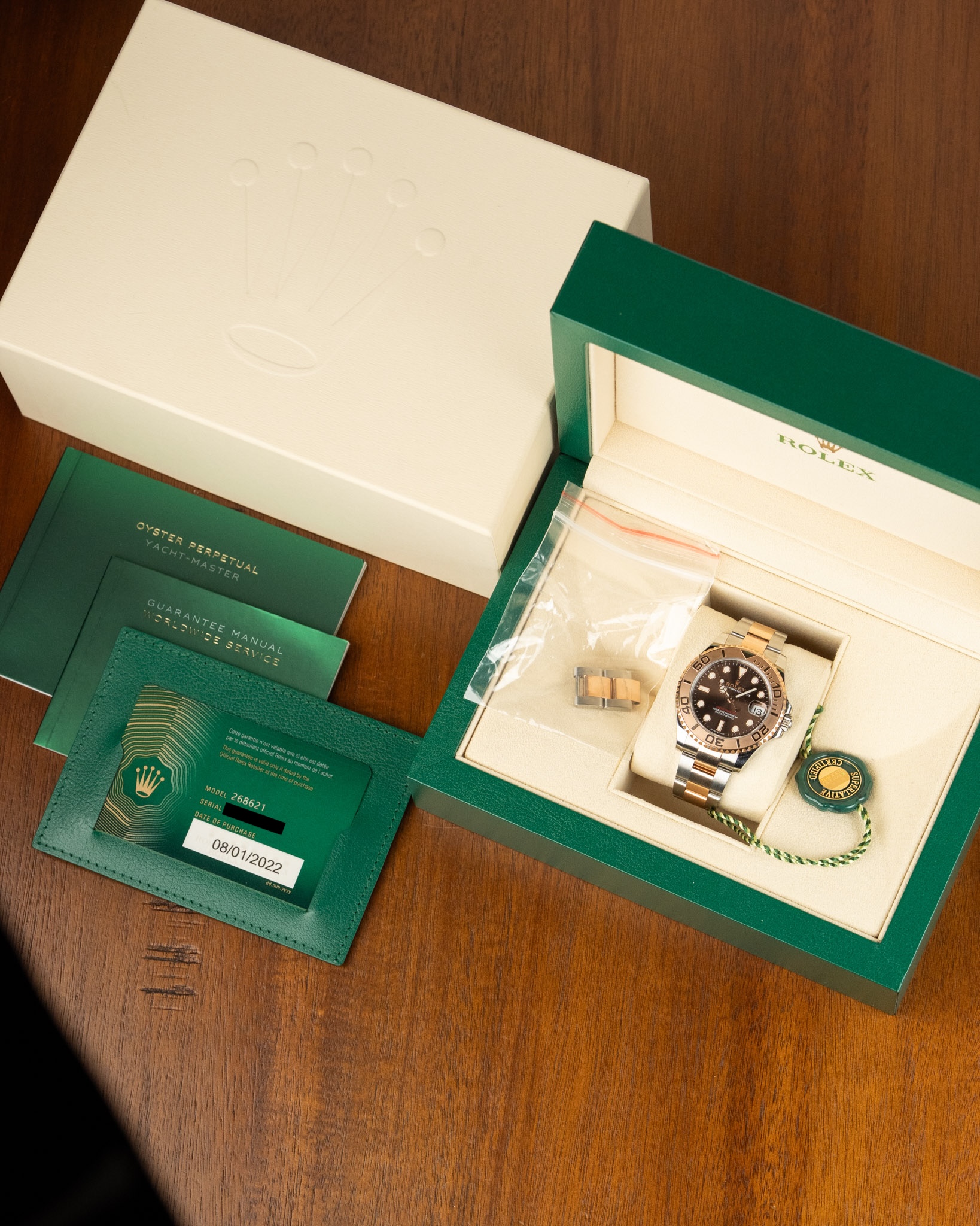 A 2022 Rolex Yacht‑Master 37mm in Everose gold and steel. The chocolate dial features luminous hour markers and a date window at 3 o’clock. This two‑tone watch is in excellent condition and offered as a complete full set with box and papers.
