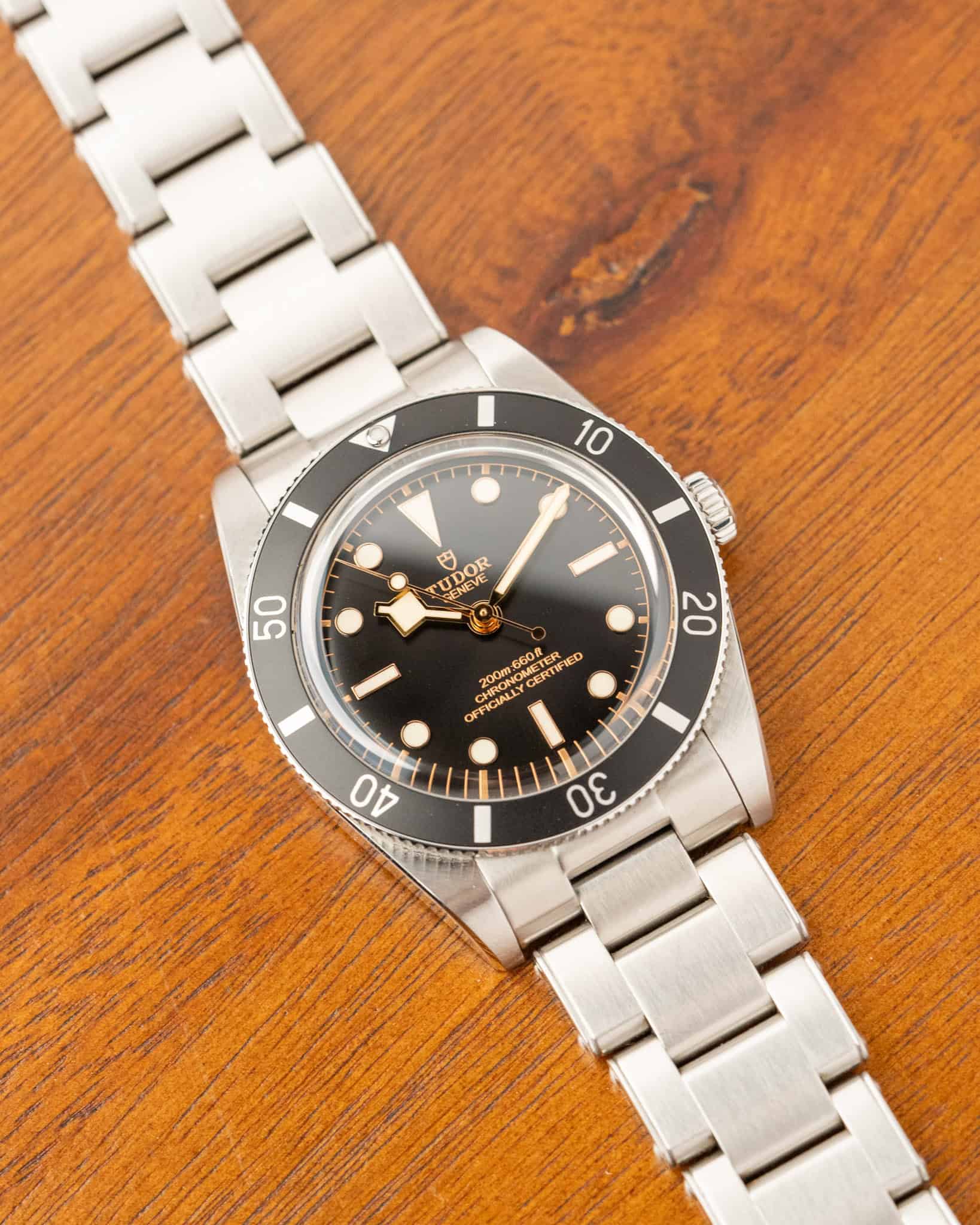 This Tudor Black Bay 54, reference M79000N-0001, is a modern re-creation of Tudor’s first dive watch from 1954, featuring perfect 37mm proportions that offer exceptional wearability. The satin-finished stainless steel case houses Tudor’s in-house automatic Calibre MT5400, a COSC-certified chronometer with a 70-hour power reserve.