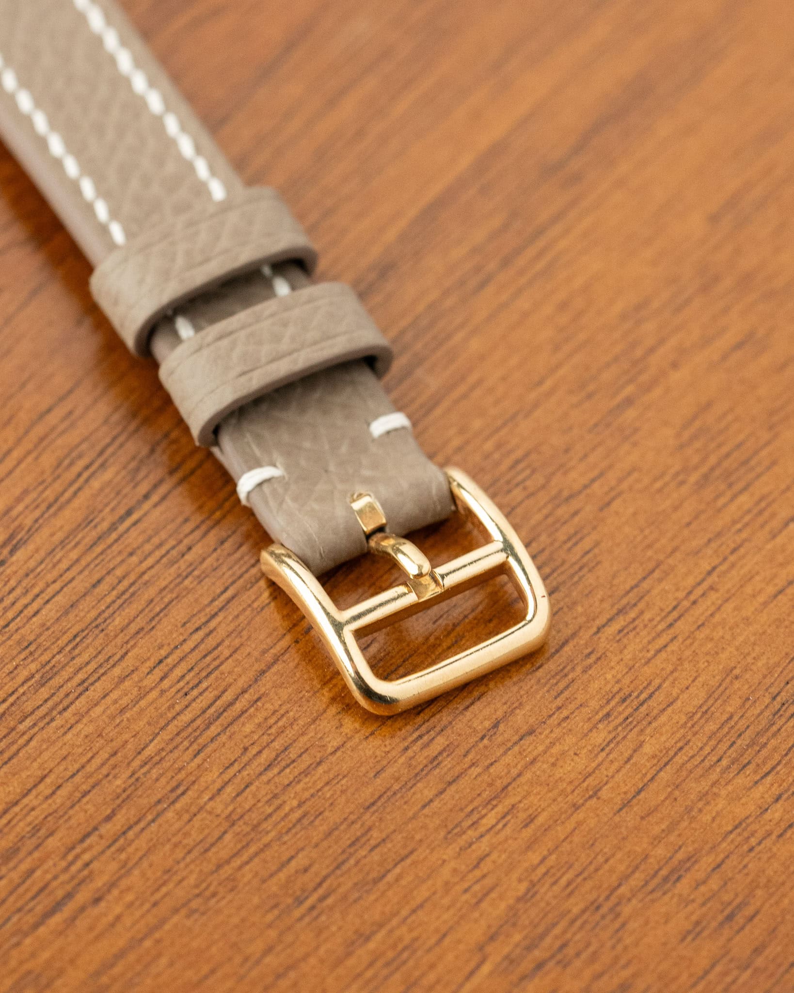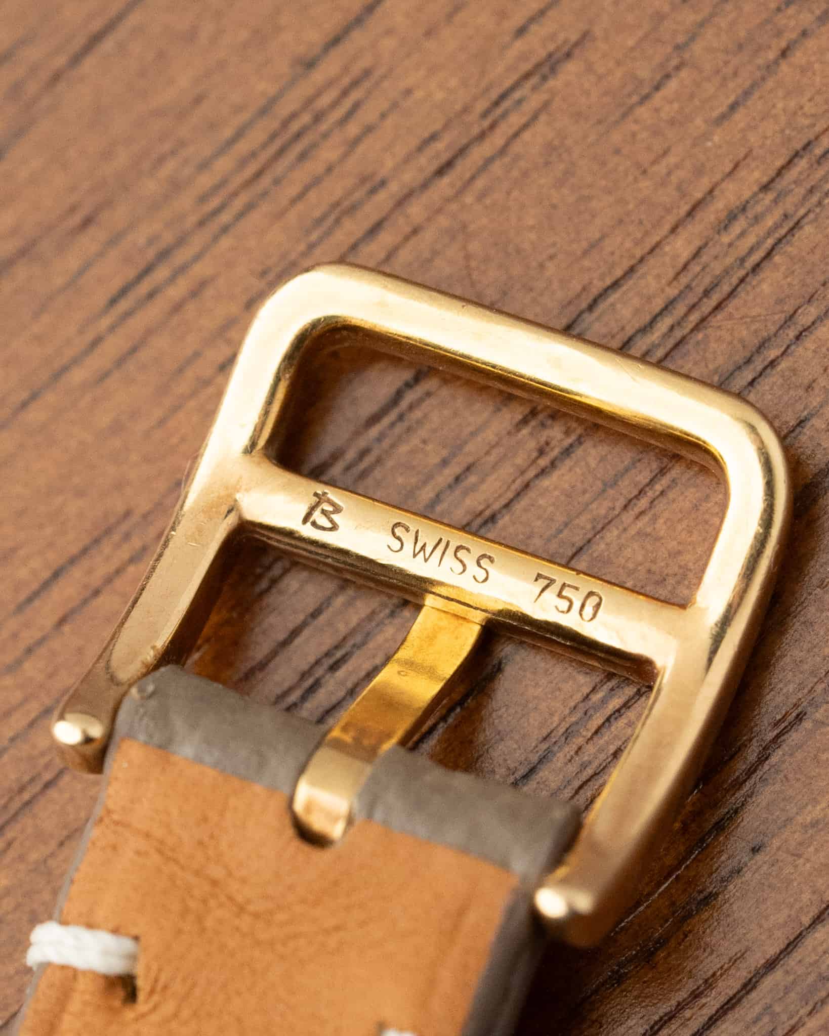Paired with a lovely Taupe Leather strap from Artisan Straps, the watch includes it original gold buckle.