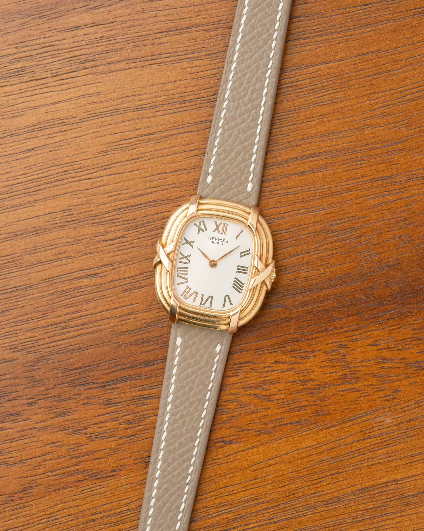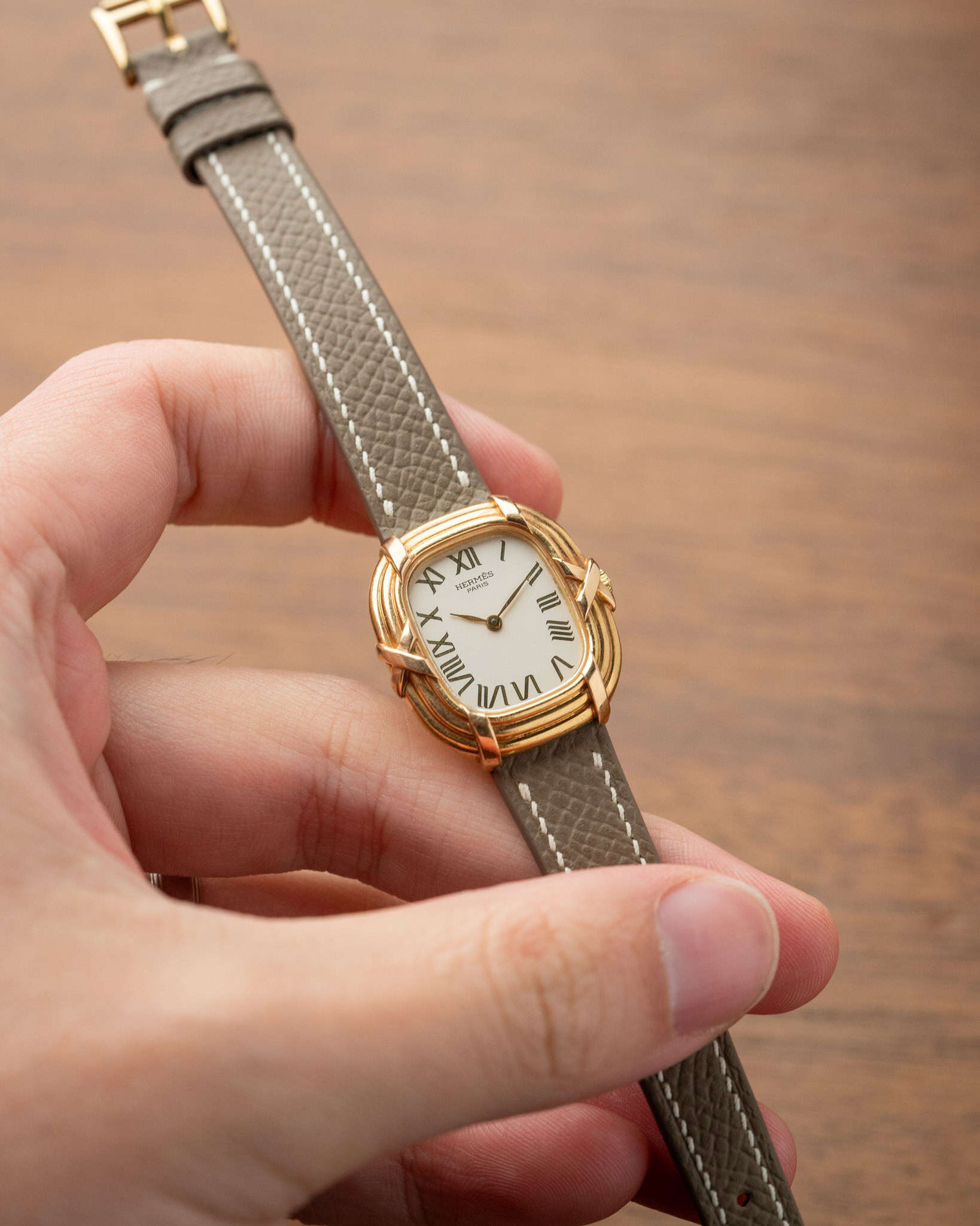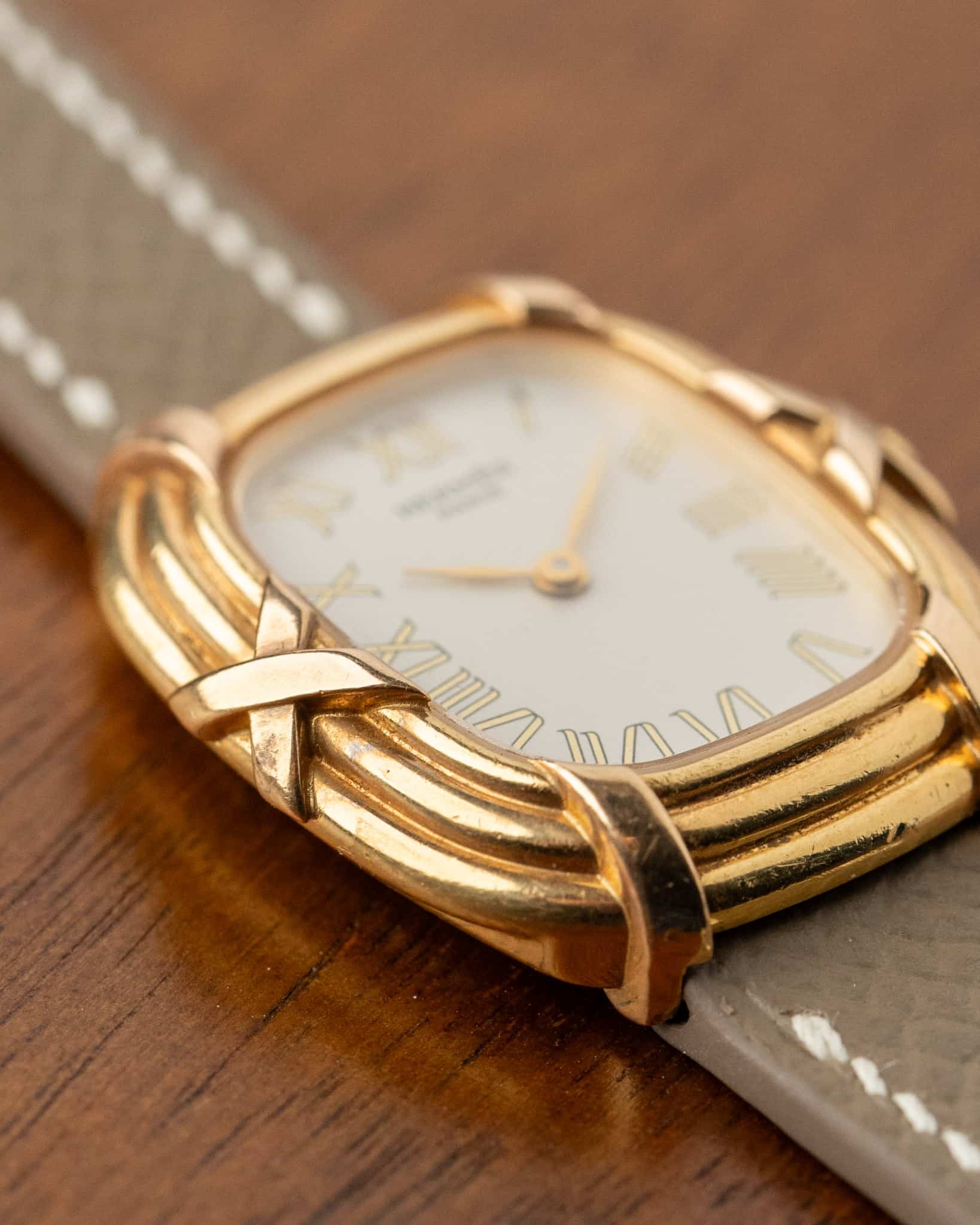 A beautiful stepped gold case from Hermes, a maison known mainly for their leather products, also made some intriguing watches, with this model shining with an art deco flair in solid 18ct Yellow Gold.