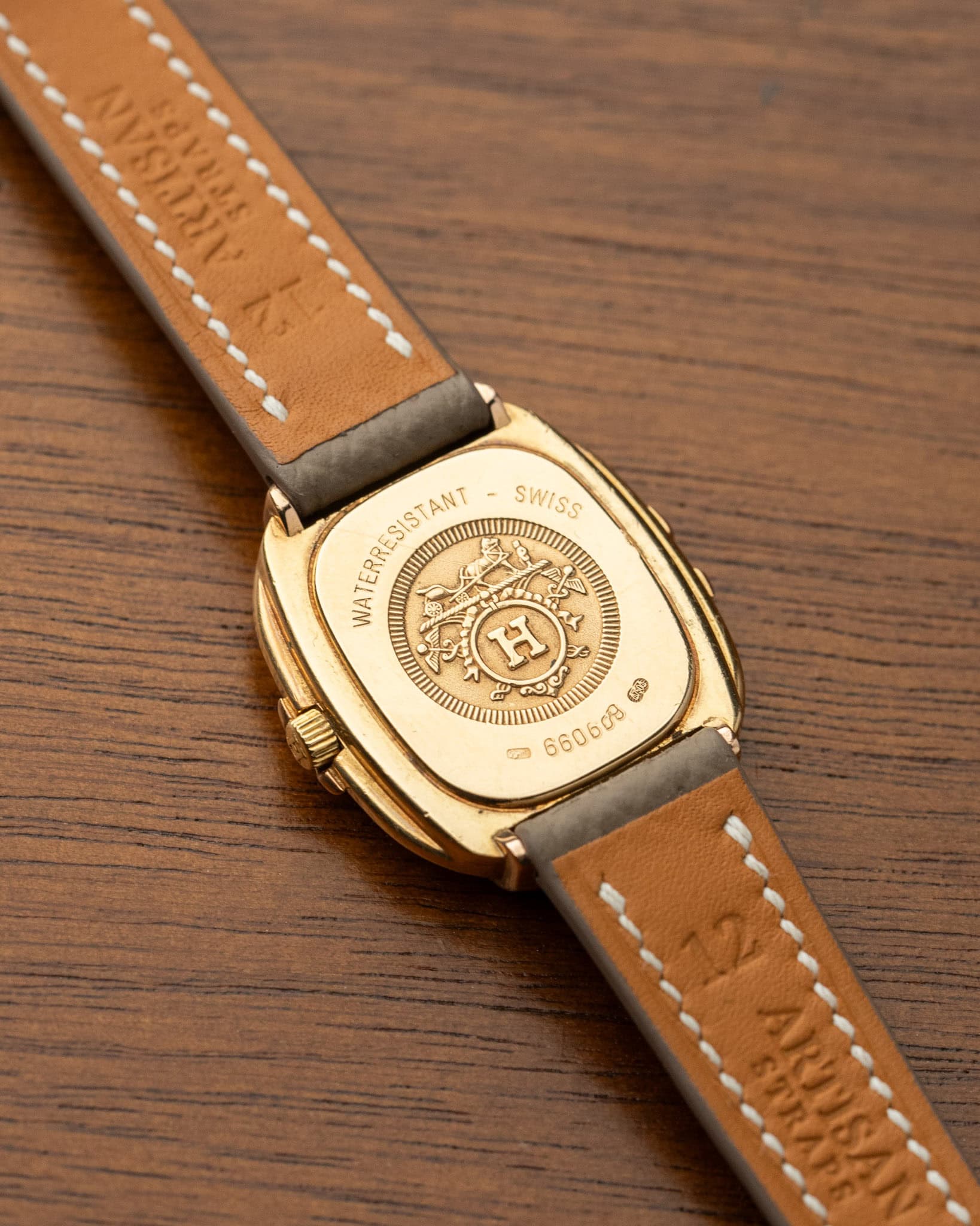 The lovely aged patina gold case matches well with its gold applied numerals and gold sword hands. The caseback showcases a motif of the maison, showcasing further artistry and craftsmanship from Hermes.